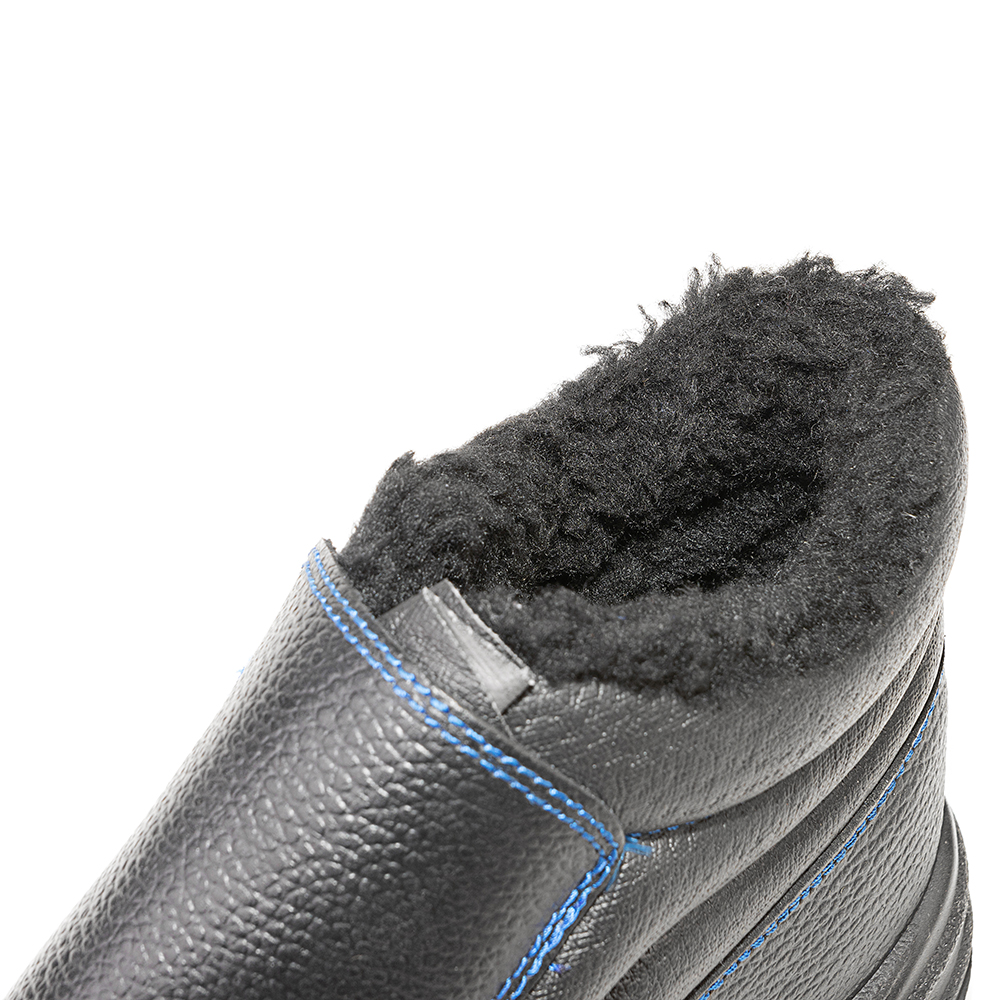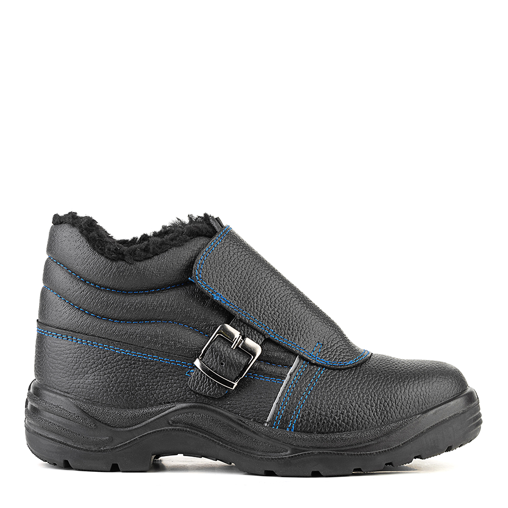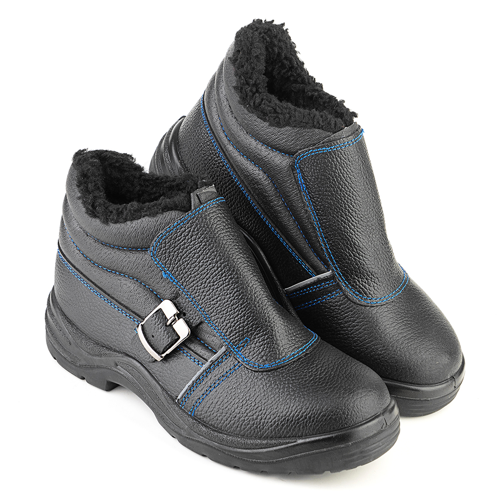 Ботинки для сварочных работ утепленные изготовлены методом литья к заготовке верха обуви промежуточного слоя подошвы из полиуретана, с ходовым слоем из резины на основе нитрильного каучука. Верх ботинок из натуральной кожи толщиной 1,8 – 2,0 мм. Подкладка ботинок из искусственного меха. В верхней части ботинок мягкий кант. Ботинки имеют защитный клапан, препятствующий попаданию искр и брызг расплавленного металла внутрь. Стелька вкладная. В носочной части внутренний защитный подносок из металла ударной прочностью 200 Дж. С боков световозвращающие элементы в виде узких полос. Rонтрастная отстрочка в тон цвета подкладки. Подошва двухслойная, МБС, ходовой слой из износостойкой, термостойкой резины на основе нитрильного каучука. Подошва выдерживает температуру 300С при контакте с нагретыми поверхностями. Есть внутренняя амортизирующая вставка в пяточной части подошвы. Глубина профиля ходового слоя подошвы 3,5 мм. Рельеф подошвы снижает риски скольжения при работе на скользких поверхностях. Цвет ботинок черный