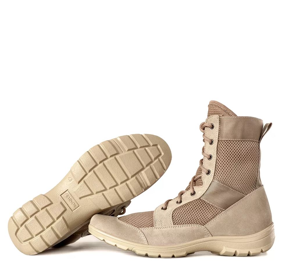 Представляем вашему вниманию, пожалуй, самый легкий в нашей линейке вариант ботинок с высокими берцами. Верх обуви выполнен в комбинации велюра и специальной дышащей сетки, которые в связке дают непревзойденный комфорт ступне в жару, что дает преимущество перед высокими берцами.