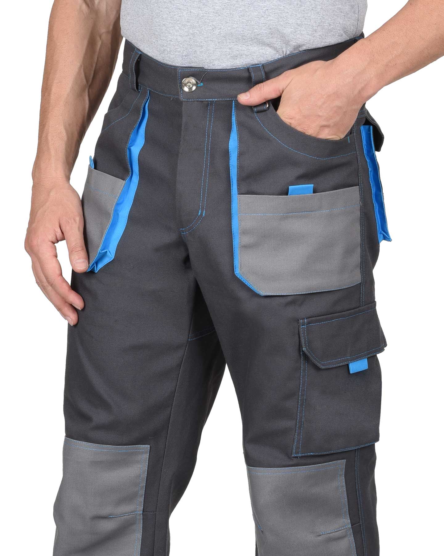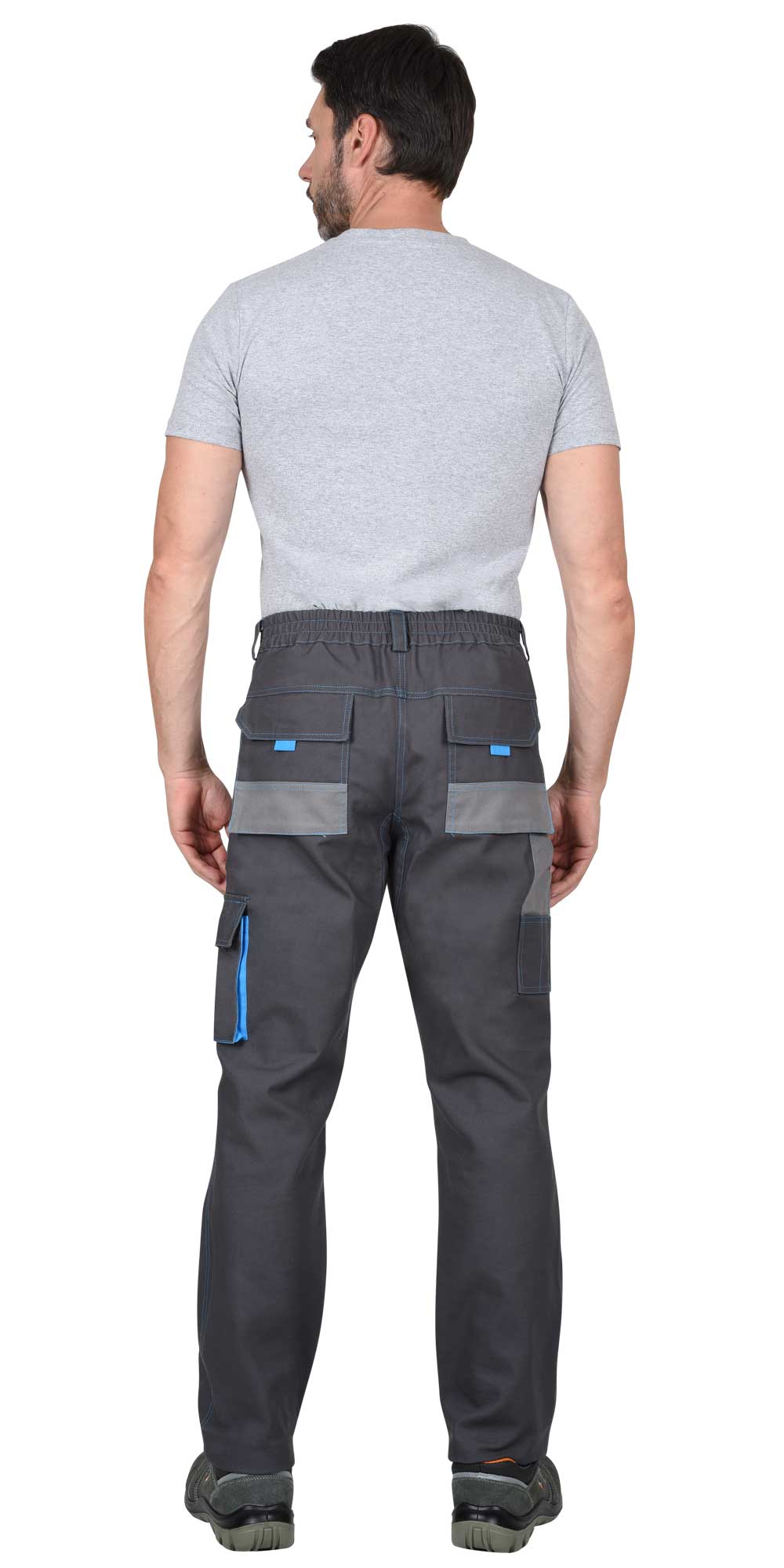 Изделие с притачным поясом, частично стянутым резинкой по бокам и различными многофункциональными карманами.