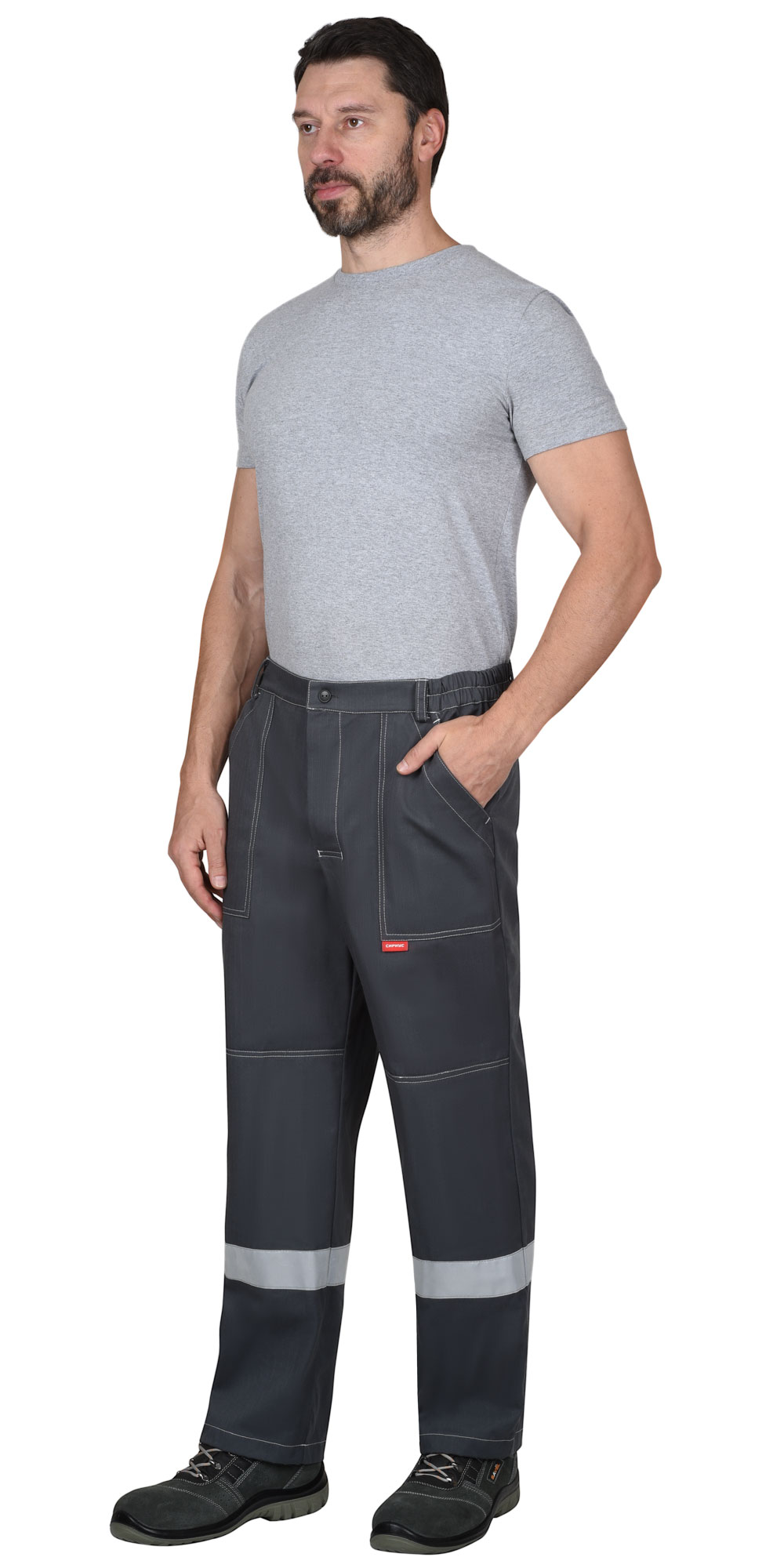 Брюки прямые, из антистатической ткани "Контакт 250А", с застёжкой гульфика на пуговицы, с притачным поясом, с частичной стяжкой по бокам на резинку, с внутренними боковыми карманами и наколенниками, с двумя задними накладными карманами и карманами для инструментов. В брюках предусмотрен СОП шириной 50 мм для обозначения сигнальной видимости.