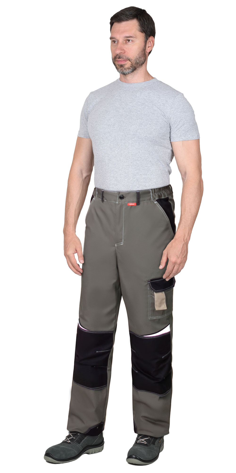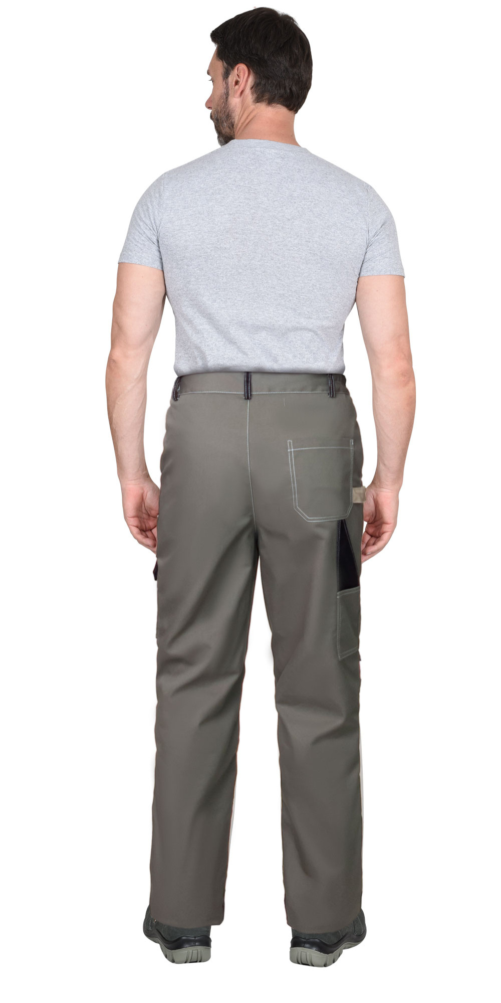 Брюки с застёжкой спереди на молнию (гульфик), с отрезным поясом, застегивается на пуговицу, с боковыми внутренними карманами на передних половинках, с накладными карманами на правой задней половинке и на левом боковом шве, с наколенниками. В брюках предусмотрены светоотражающие элементы, для обозначения сигнальной видимости.