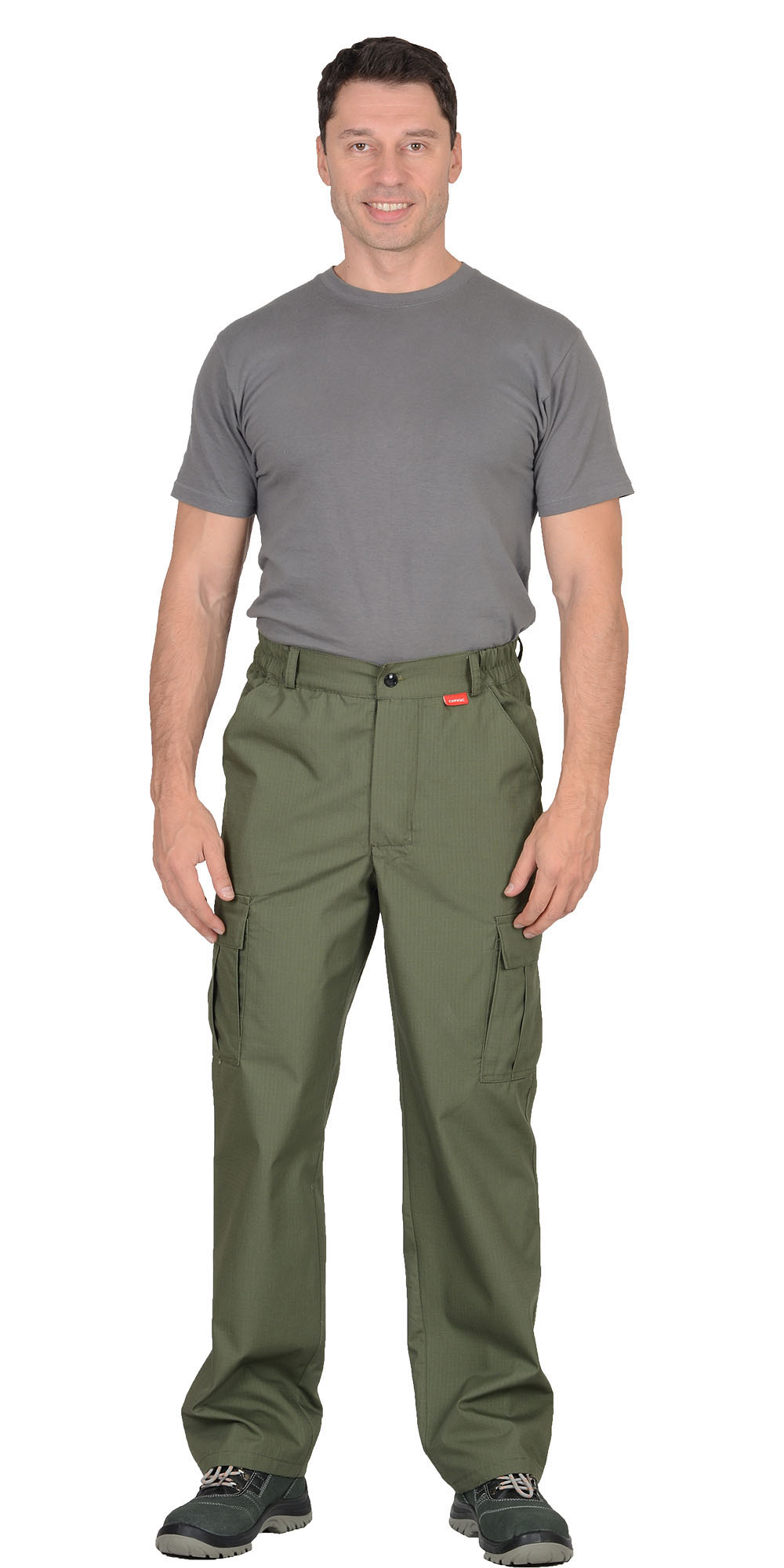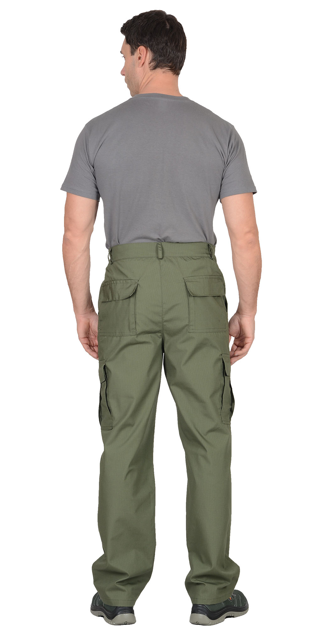 Брюки прямого силуэта; с застежкой гульфика на тесьму - «молния»; с притачным поясом, стянутым по бокам на резинку ткацкую, застегивающимся на пуговицу; на поясе 5 шлевок. Брюки с боковыми внутренними карманами, с двумя накладными полуобъемными карманами на задних половинках, и на боковых швах. тк."Рип-Стоп", ВО, 65% п/э., 35% х/б, 215 г/кв.м. ГОСТ 12.4.280-2014