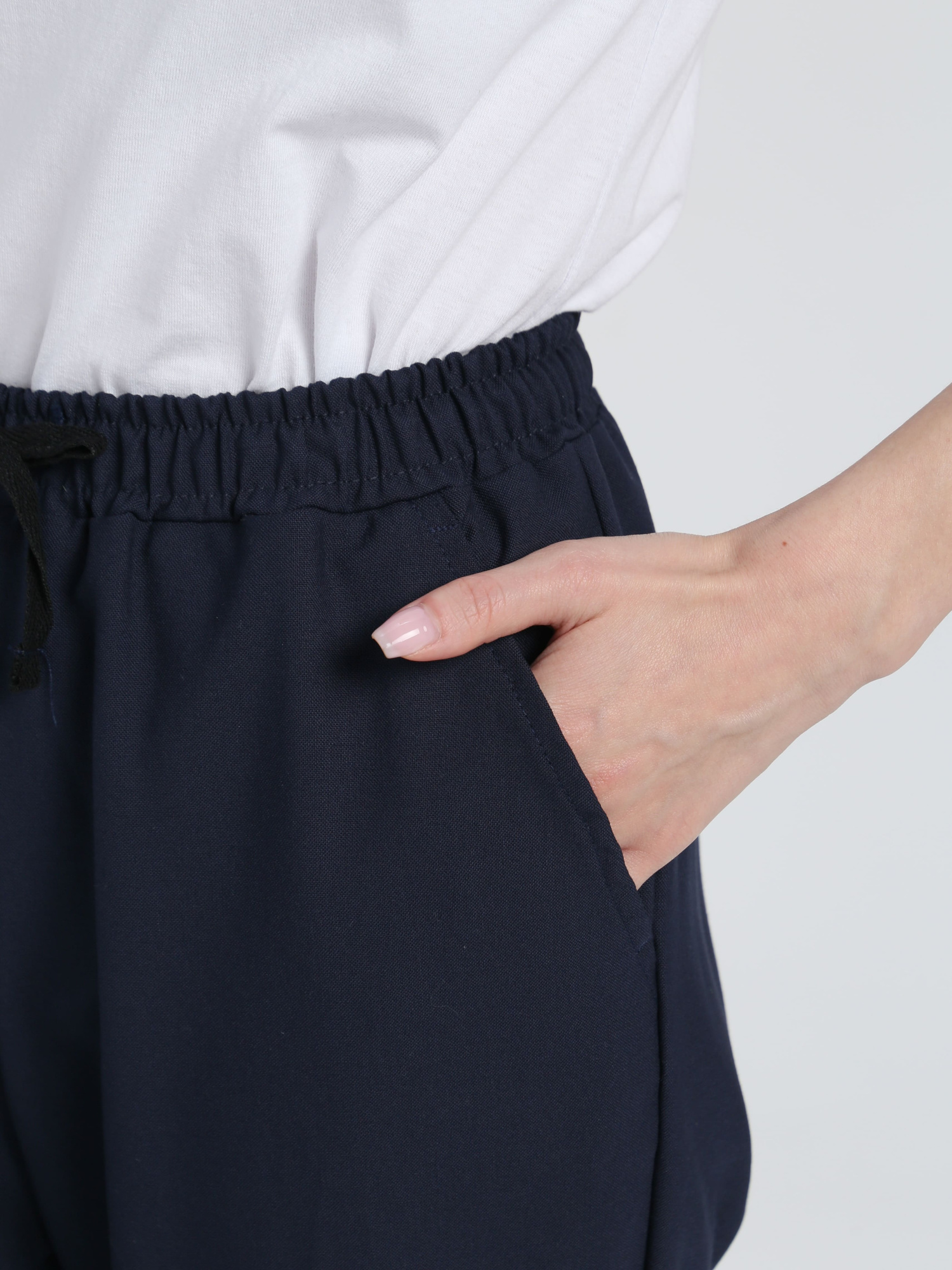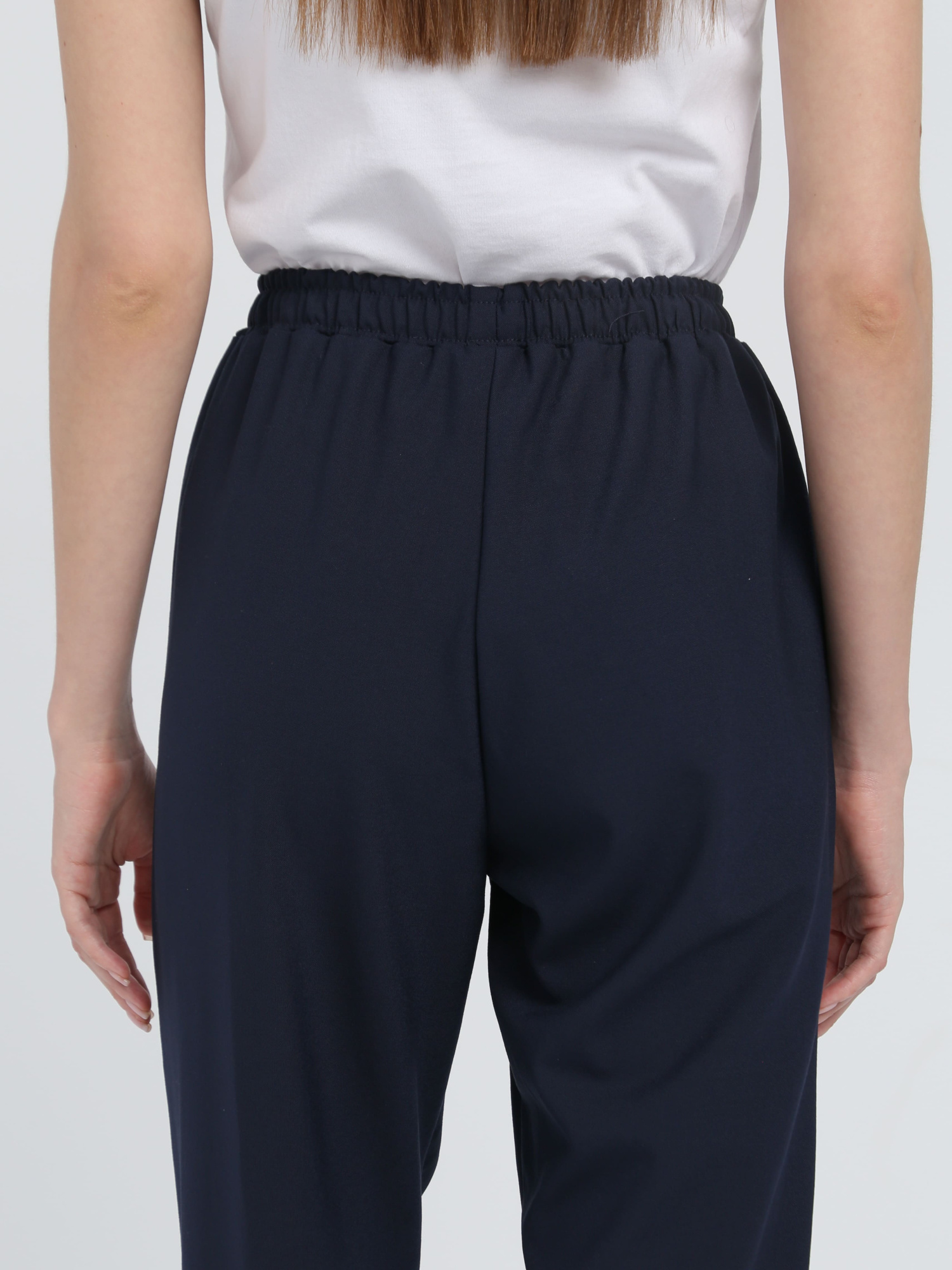 Верхний срез брюк обработан притачным поясом с эластичной тесьмой . Низ брюк обработан швом вподгибку с закрытым срезом