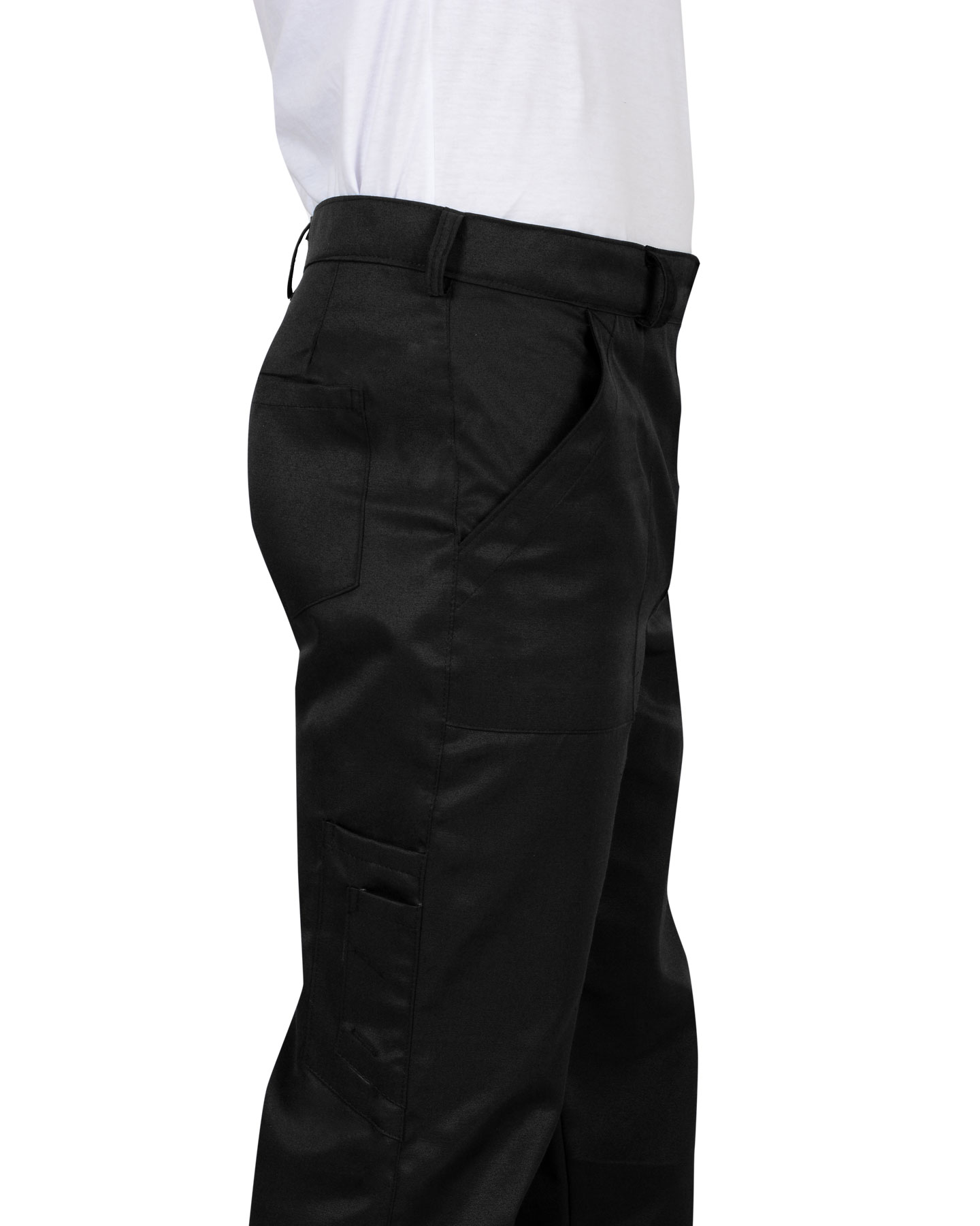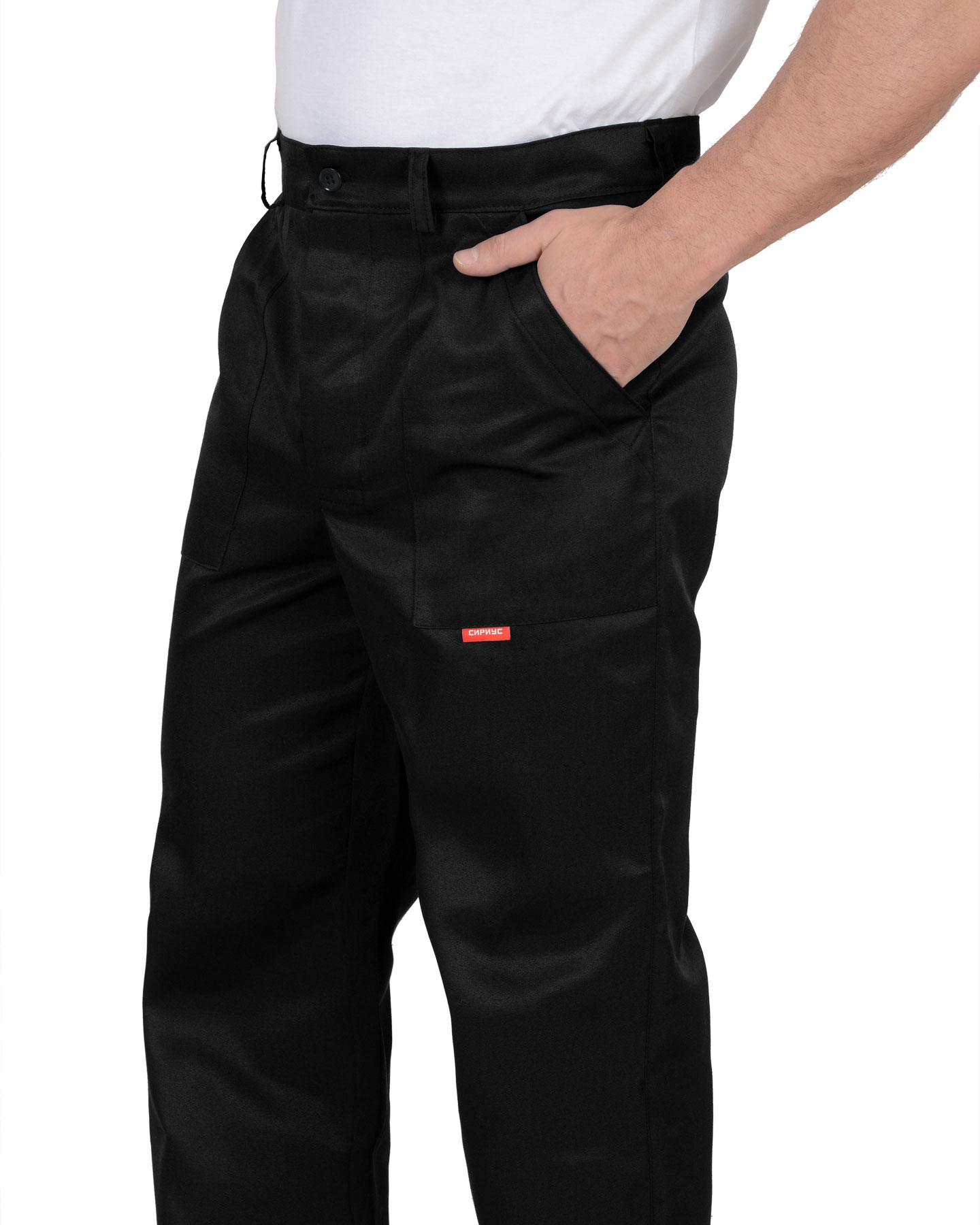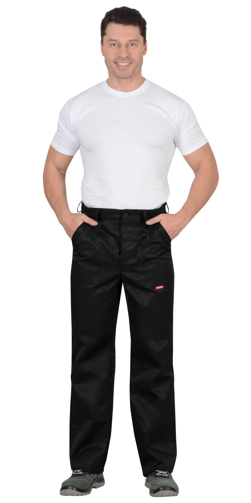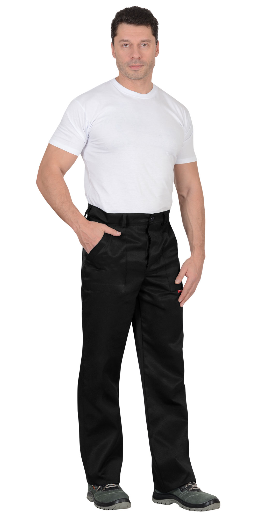 Брюки с заст.жкой спереди на 3 петли и 3пуговицы, с притачным поясом с 5 шлевками и заст.жкой на 1 петлю и пуговицу, с накладными боковыми карманами с наклонным входом, с накладным фигурным карманом и двумя (расположенными один на другом) накладными фигурными кармашками для инструментов на правой задней половинке. На маленьком кармашке 2 наклонные петли. ГОСТ 12.4.280-2014