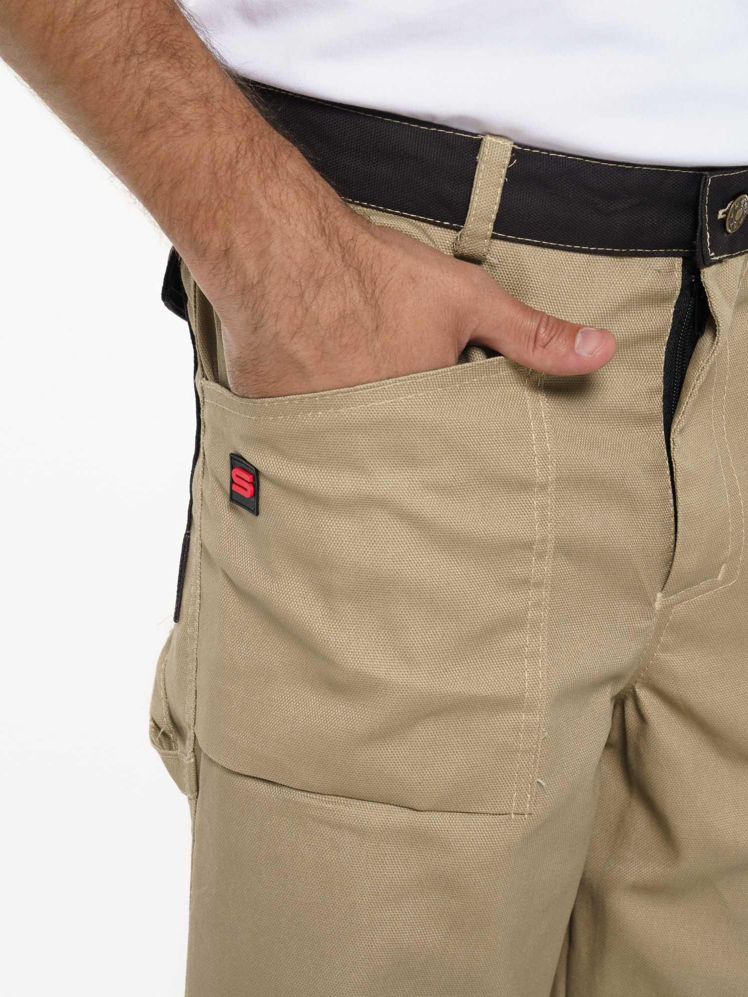 Брюки с притачным поясом, застегивающимся на джинсовую пуговицу и с регулировкой ширины пояса при помощи пат и кнопок, с накладными карманами и объемными наколенниками с возможностью вставить в них объемные щитки