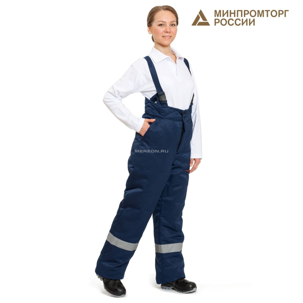Брюки прямого силуэта ,с завышенным утепленным поясом . При помощи петель /пуговиц к поясу брюк крепится утепленная спинка с бретелями ( спереди бретели крепятся к поясу брюк карабинами ) . По линии ниже колена настрочена световозвращающая полоса шириной 50мм .Боковые карманы накладные с наклонной линией входа . Гульфик – на молнии .