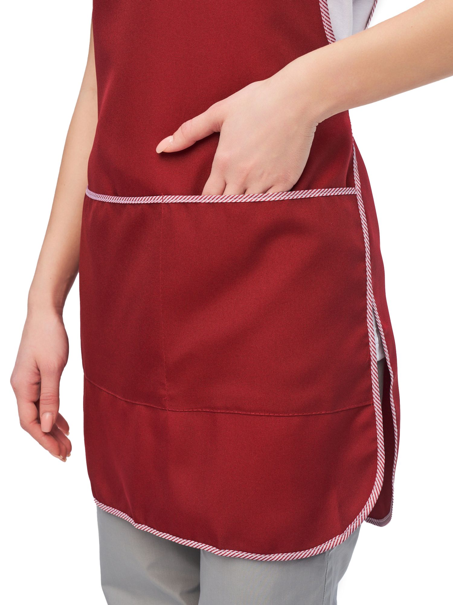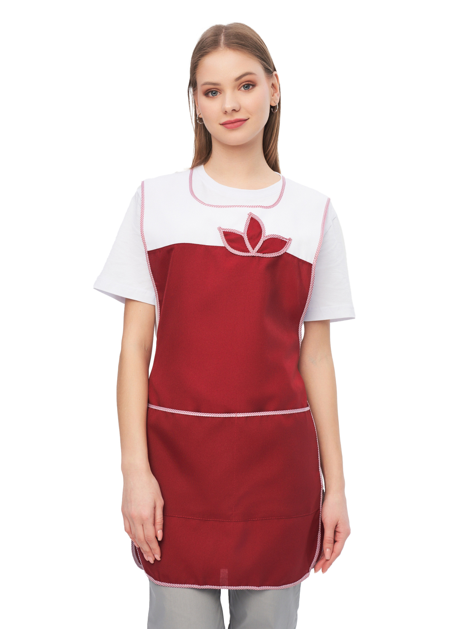 Фартук с декоративным воротником, с большим функциональным карманом, разделенным на две части. По талии объем регулируется при помощи полупоясов. Эту модель выделяет контрастное сочетание цвета и изящная аппликация на груди в виде цветка. Рекомендуется для работниц сферы обслуживания, технического персонала гостиниц, для работников торговли.