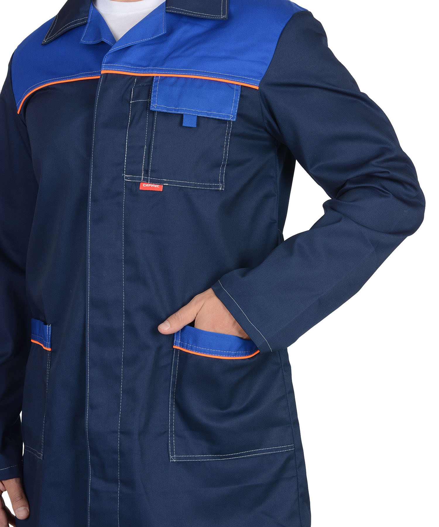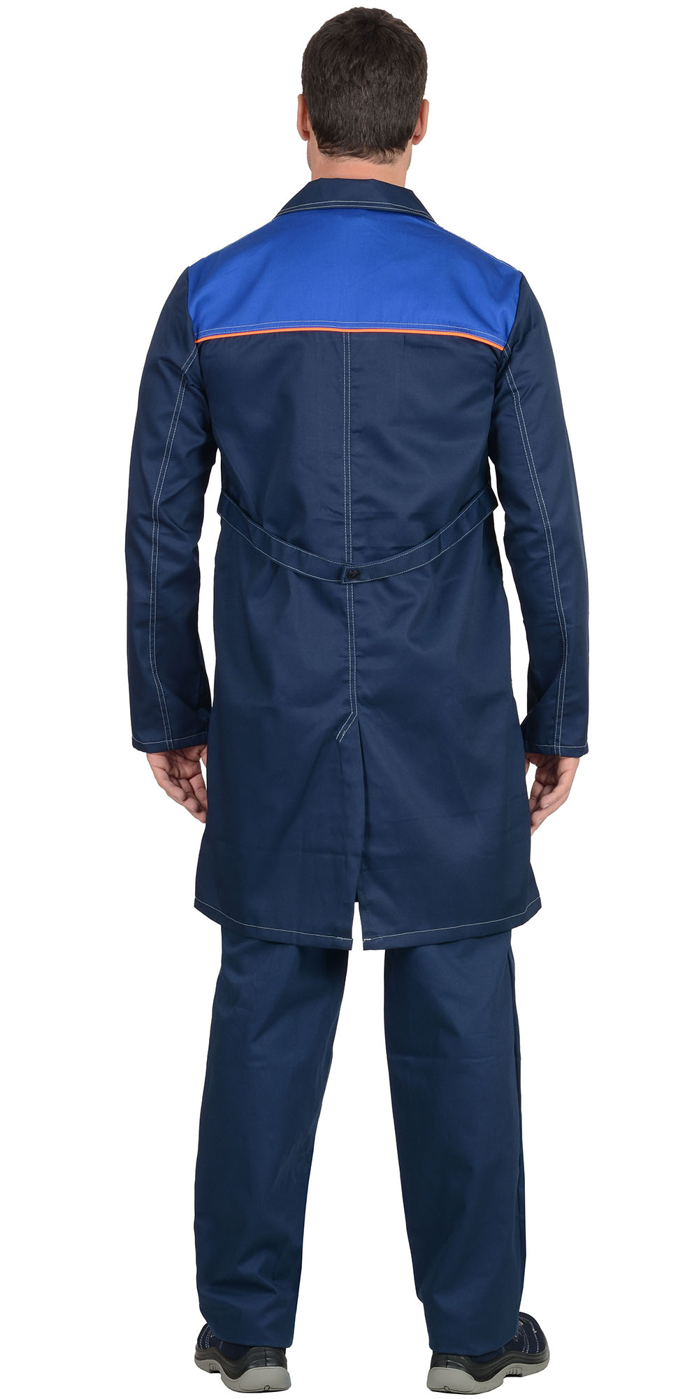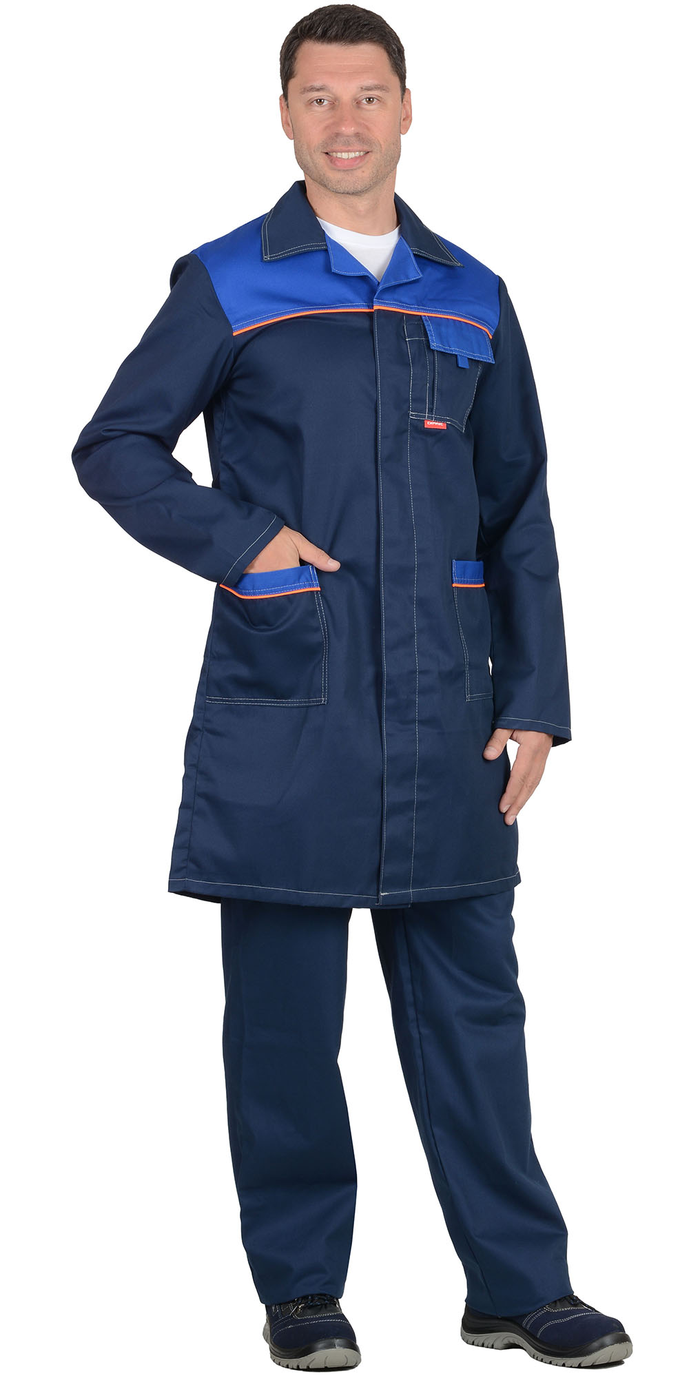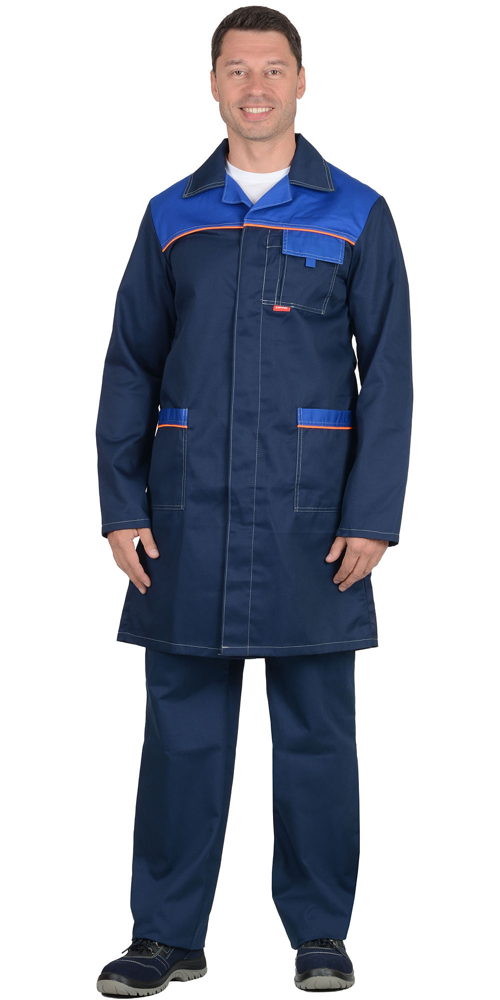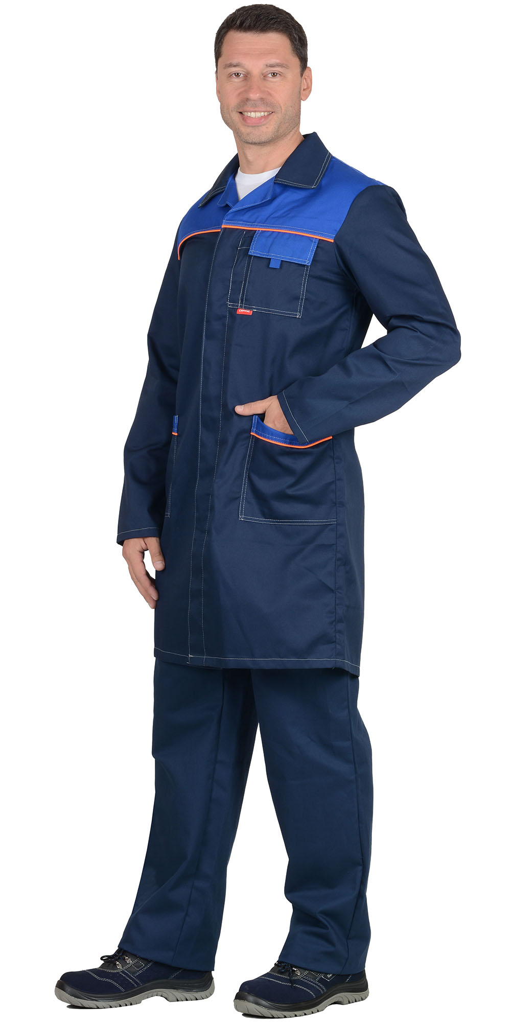Кант: оранжевый. Потайная застёжка на пуговицы, нагр, бок. карманы. Спинка с хлястиком и шлицей. ГОСТ 12.4.132-83.