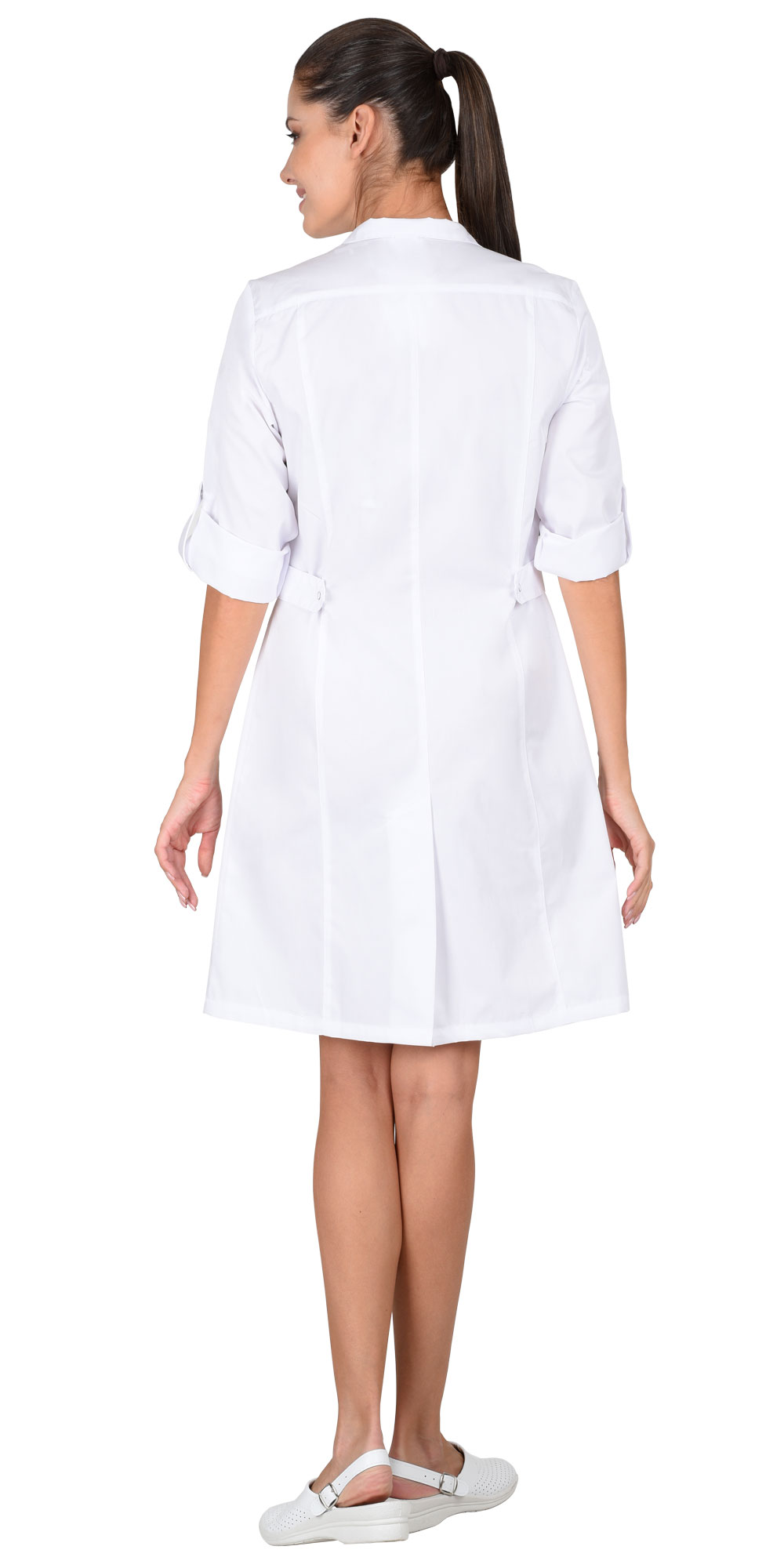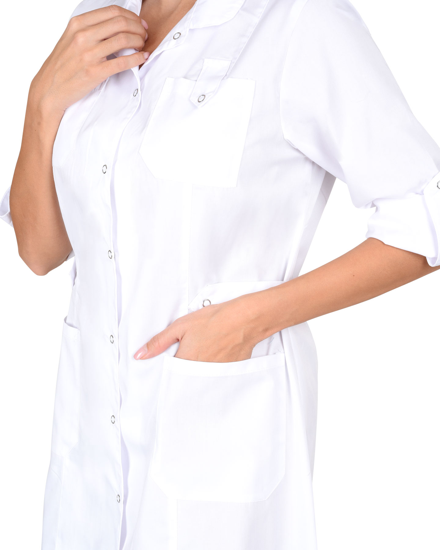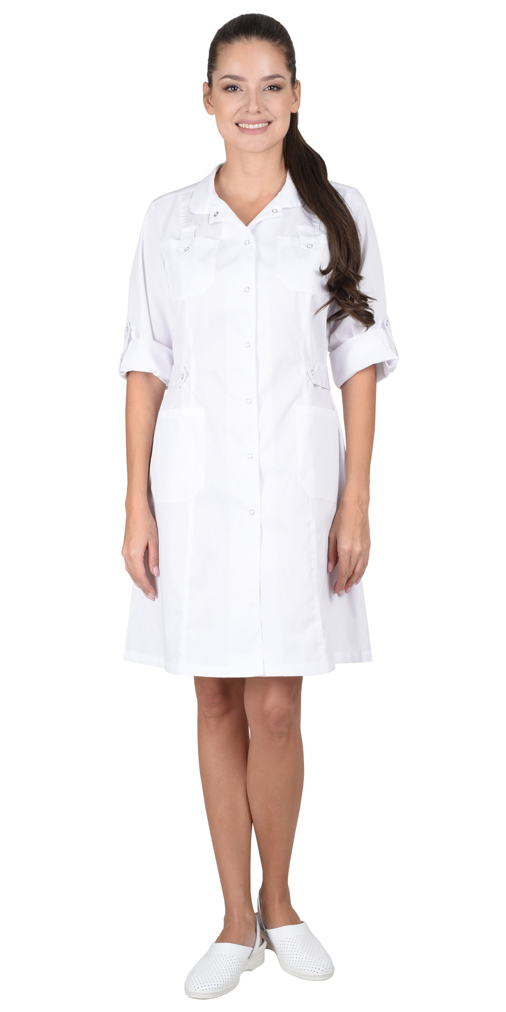 Халат полуприлегающего силуэта, с центральной застежкой на 7 рубашечных кнопок, воротник-стойка, рельефные швы, верхние карманы с хлястиками, застегивающимися на рубашечные кнопки, нижние накладные карманы. По боковым швам халата фигурные хлястики, регулирующие ширину халата по талии при помощи рубашечных кнопок. Рукав 3/4.