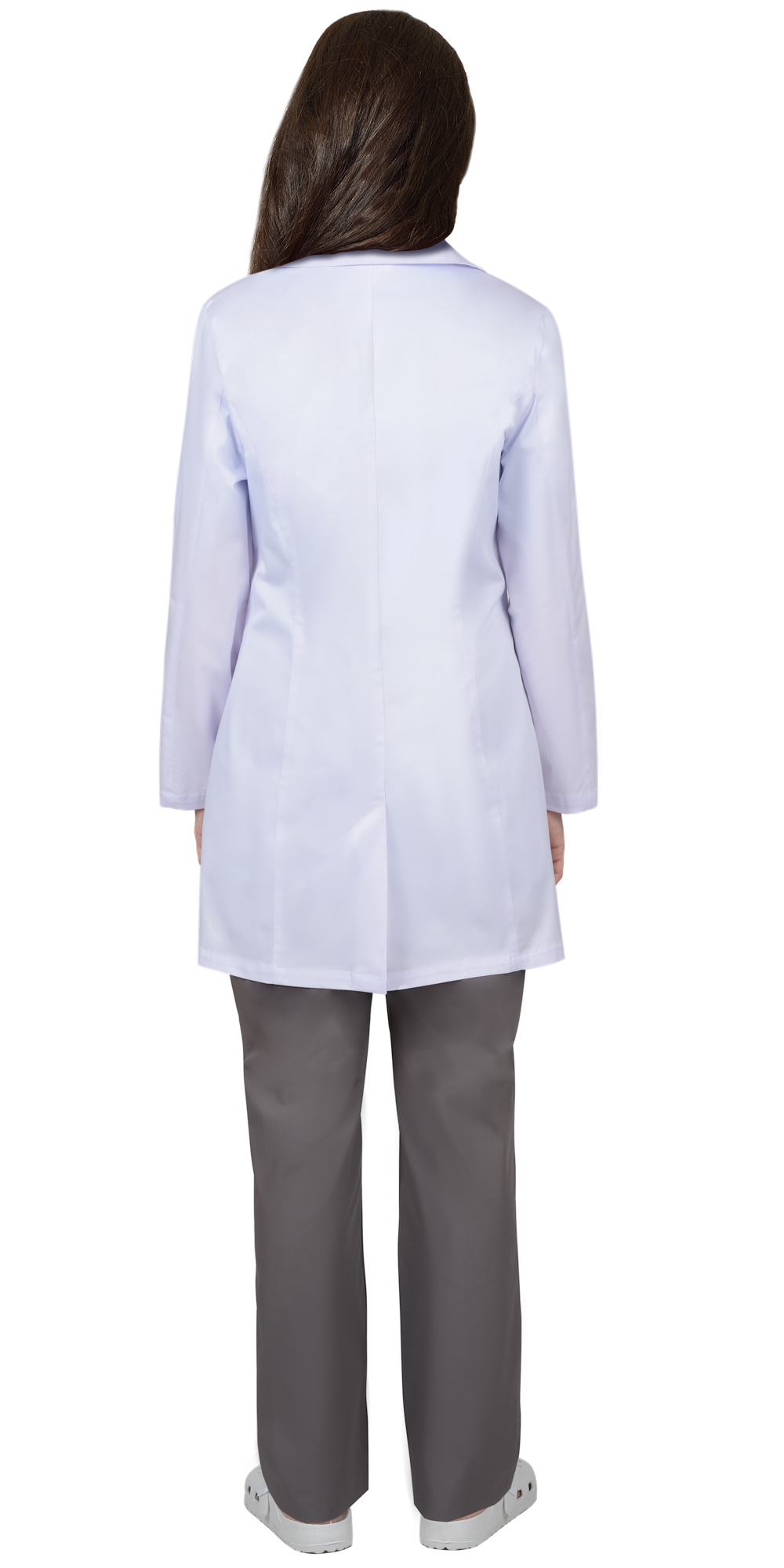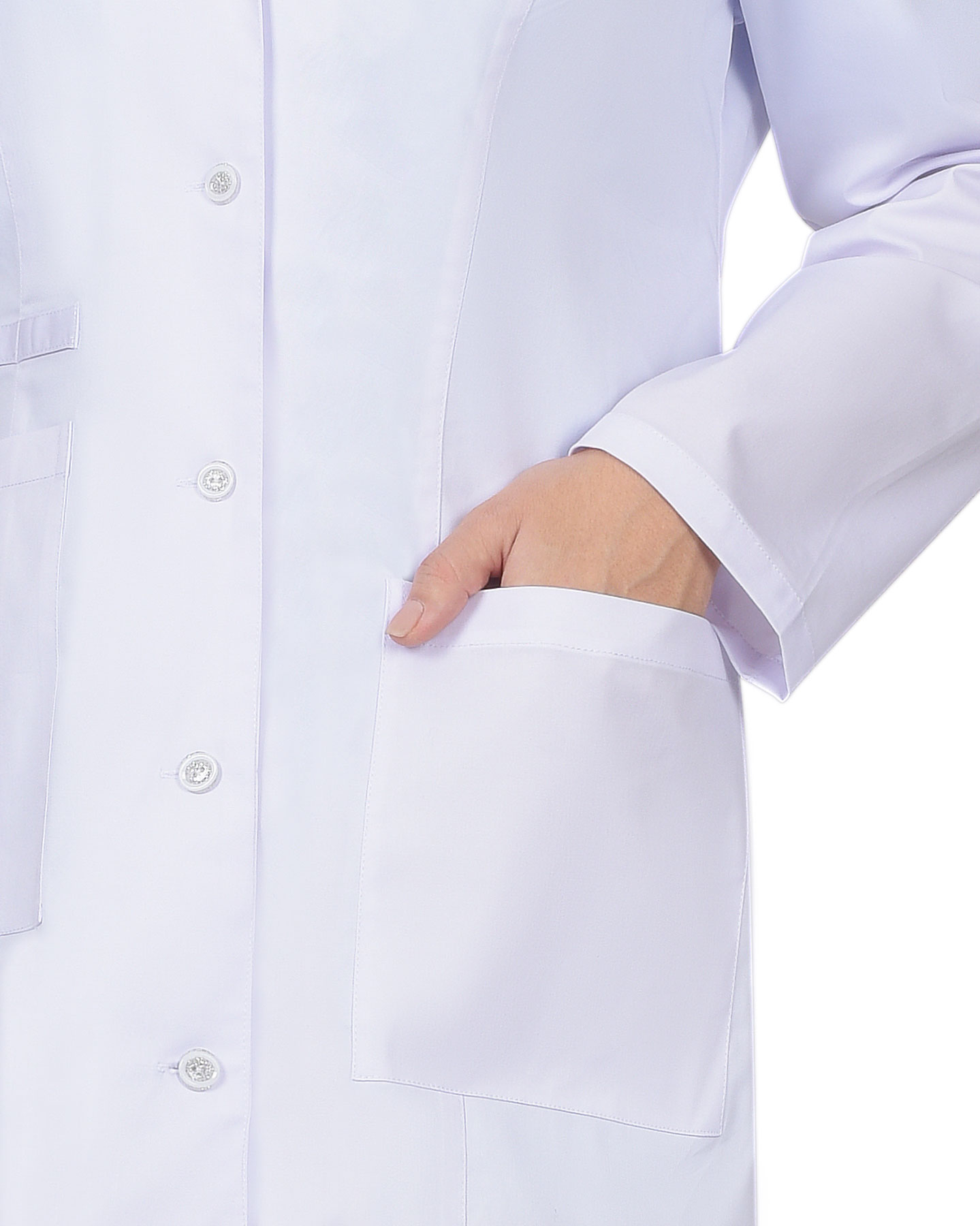 Халат женский полуприлегающего силуэта с центральной бортовой застёжкой на петли и пуговицы. Отложной воротник с лацканами. Один нагрудный и два нижних накладных кармана. Рукава втачные длинные.