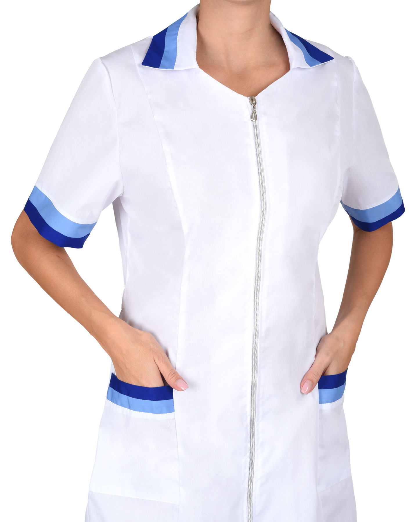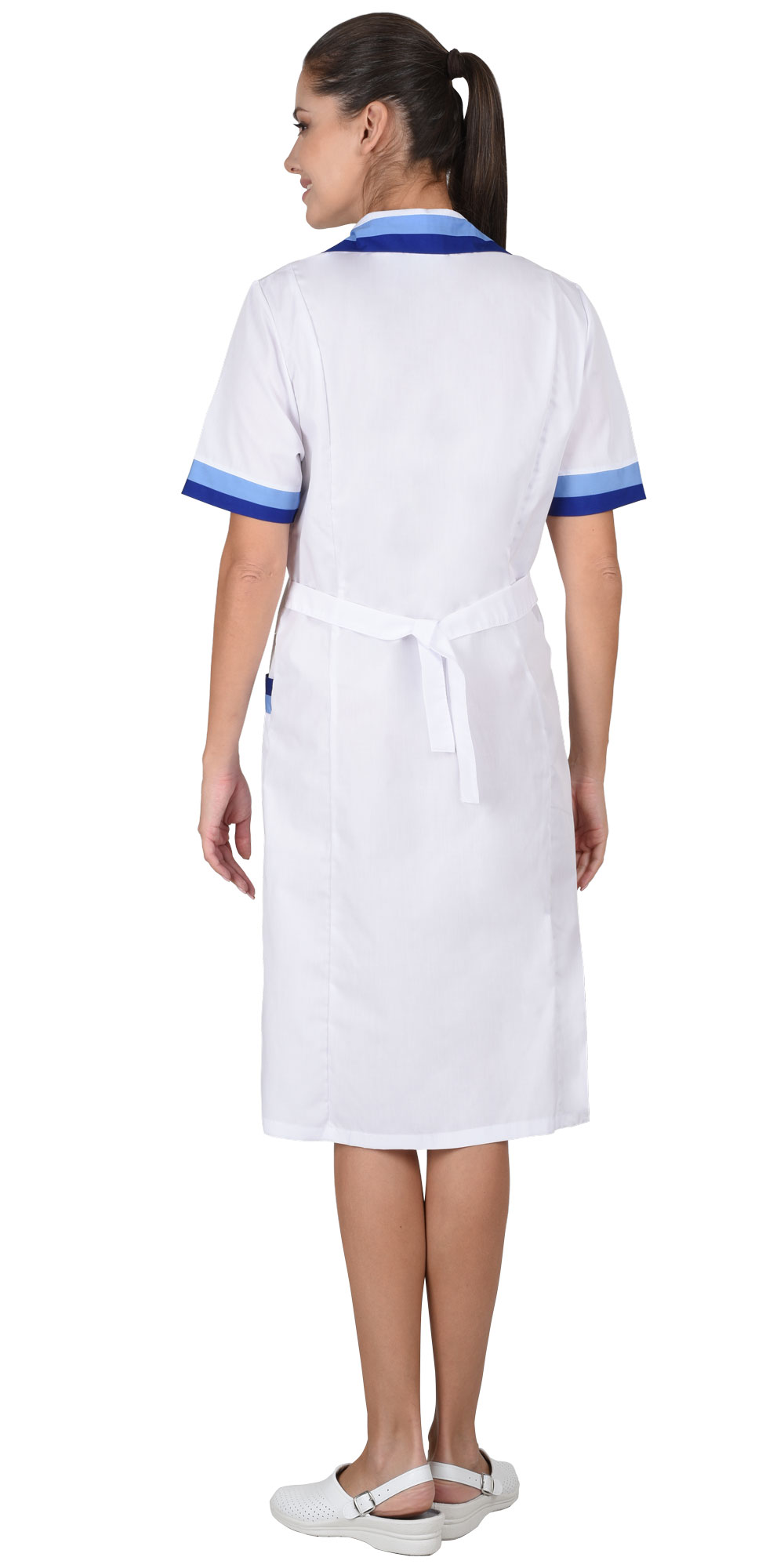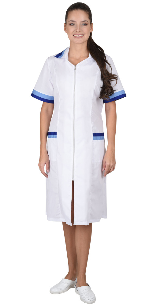 Халат с двумя нижними накладными карманами, отложным воротником и короткими рукавами. Ширина по линии талии регулируется хлястиком. Воротник, рукава и карманы с яркими отделочными элементами. Цвет отделки: Голубой