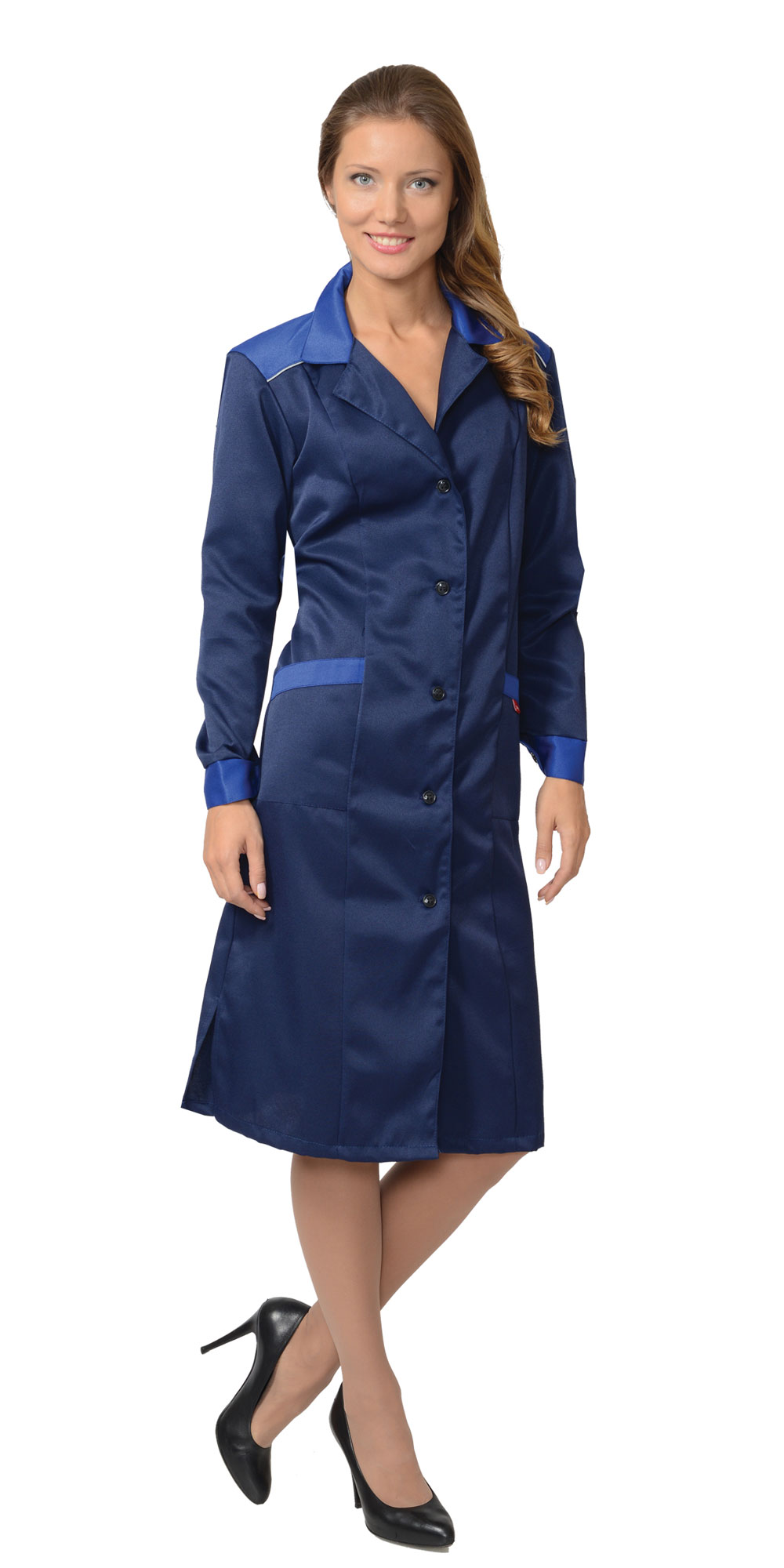 Халат "ТЕХНОЛОГ" женский (тк. смесовая) синий с васильковым СИРИУС (ЧЗ) (104-108/170-176)