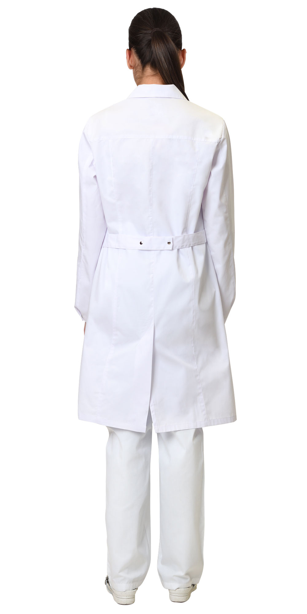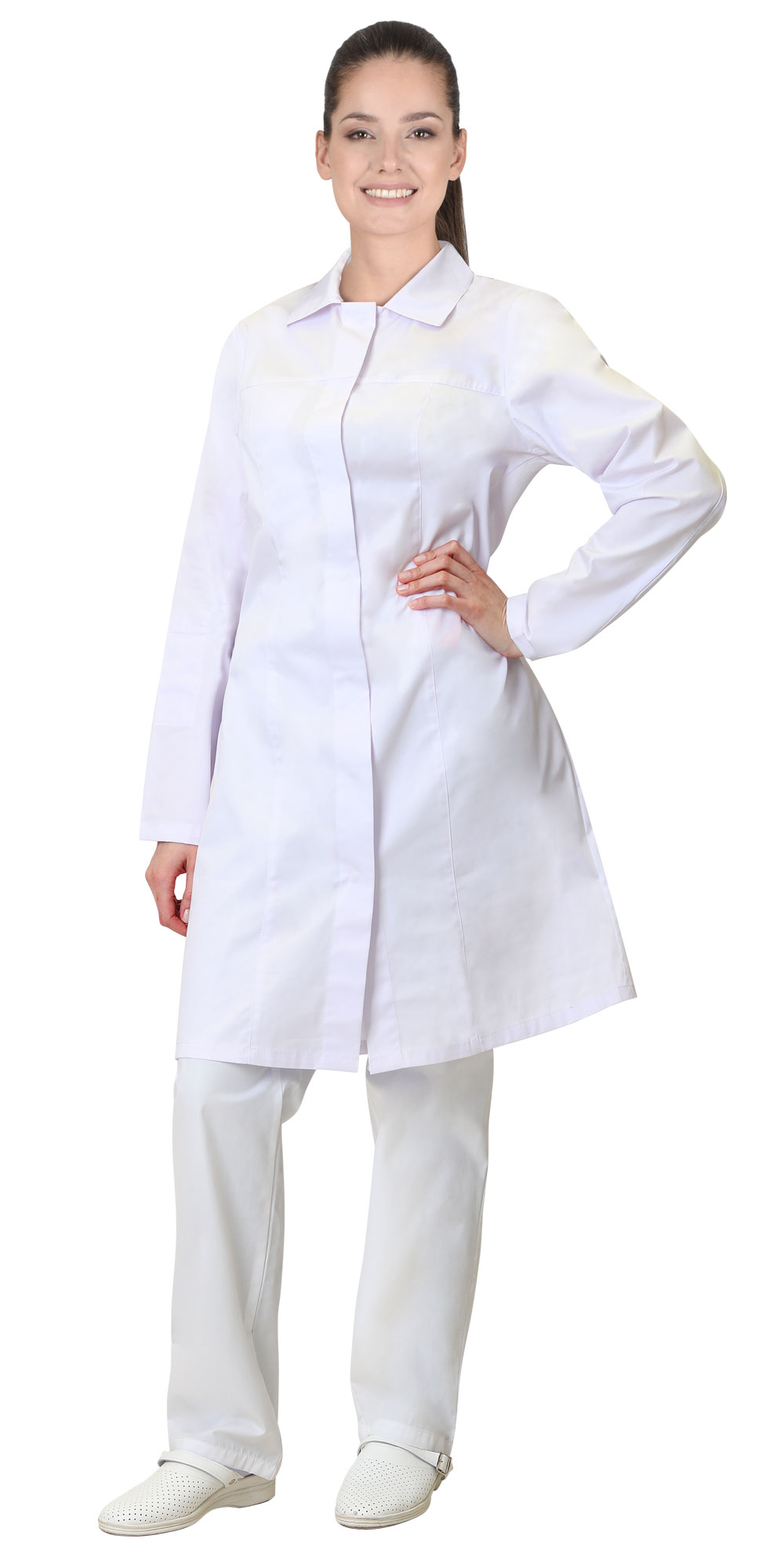 Халат женский прямого силуэта с длинными рукавами, центральной застежкой на потайные кнопки и втачным отложным воротником. Внутренний нагрудный карман и внутренний карман на правом рукаве для пропуска.