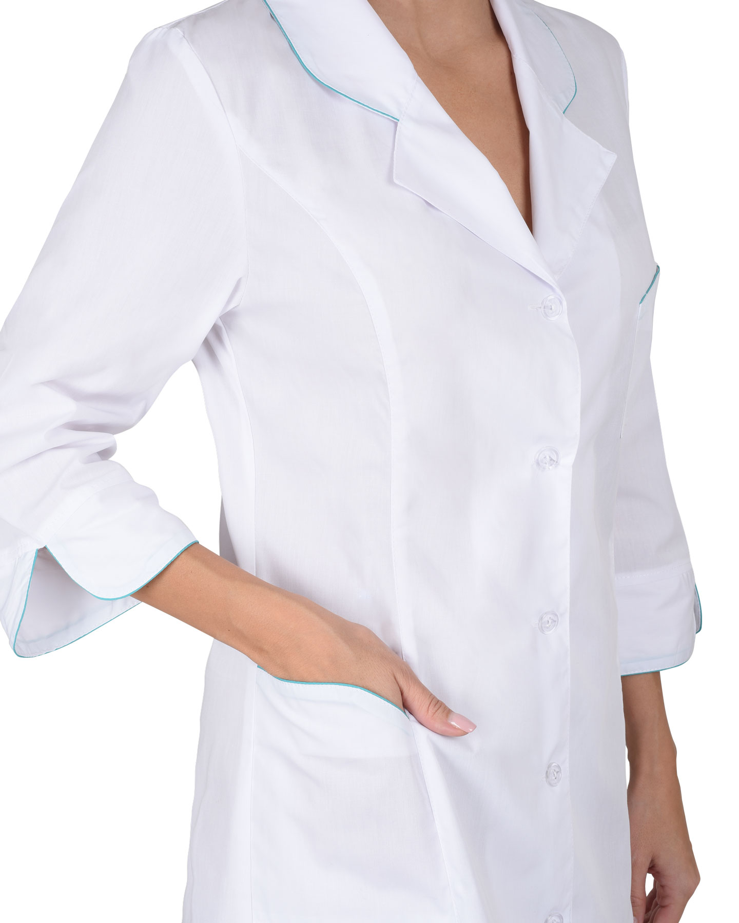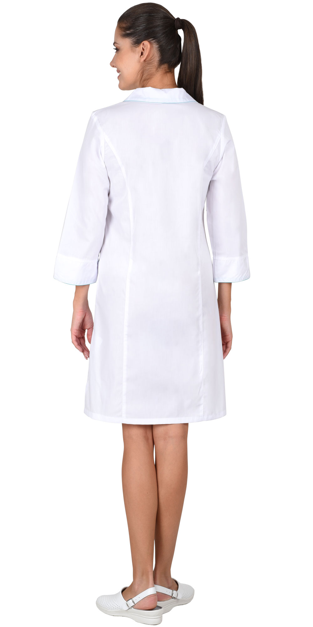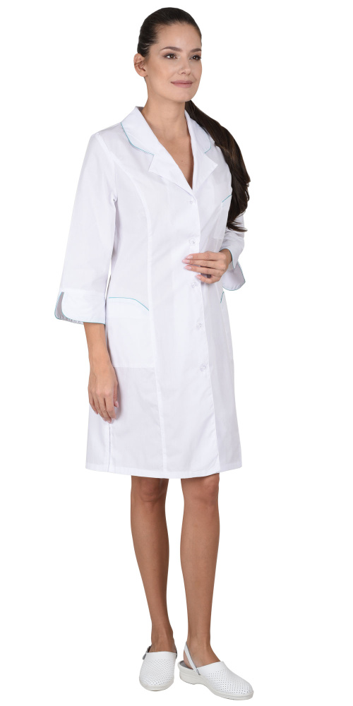 Халат с центральной застежкой на пуговицы. На полочках вертикальные рельефы. Фигурные карманы, воротник и манжеты с отделкой в виде канта контрастного цвета. Рукава 3/4. Цвет отделки: Бирюзовый.