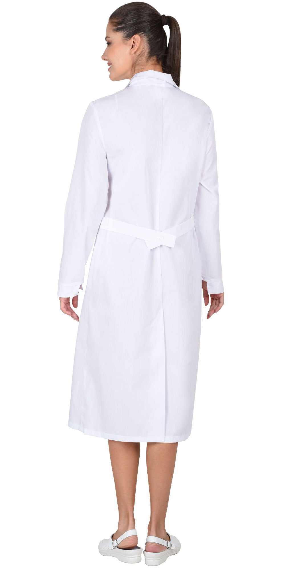 Классическая модель с нагрудным и двумя нижними накладными карманами, отложным воротником и длинными рукавами с манжетами. Ширина халата по линии талии регулируется хлястиком.