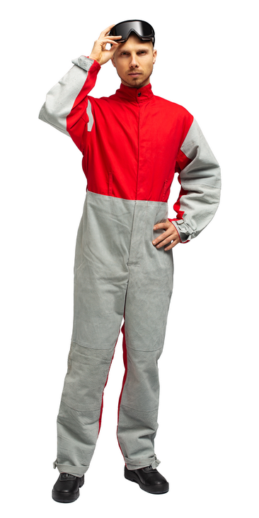 Комбинезон имеет усилители из спилка, конструкция обеспечивает защиту от проникновения пыли за счет закрытой застежки и регулируемых стяжек на рукавах и по низу брюк.