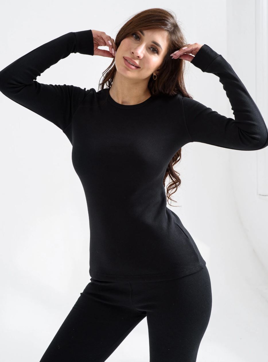 Фуфайка из гладкокрашеного полотна облегающего силуэта с длинным втачным рукавом на манжете. Круглая горловина окантована бейкой из основного полотна. Низ изделия обработан швом «в подгибку».