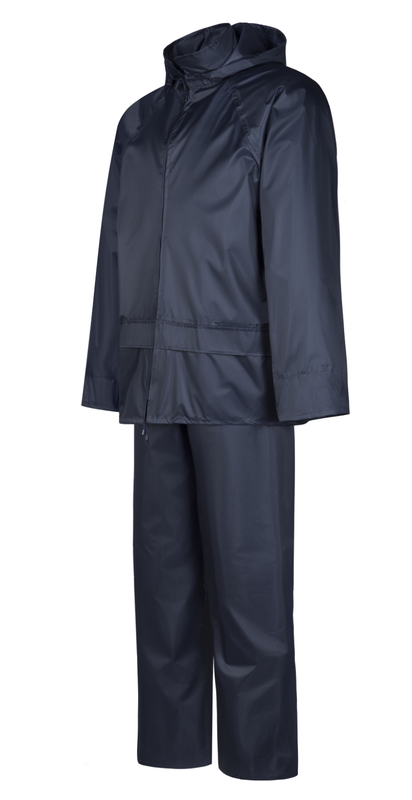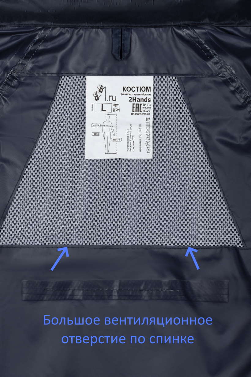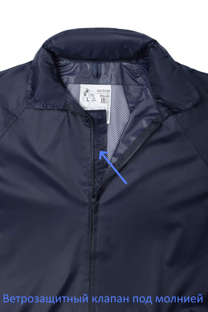 Влагозащитный костюм  (комплект влагостойкий куртка+брюки), для защиты от атмосферных воздействий: дождя, ветра, пыли. Куртка на молнии и внутренним ветрозащитным клапаном, с капюшоном (прячется в воротник на молнии), вентиляционными отверстиями под рукавами и по спинке (с сеткой) и двумя карманами под общей планкой, муфты в рукавах, регулировочная тесьма на поясе. Брюки на резинке, два кармана (сквозные, для доступа к карманам одежды), гульфик на кнопках, ширина низа брюк регулируется кнопками. Комплект поставляется в индивидуальной многоразовой упаковке. Материал - ПВХ усиленный полиэстером (полиэстеровыми волокнами- нитями) с толщиной листа 0,18 мм, все соединения проклеены ПВХ лентой, цвет темно-синий. Рекомендуется для использования поверх верхней одежды в дождливую погоду во всех отраслях промышленности, на транспорте и сельском хозяйстве  Размеры "европейские", соответсвуют стандартам РФ: M, L, XL, 2XL, 3XL, 4XL