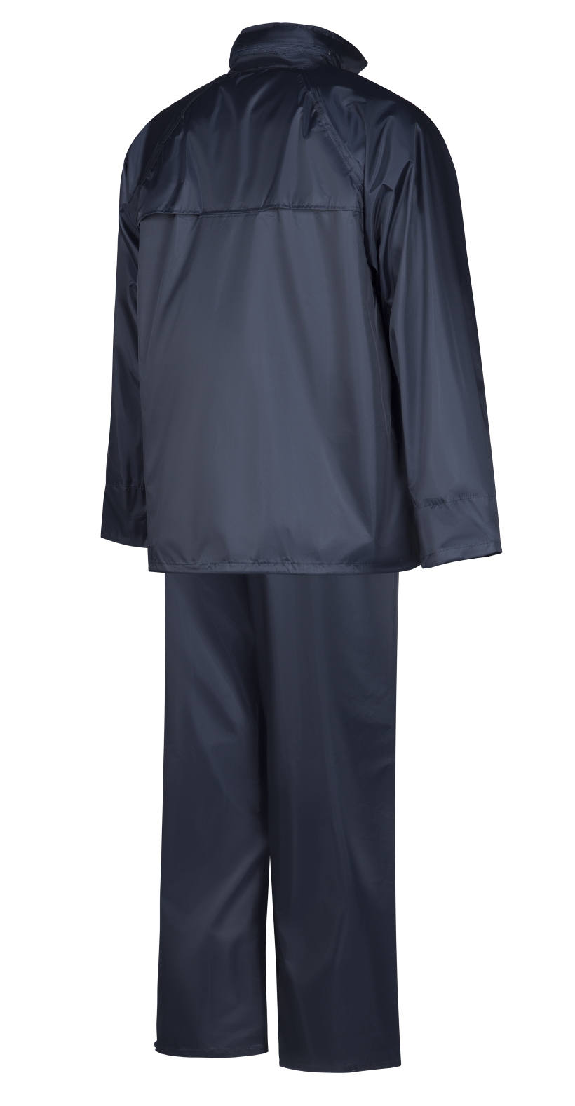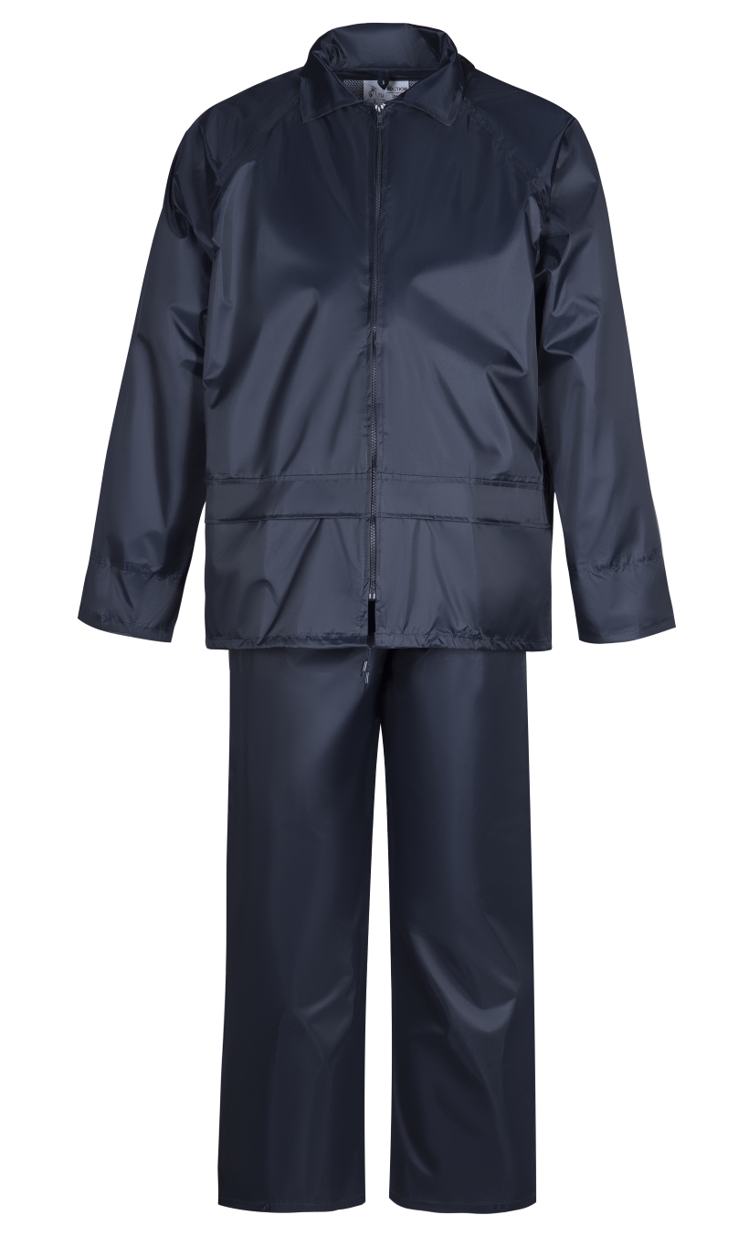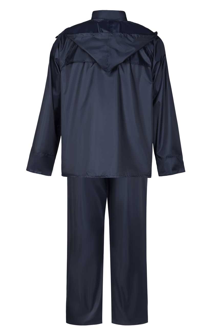 Влагозащитный костюм  (комплект влагостойкий куртка+брюки), для защиты от атмосферных воздействий: дождя, ветра, пыли. Куртка на молнии и внутренним ветрозащитным клапаном, с капюшоном (прячется в воротник на молнии), вентиляционными отверстиями под рукавами и по спинке (с сеткой) и двумя карманами под общей планкой, муфты в рукавах, регулировочная тесьма на поясе. Брюки на резинке, два кармана (сквозные, для доступа к карманам одежды), гульфик на кнопках, ширина низа брюк регулируется кнопками. Комплект поставляется в индивидуальной многоразовой упаковке. Материал - ПВХ усиленный полиэстером (полиэстеровыми волокнами- нитями) с толщиной листа 0,18 мм, все соединения проклеены ПВХ лентой, цвет темно-синий. Рекомендуется для использования поверх верхней одежды в дождливую погоду во всех отраслях промышленности, на транспорте и сельском хозяйстве  Размеры "европейские", соответсвуют стандартам РФ: M, L, XL, 2XL, 3XL, 4XL