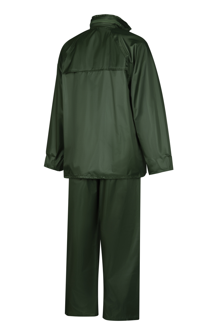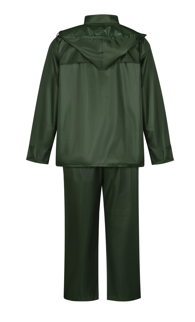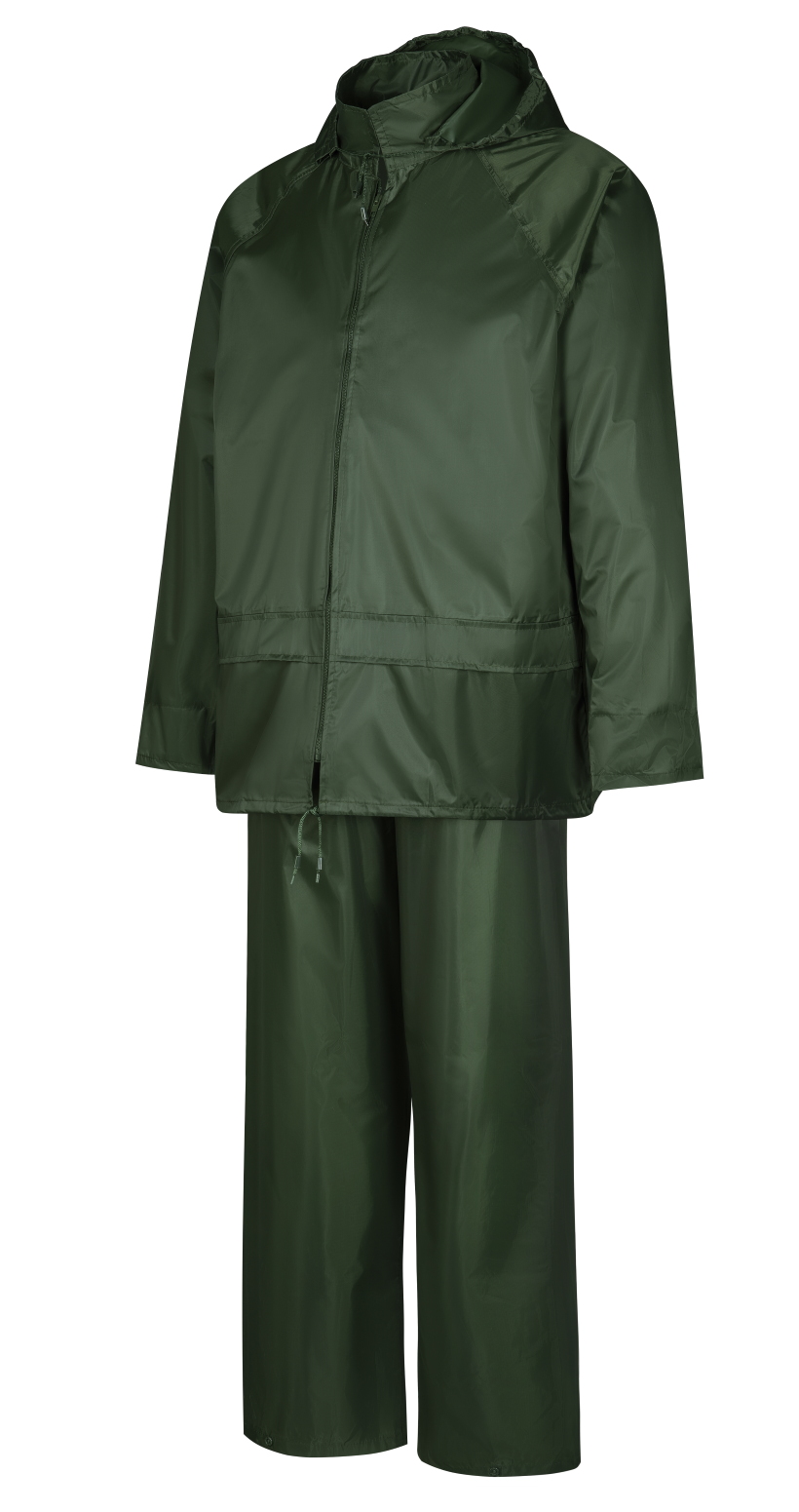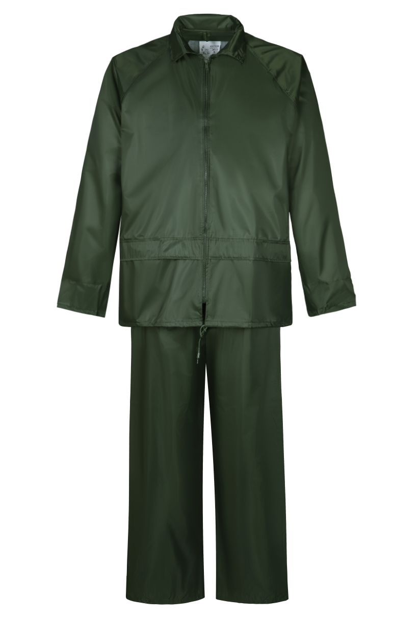 Влагозащитный костюм  (комплект влагостойкий куртка+брюки), для защиты от атмосферных воздействий: дождя, ветра, пыли. Куртка на молнии и внутренним ветрозащитным клапаном, с капюшоном (прячется в воротник на молнии), вентиляционными отверстиями под рукавами и по спинке (с сеткой) и двумя карманами под общей планкой, муфты в рукавах, регулировочная тесьма на поясе. Брюки на резинке, два кармана (сквозные, для доступа к карманам одежды), гульфик на кнопках, ширина низа брюк регулируется кнопками. Комплект поставляется в индивидуальной многоразовой упаковке. Материал - ПВХ усиленный полиэстером (полиэстеровыми волокнами- нитями) с толщиной листа 0,18 мм, все соединения проклеены ПВХ лентой, цвет зеленый. Рекомендуется для использования поверх верхней одежды в дождливую погоду во всех отраслях промышленности, на транспорте и сельском хозяйстве  Размеры "европейские", соответствуют стандартам РФ: L, XL, 2XL, 3XL