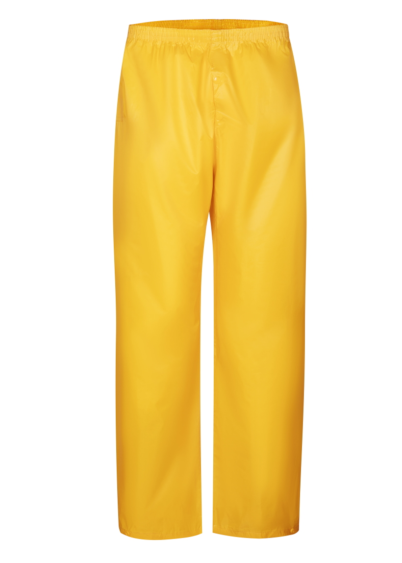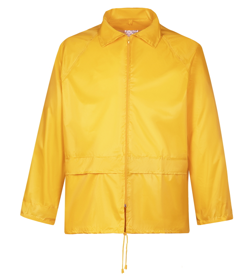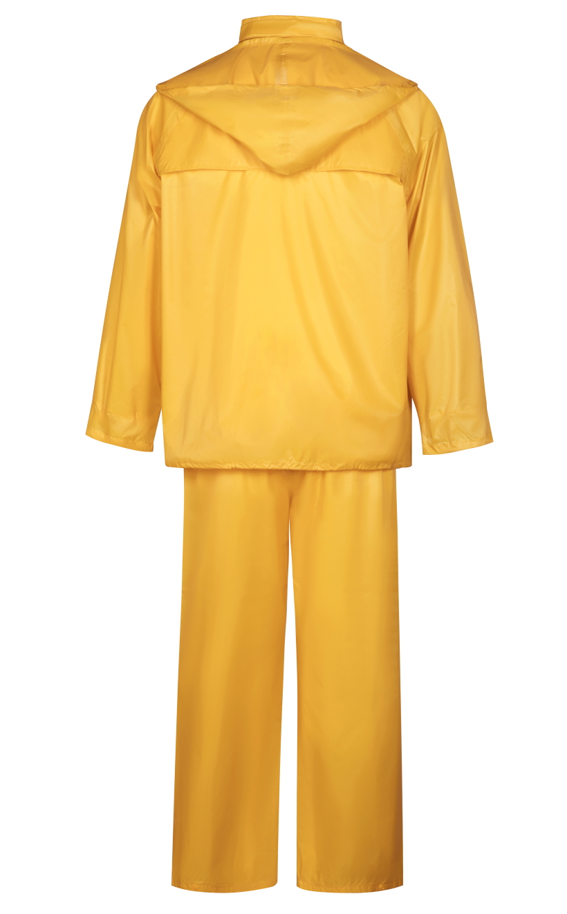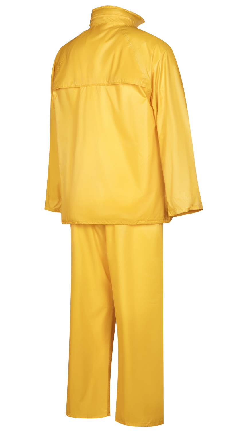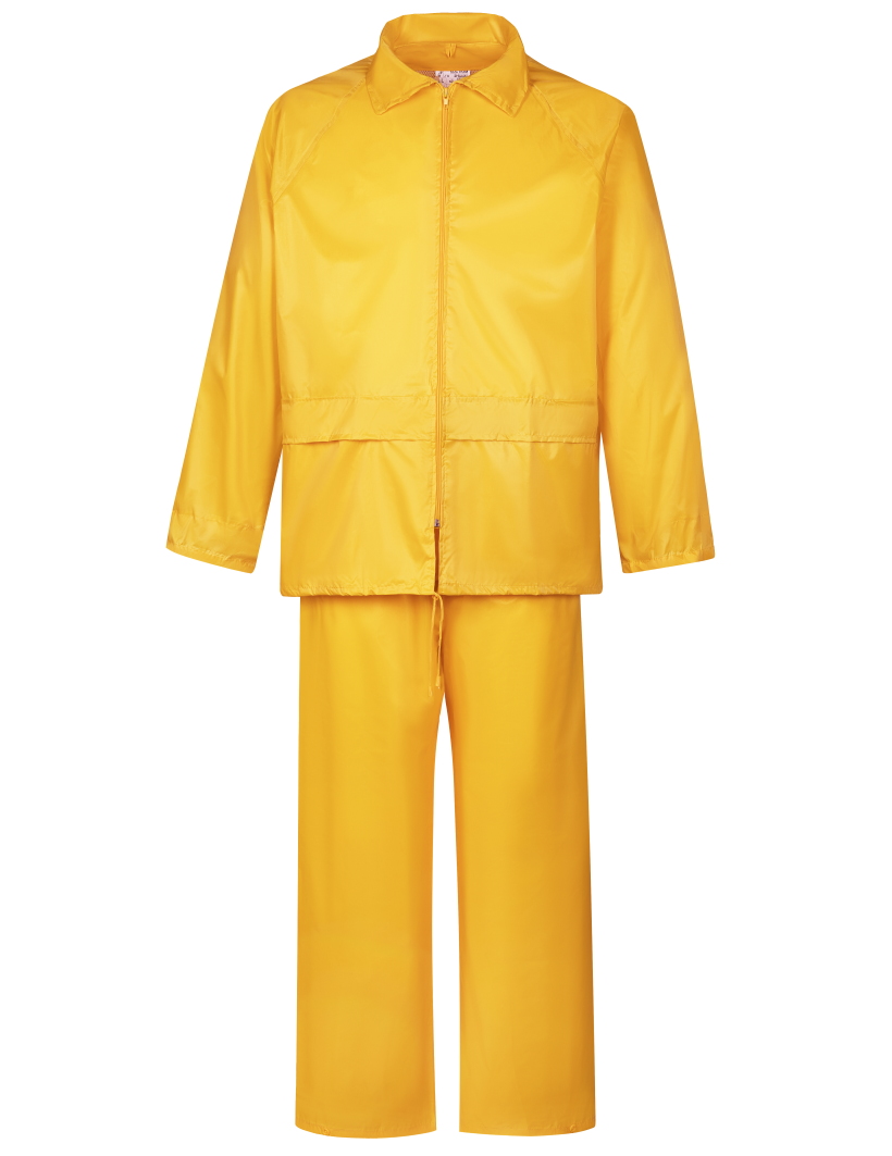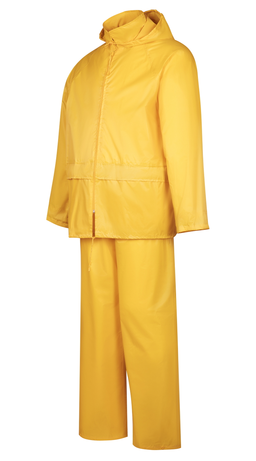 Влагозащитный костюм  (комплект влагостойкий куртка+брюки), для защиты от атмосферных воздействий: дождя, ветра, пыли. Куртка на молнии и внутренним ветрозащитным клапаном, с капюшоном (прячется в воротник на молнии), вентиляционными отверстиями под рукавами и по спинке (с сеткой) и двумя карманами под общей планкой, муфты в рукавах, регулировочная тесьма на поясе. Брюки на резинке, два кармана (сквозные, для доступа к карманам одежды), гульфик на кнопках, ширина низа брюк регулируется кнопками. Комплект поставляется в индивидуальной многоразовой упаковке. Материал - ПВХ усиленный полиэстером (полиэстеровыми волокнами- нитями) с толщиной листа 0,18 мм, все соединения проклеены ПВХ лентой, цвет жёлтый. Рекомендуется для использования поверх верхней одежды в дождливую погоду во всех отраслях промышленности, на транспорте и сельском хозяйстве  Размеры "европейские", соответствуют стандартам РФ: L, XL, 2XL, 3XL