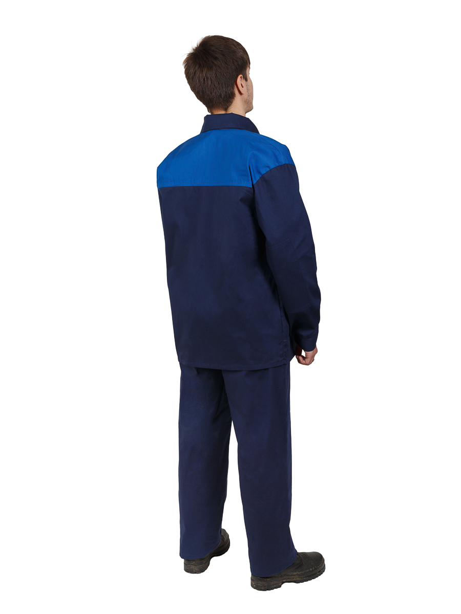 Костюм состоит из куртки и брюк: куртка с центральной бортовой застёжкой на пуговицы, нагрудным и боковыми карманами, отложным воротником. Кокетка из ткани контрастного цвета. Брюки с поясом и накладными карманами. Рукава усилены налокотниками, брюки – наколенниками.