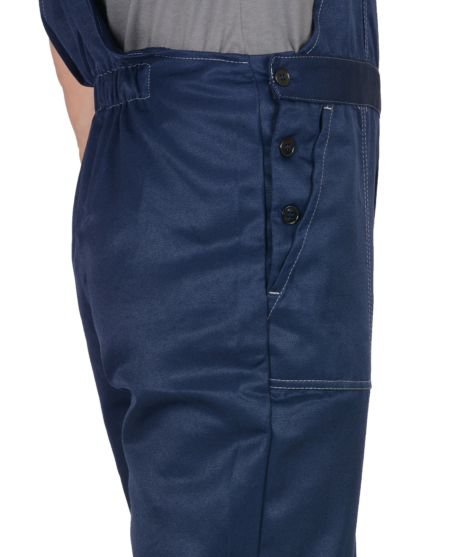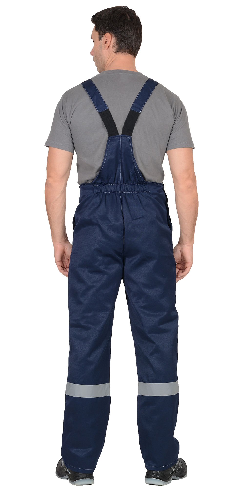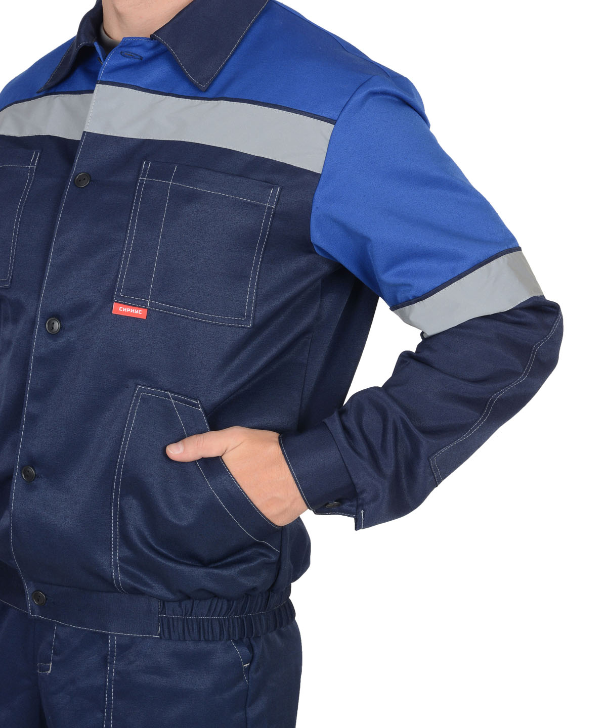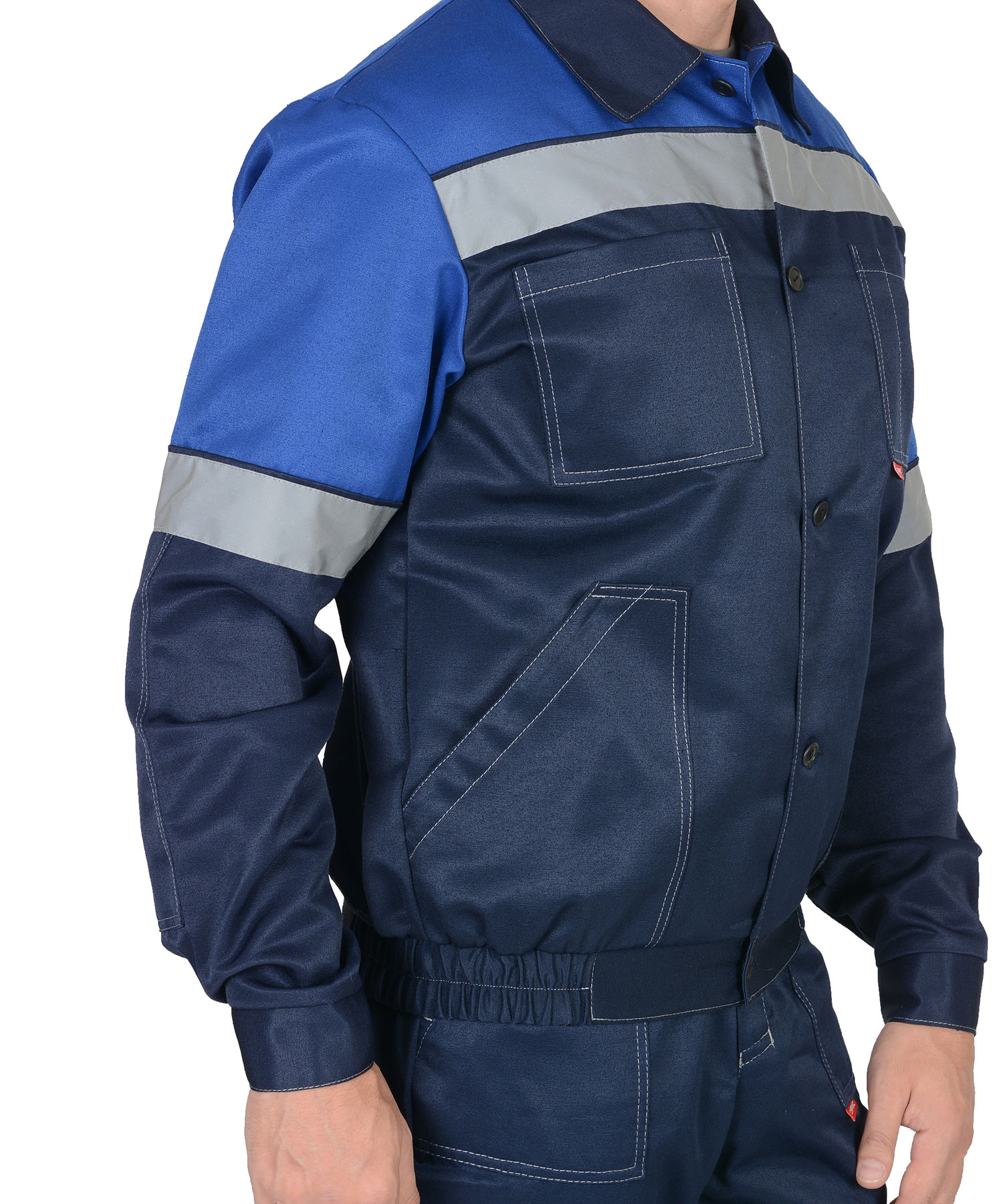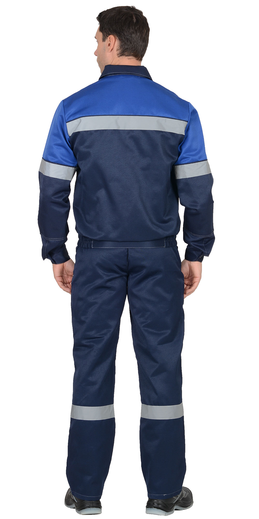 Куртка укороченная , с центральной застежкой на пуговицы, с налокотниками , с поясом на резинке с накладными карманами и светоотражающей лентой 50 мм.Полукомбинезон с застежкой гульфика на тесьму "молния", с боковой застежкой на пуговицы, с накладными карманами, с наколенниками и светоотражающей лентой 50 мм