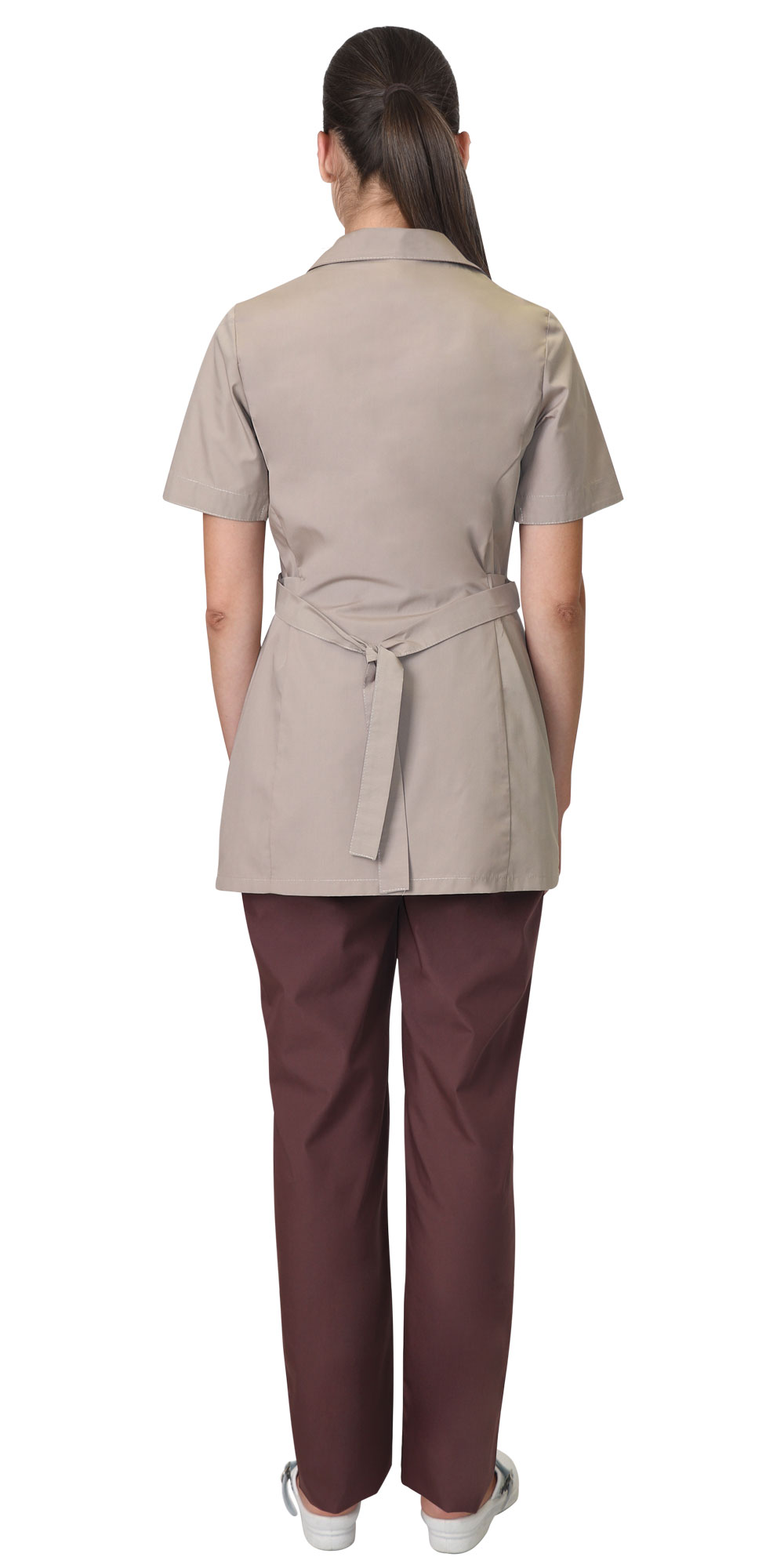 Блуза полуприлегающего силуэта с центральной застёжкой на молнию, с завязывающимся сзади поясом. Воротник отложной. Два боковых кармана в рельефных швах. Один нагрудный накладной фигурный карман. Рукава втачные короткие. На нагрудном кармане и рукавах паты из отделочной ткани. Брюки прямые на притачном поясе, частично стянутом на эластичную тесьму, спереди на поясе вставка.