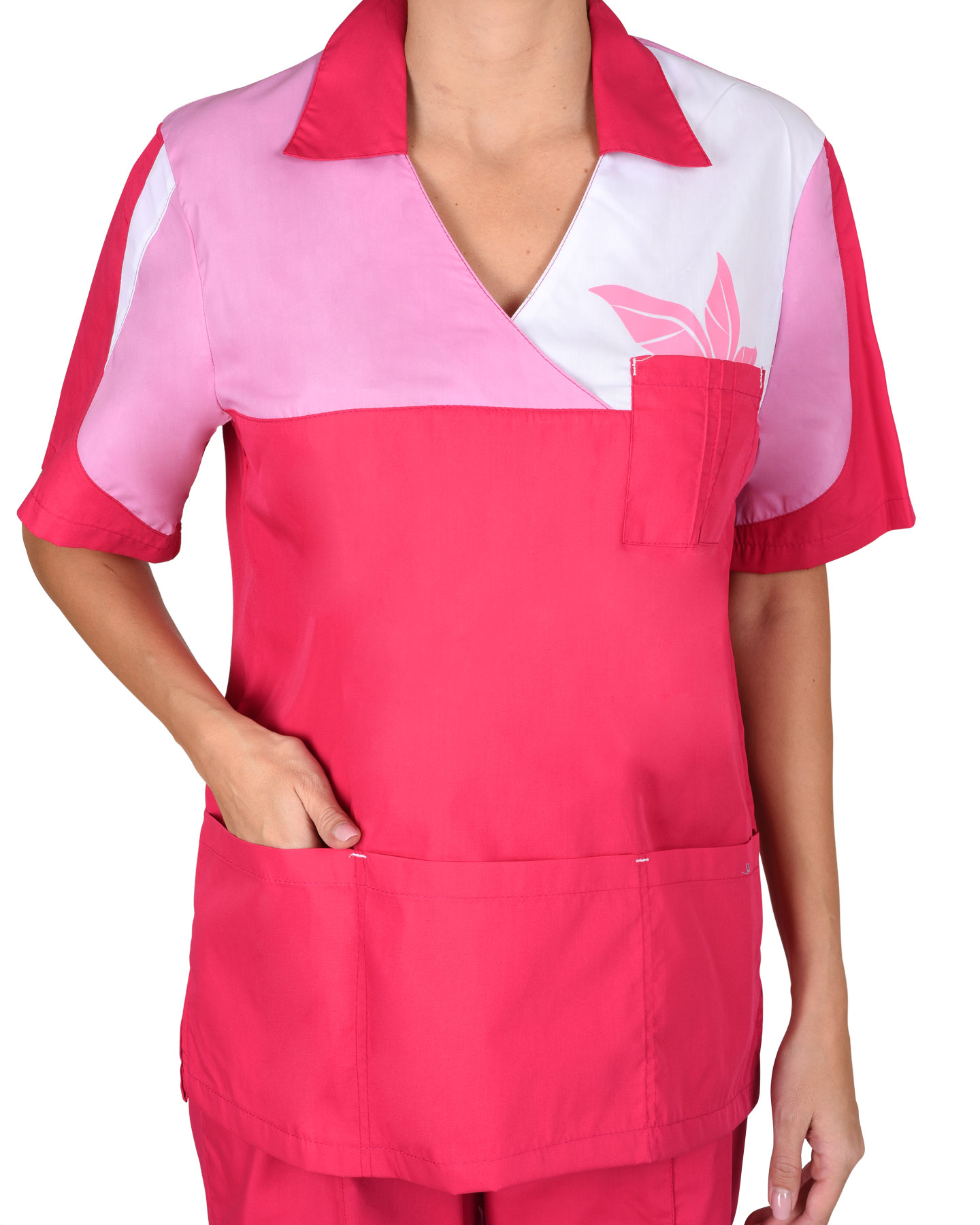 Костюм состоит из блузы и брюк. Блуза прямая с V-образным вырезом горловины и отложным воротником. С нижним накладным большим карманом, разделенным на три. Рукава короткие. Брюки прямые с притачным поясом стянутым резинкой и с отстроченными стрелками.