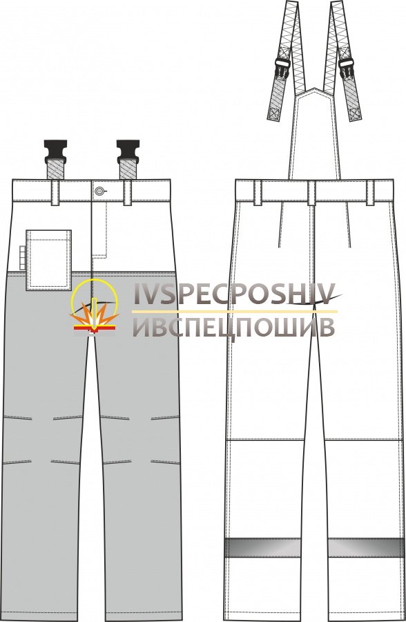 Задние половинки брюк с вытачками, состоят из двух частей: верхней и нижней. Задние половинки с притачной спинкой, с бретелями, пристегивающимися на защелку-трезубец. Длина бретелей регулируется «открытой» эластичной лентой.