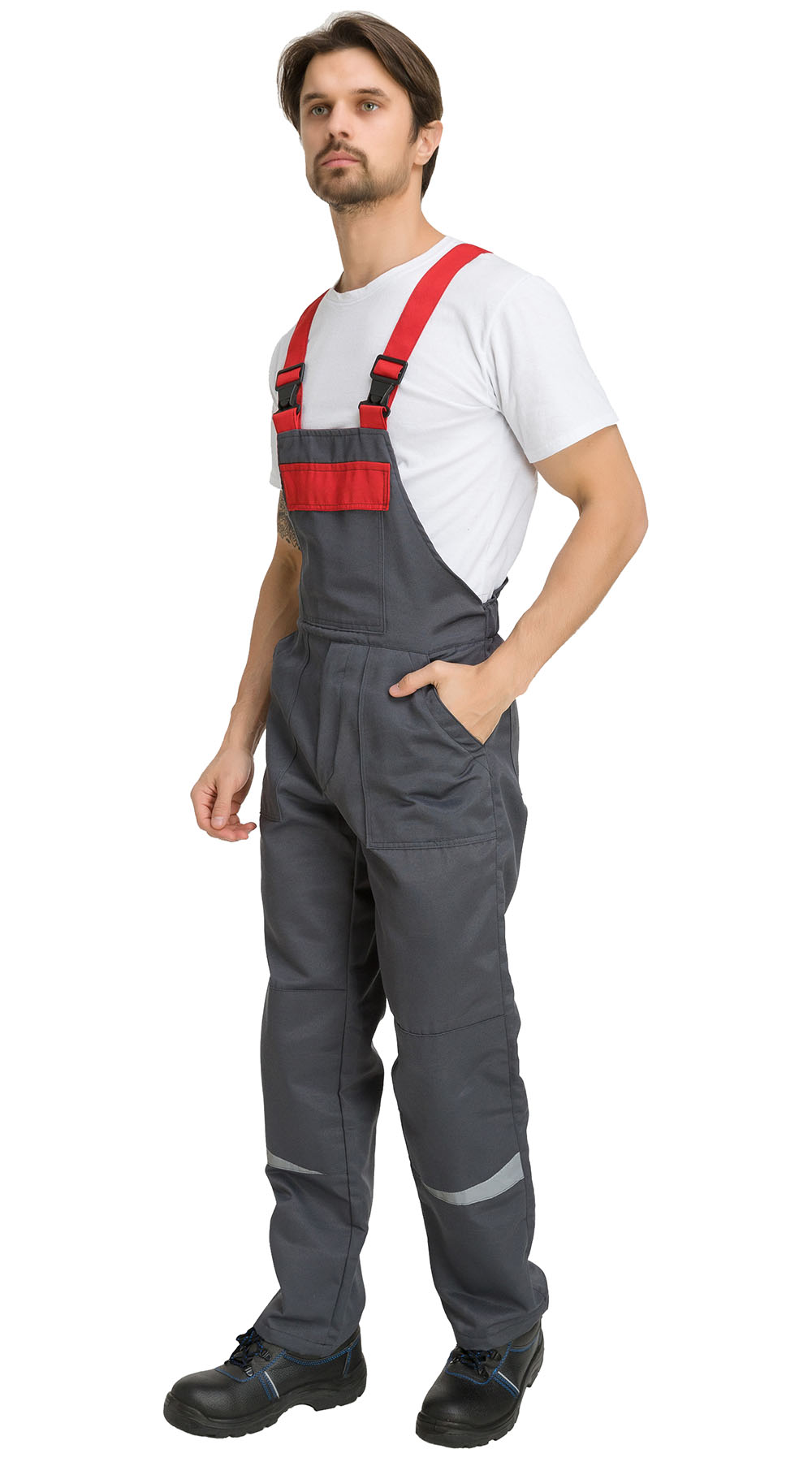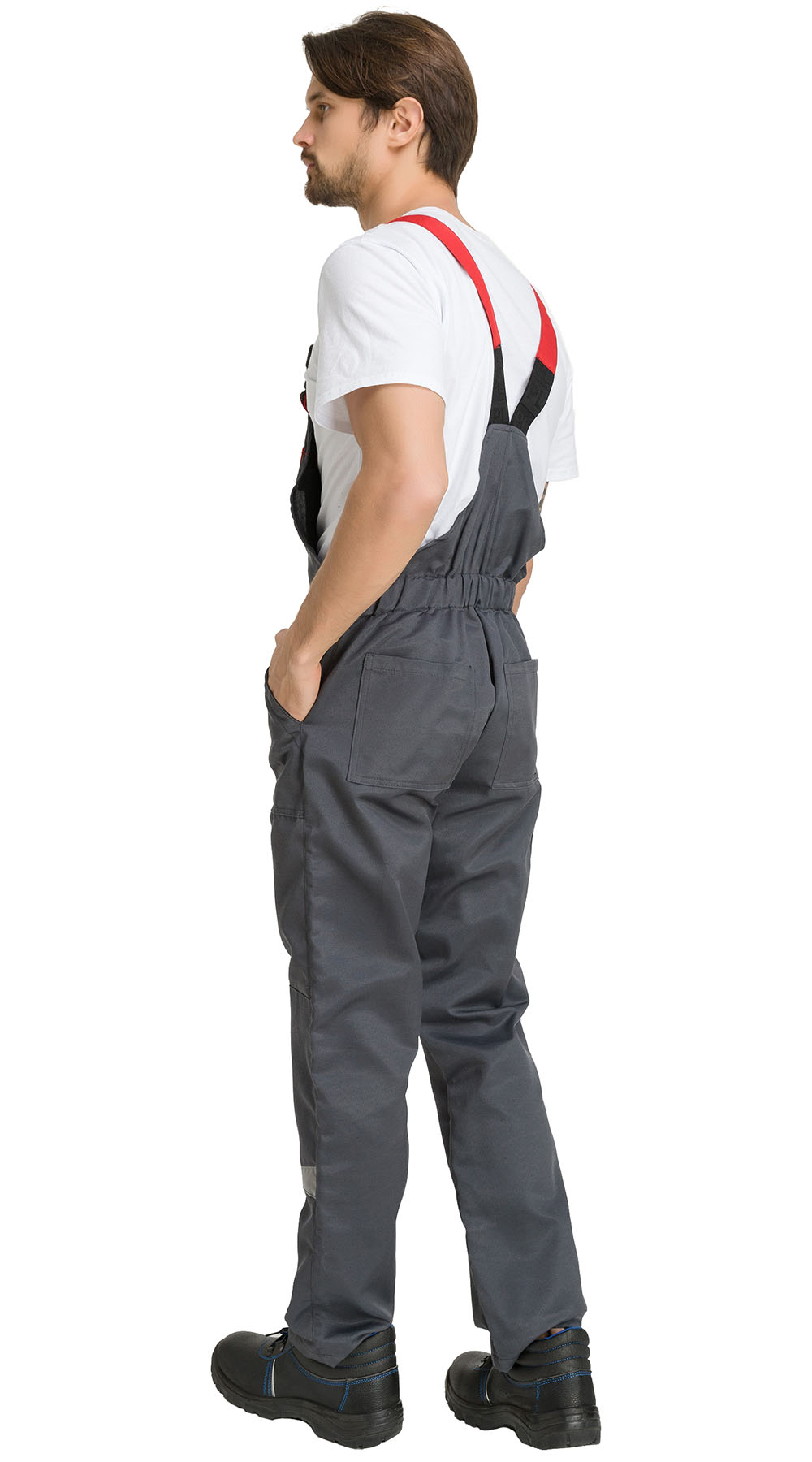 В области колена - усилительные накладки (наколенники) с отделочными элементами из светоотражающей полосы. При этом передние половинки оборудованы накладными карманами с наклонным входом. Задние половинки имеют цельную спинку, обхват по талии регулируется кулисой с эластичной тесьмой;