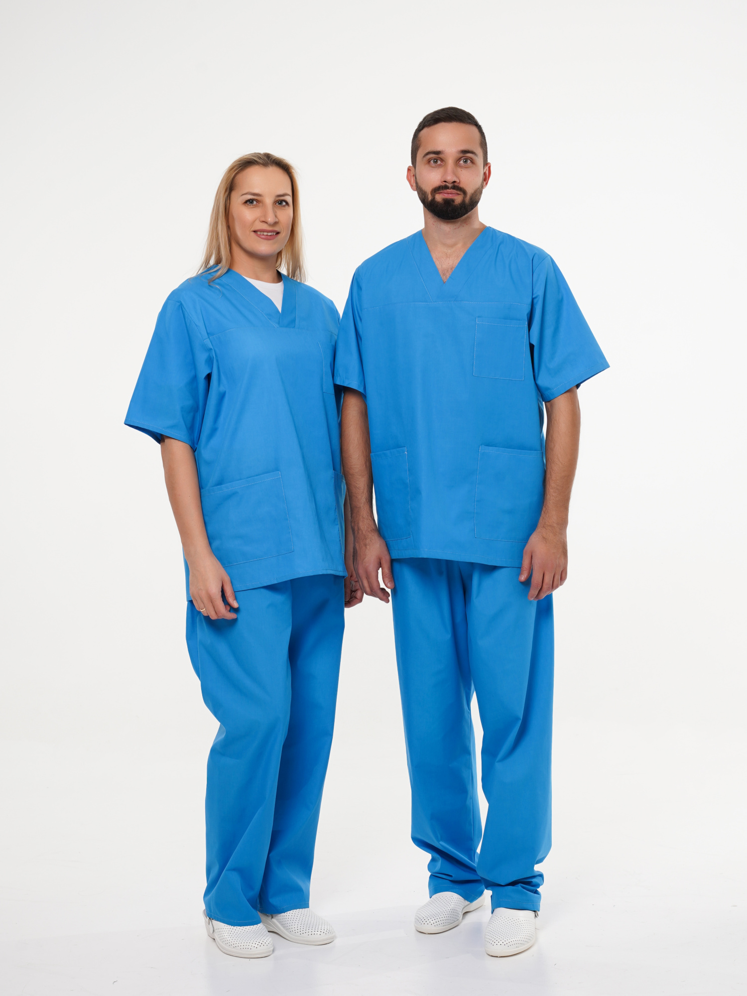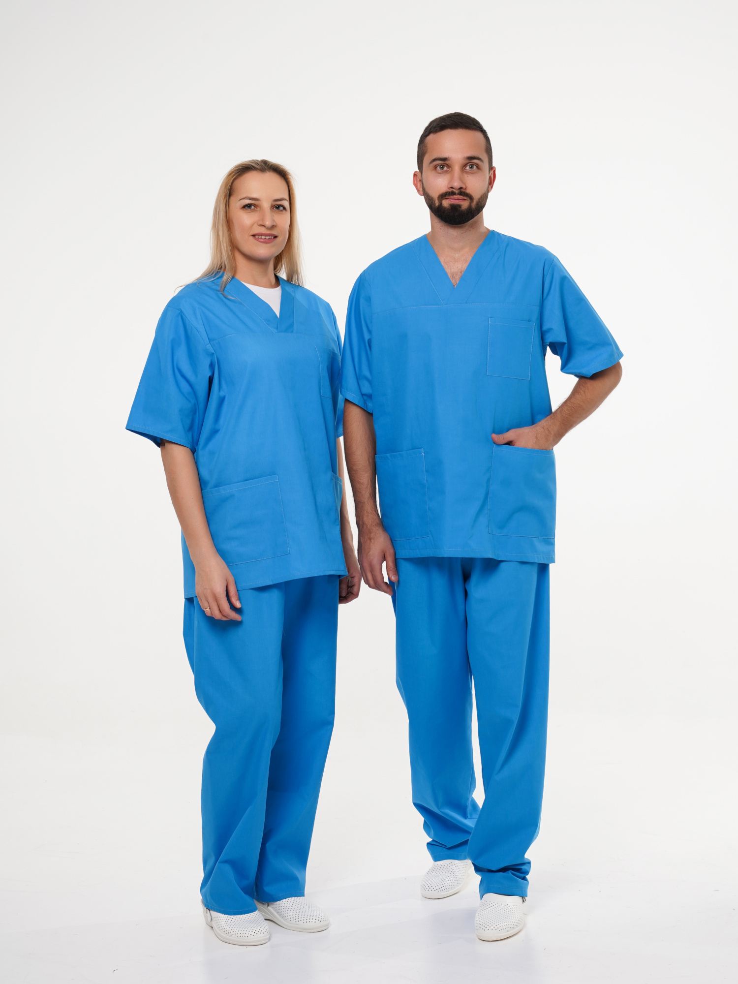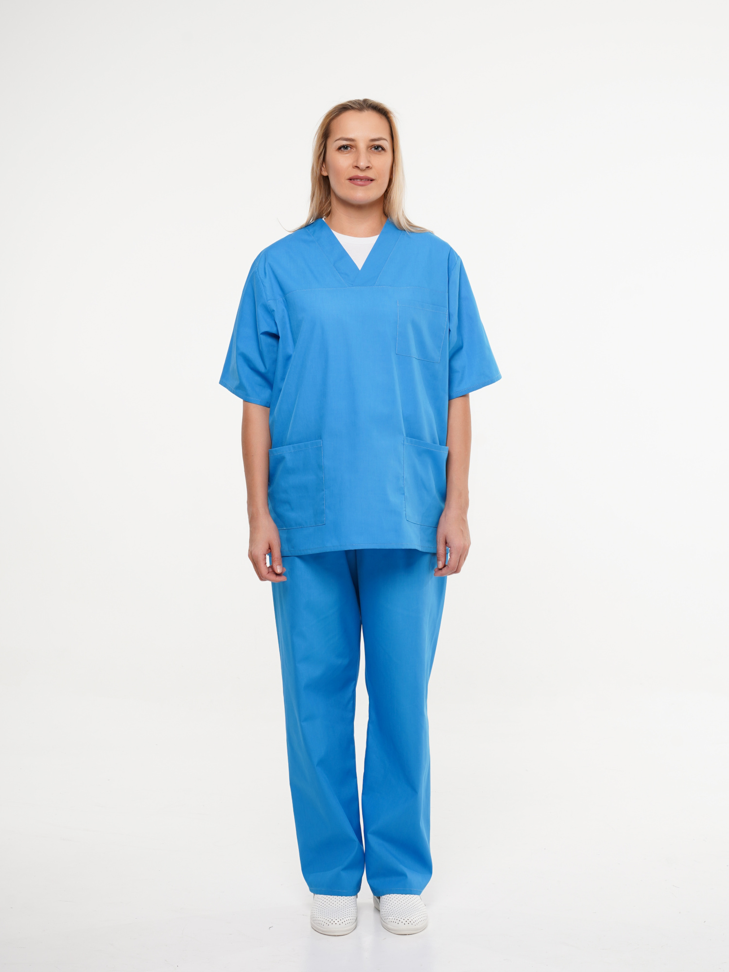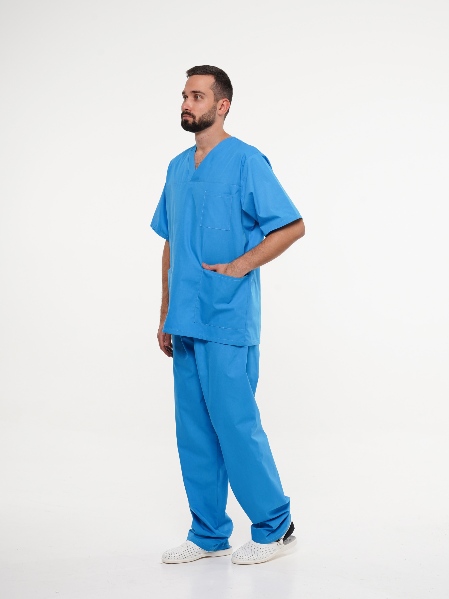 Костюм ХИРУРГ состоит из блузы и брюк. Блуза прямого покроя с V-образным вырезом горловины. На полочке один верхний и два нижних накладных кармана. Рукава короткие. Брюки прямого покроя на резинке.