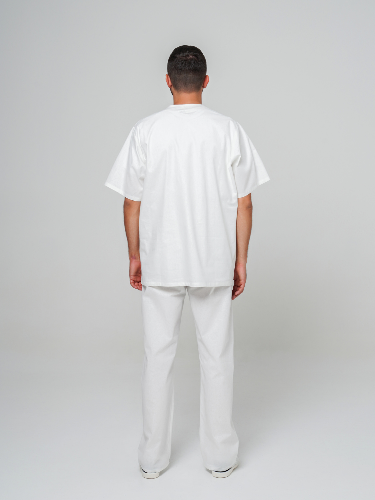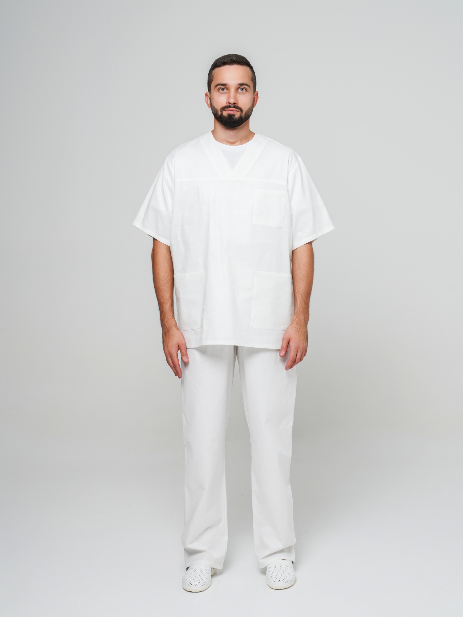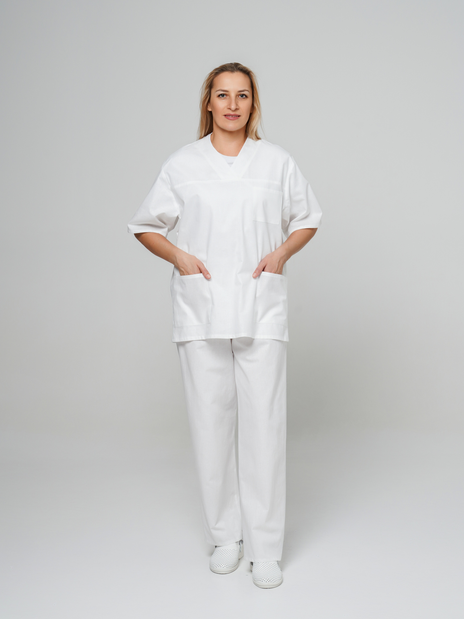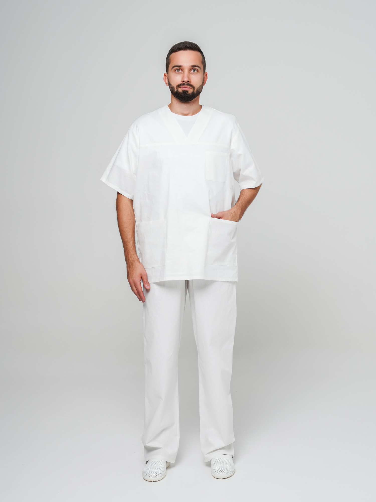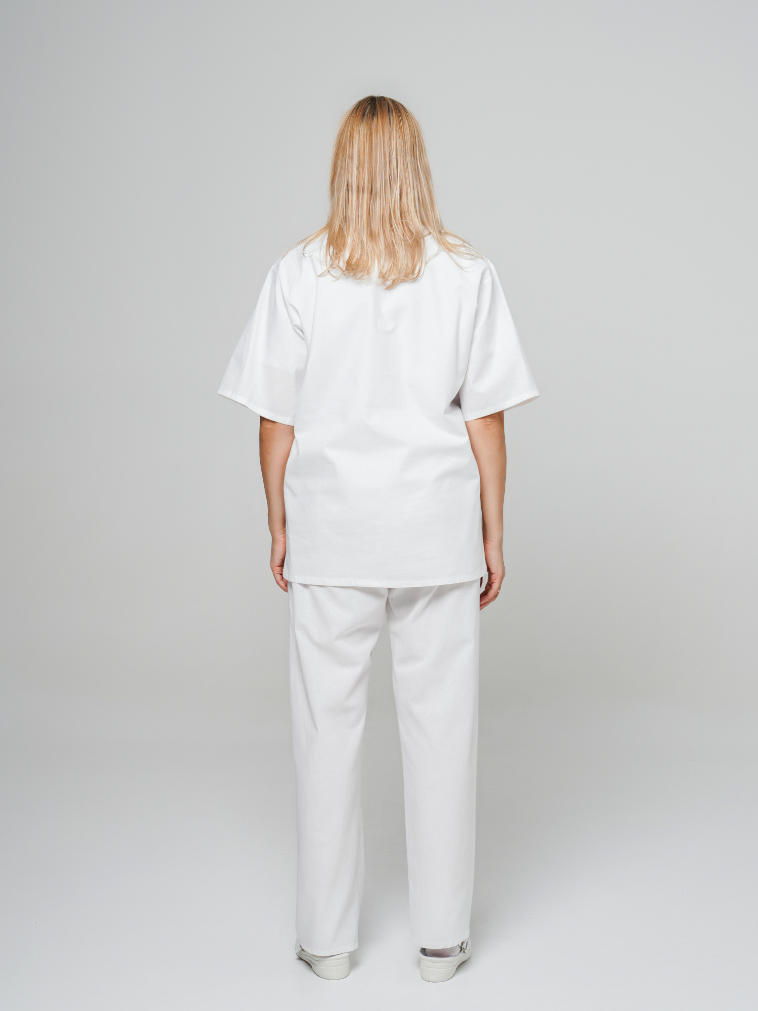 Костюм состоит из блузы и брюк. Блуза с V-образным вырезом горловины, с левым нагрудным карманом и двумя боковыми накладными карманами. Брюки с резинкой в поясе.