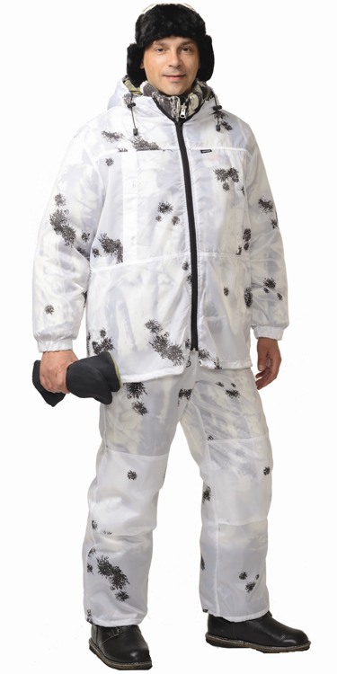 Куртка с центральной застёжкой на "молнию", притачным капюшоном, низ рукавов стянут резинкой, низ куртки по ширине регулируется эластичным шнуром и фиксаторами.Брюки с притачным поясом стянутым резинкой, с боковыми прорезными карманами на "молнии", с наколенниками, низ брюк стягивается эластичным шнуром и фиксаторами.Внешний маскиров. костюм. Тк. ветрозащитная, 100% п/э. ТУ 8550-001-81391241-2008.