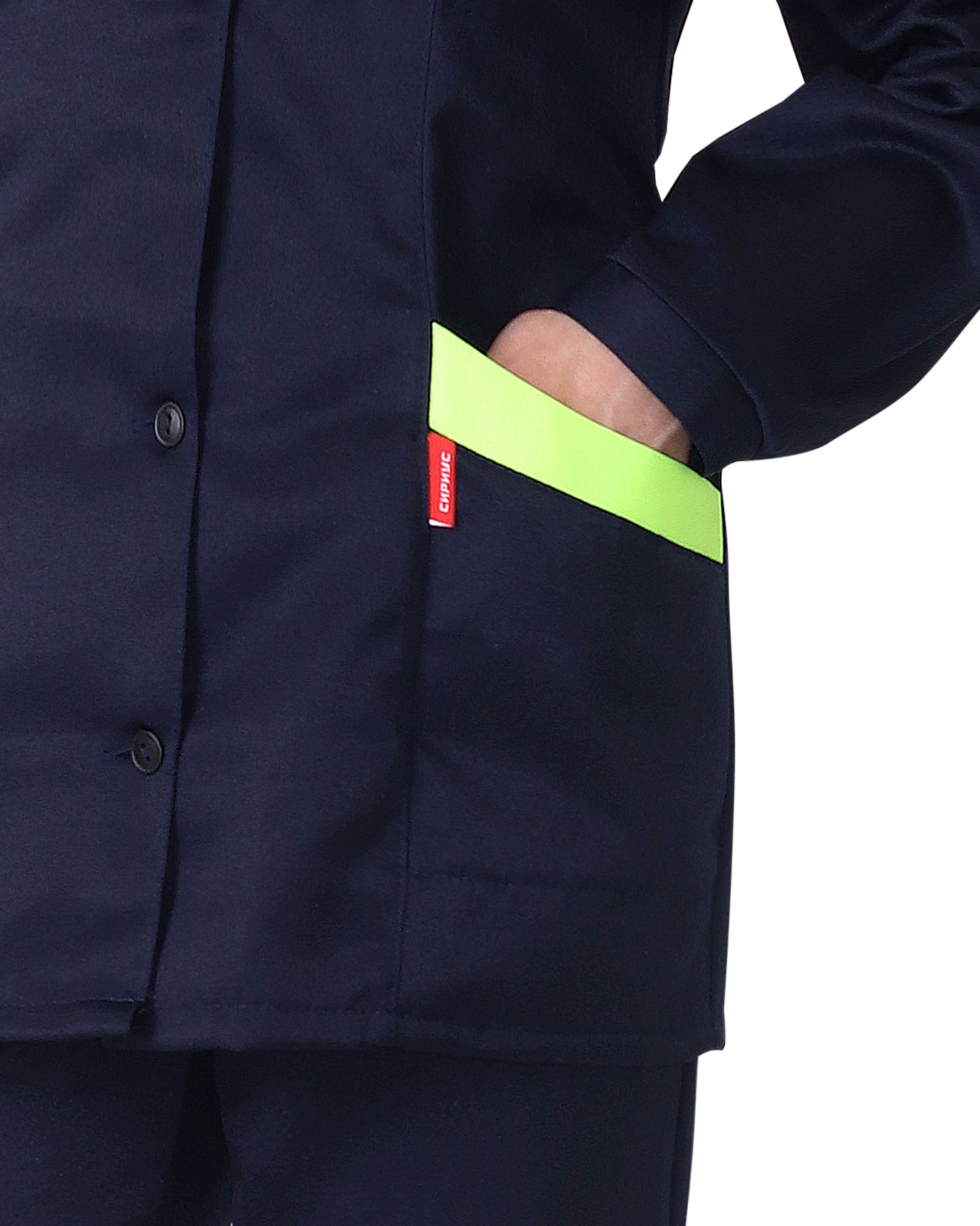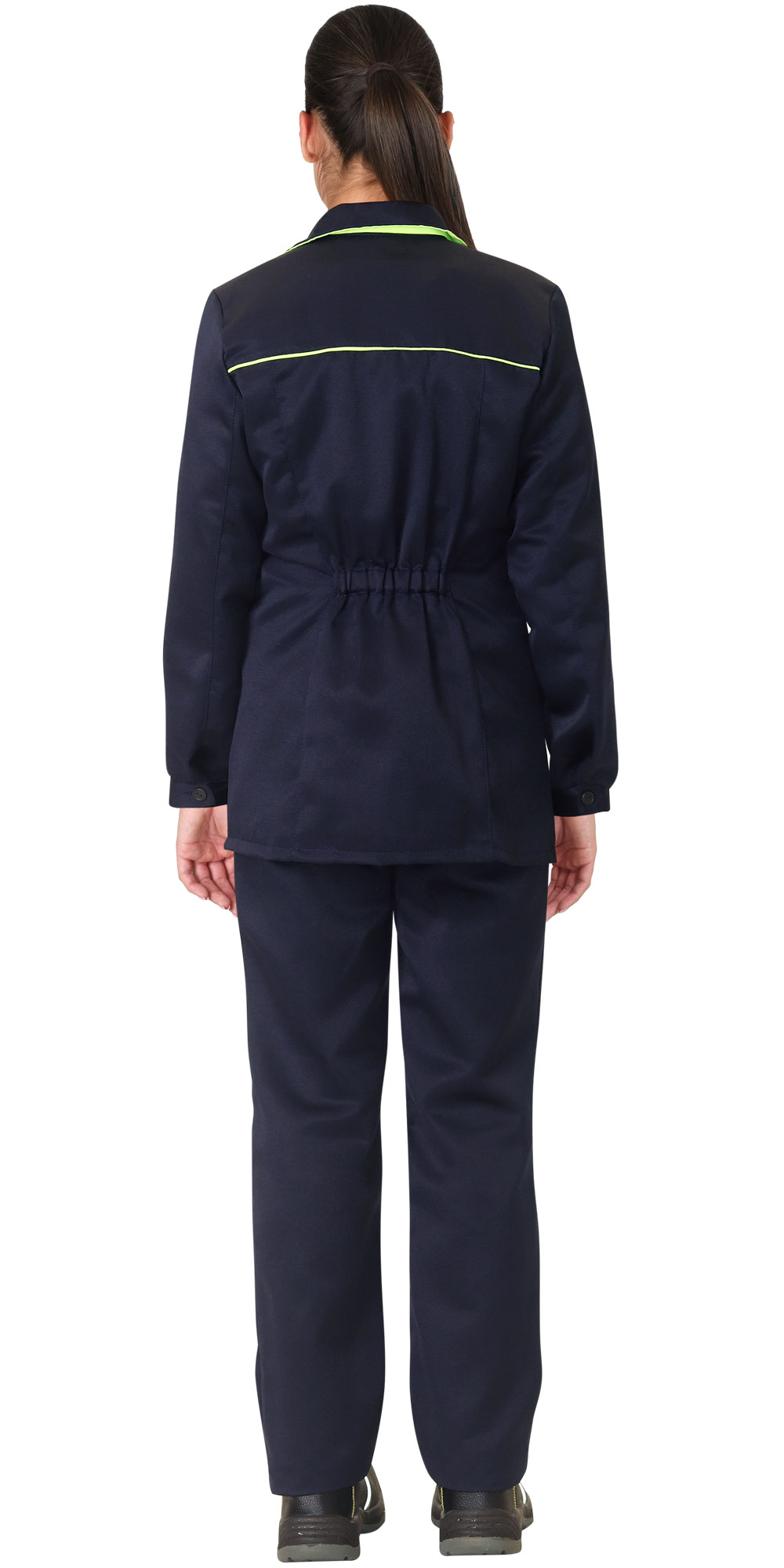 Куртка длинная, с центральной бортовой застежкой на пять петель и 5 пуговиц; с отложным воротником, с нижними накладными карманами. Рукава втачные с манжетами на пуговицах. По средней части спинки в области талии проложена кулиска с эластичной тесьмой для прилегания. Брюки с притачным поясом, застёгивающимся на 1 петлю и пуговицу, с застёжкой гульфика на молнию, с 5 шлёвками на поясе, с талевыми выточками на задних половинках, накладными боковыми карманами на передних половинках брюк. Пояс по бокам с эластичной тесьмой. ГОСТ 12.4.280-2014