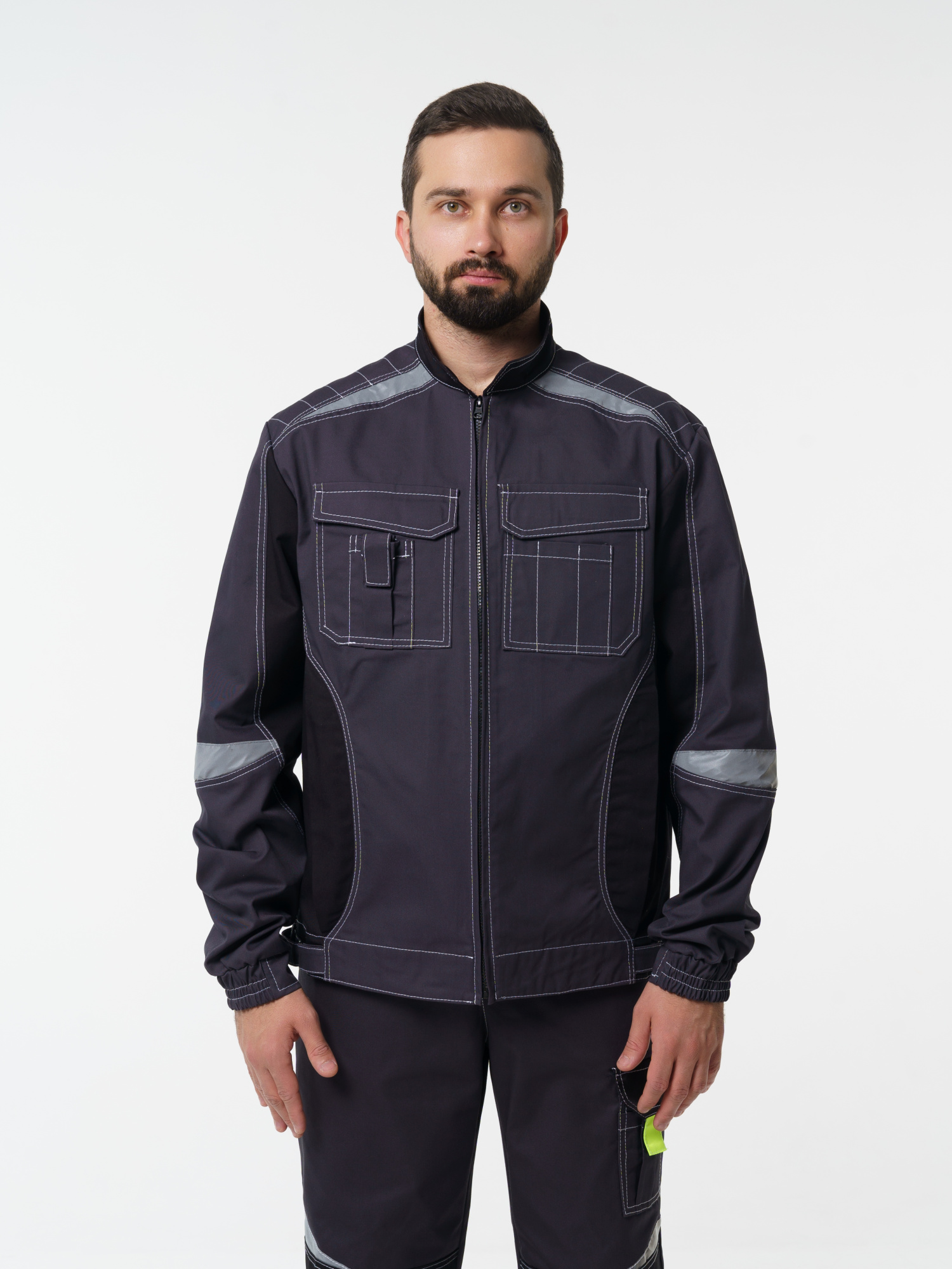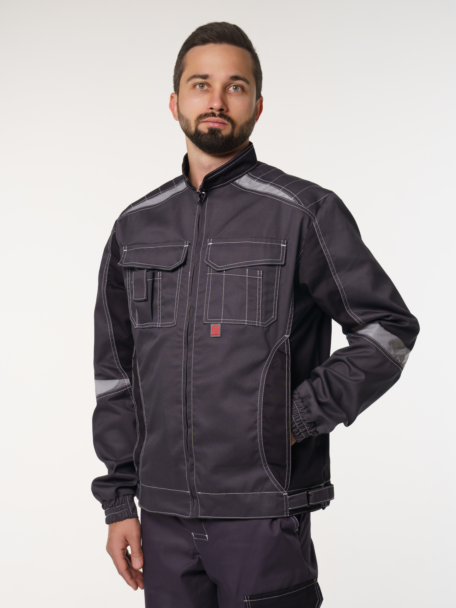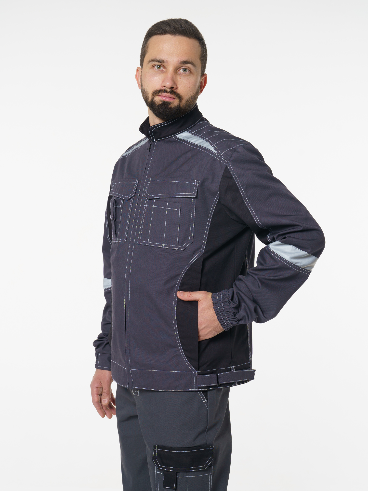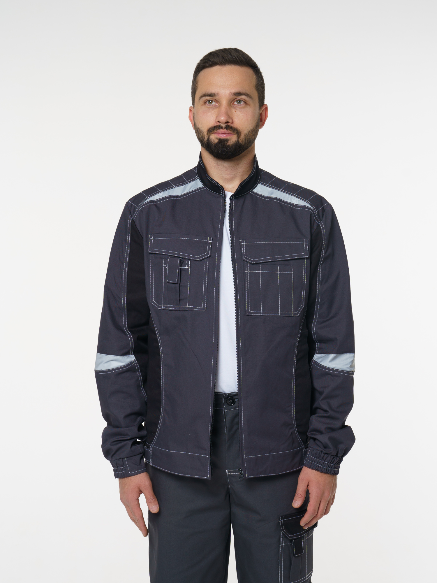 Куртка прямого силуэта; короткая; воротник стойка; с центральной застёжкой на молнию; с верхними фигурными карманами с фигурными клапанами; низ регулируется при помощи хлястиков с полукольцами. На куртке есть СВ элементы.