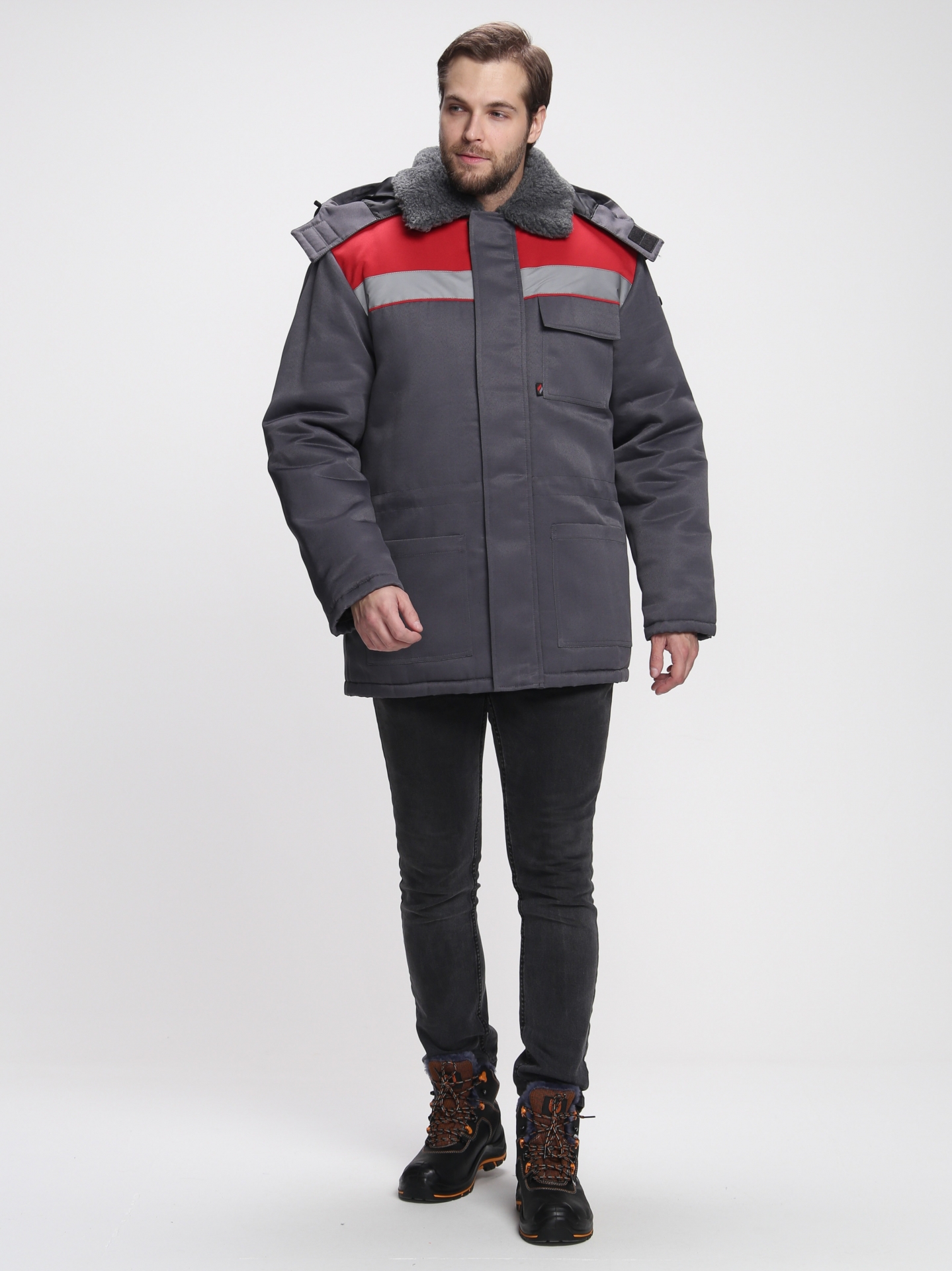 Куртка зимняя Бригада NEW (тк.Смесовая,210), т.серый/красный (ЧЗ) (128-132/170-176)