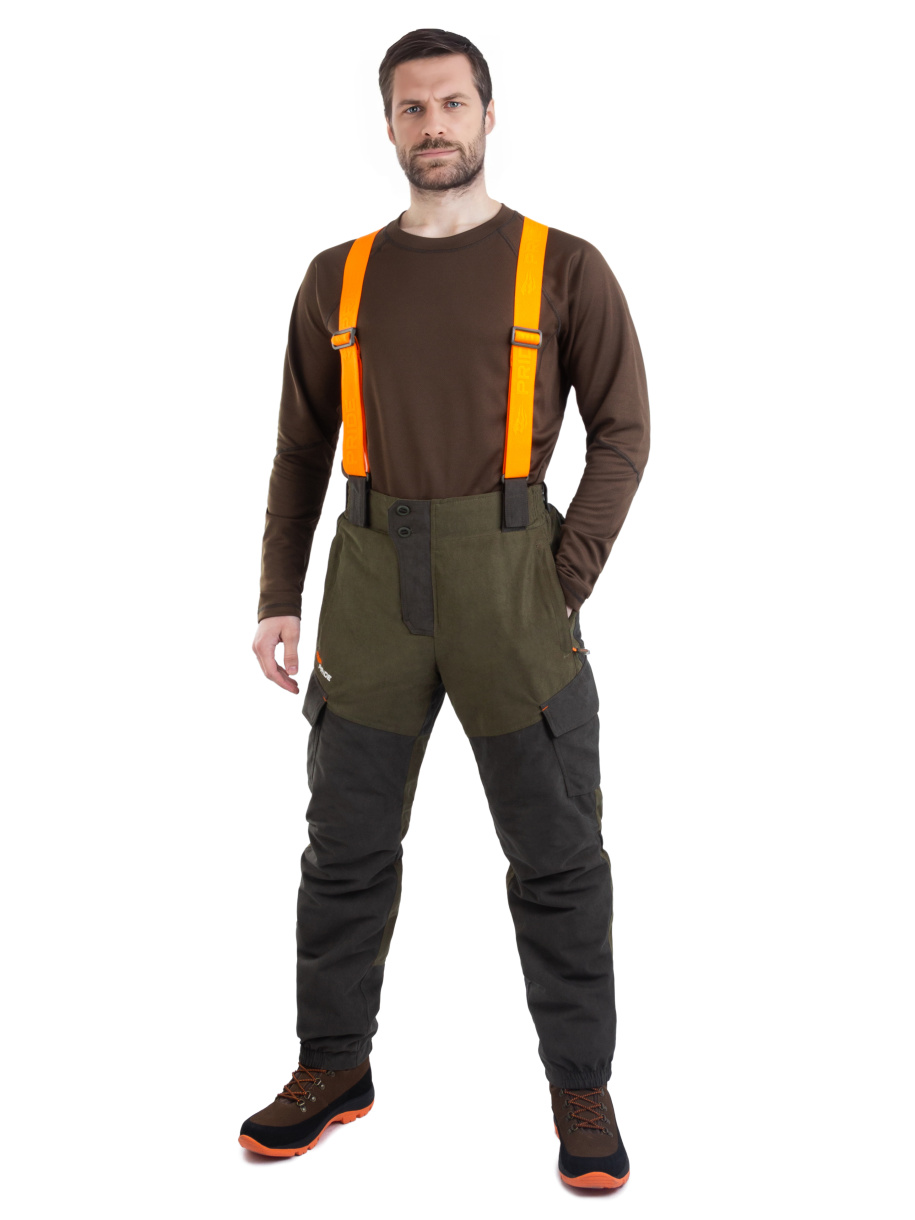 Брюки на широком поясе со шлевками для ремня. Съемные подтяжки. 4 кармана. 2 на влагозащитных молниях в верхней части брюк и 2 объемных  в области бедер. Эластичные кулисы под коленом и низу брюк для защиты от проникновения холодного воздуха.