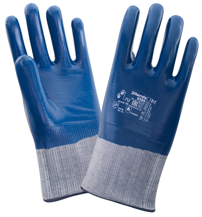 Перчатки с тяжелым нитриловым покрытием и универсальным манжетом безопасности 2Hands 6595 . Многокомпонентная бесшовная основа из полиэстера и нейлона плотности 13G и 15G и разного веса с полным нитриловым покрытием.