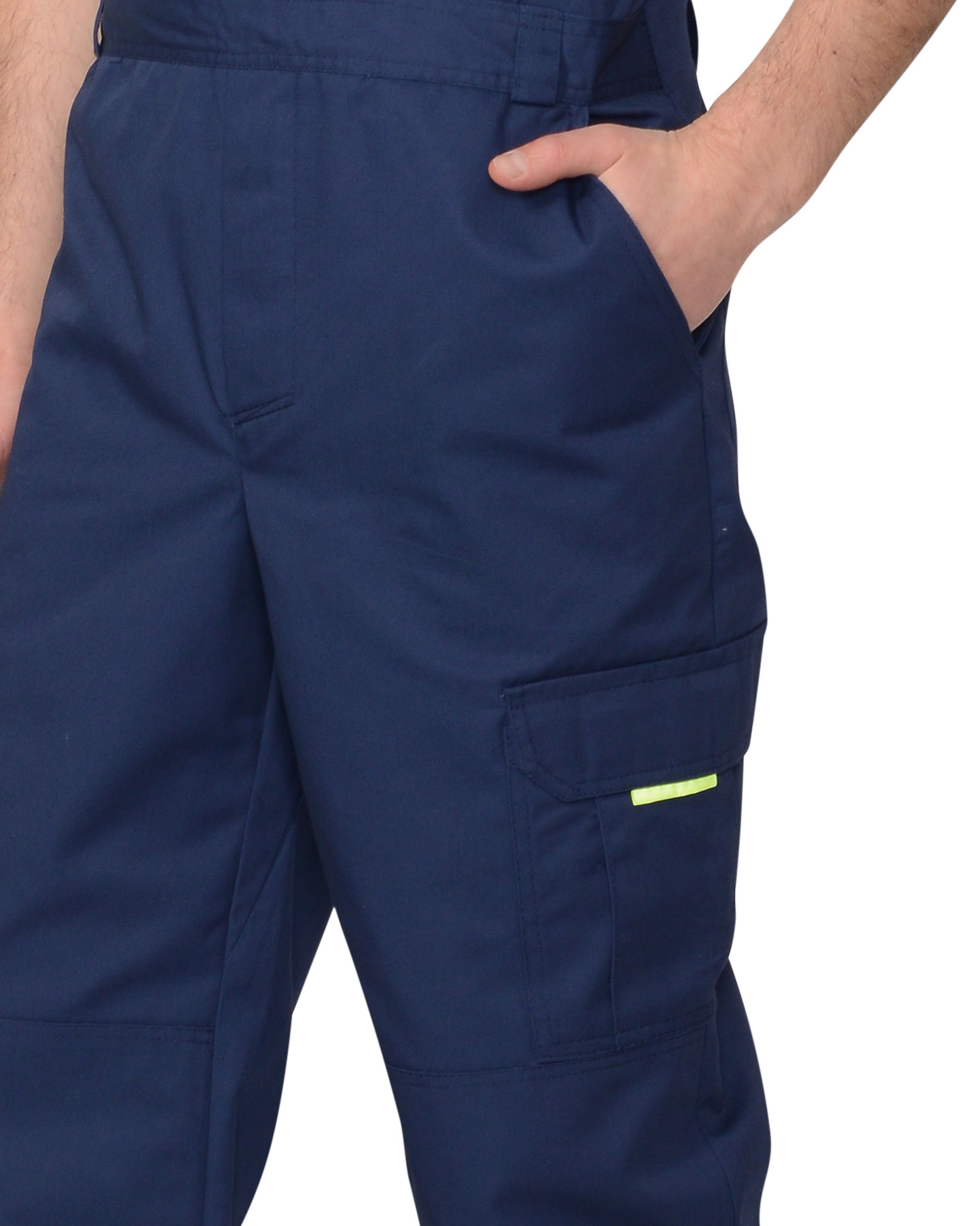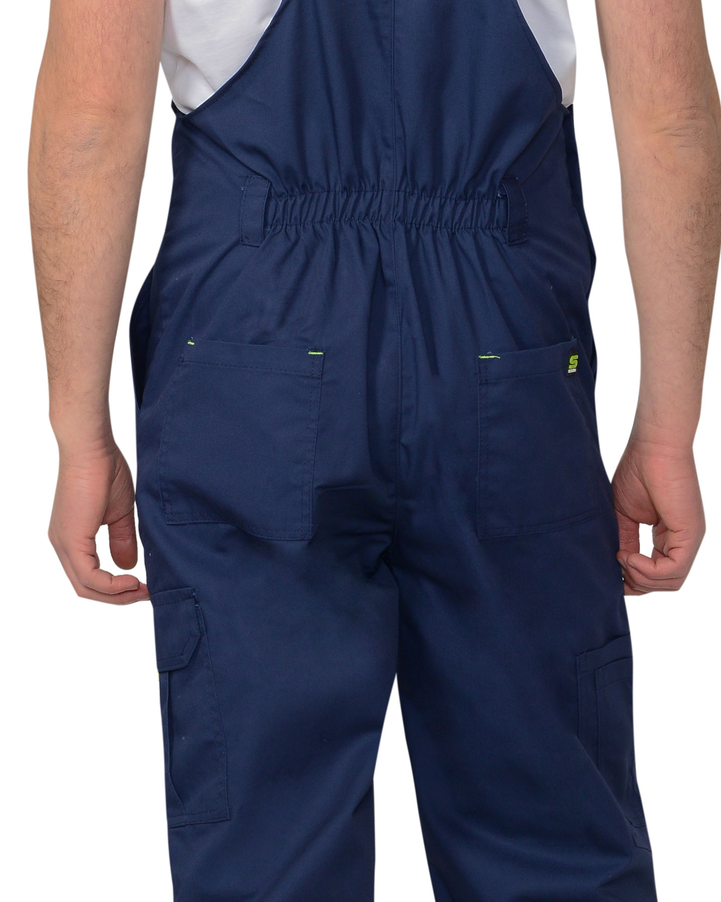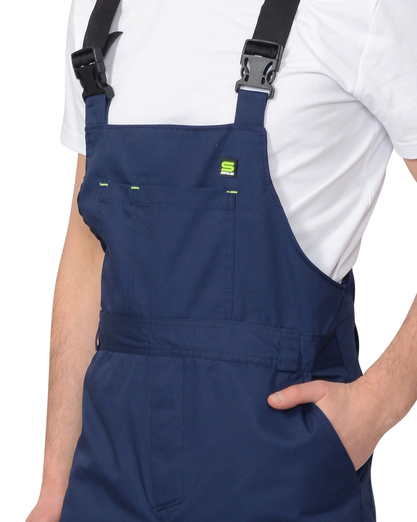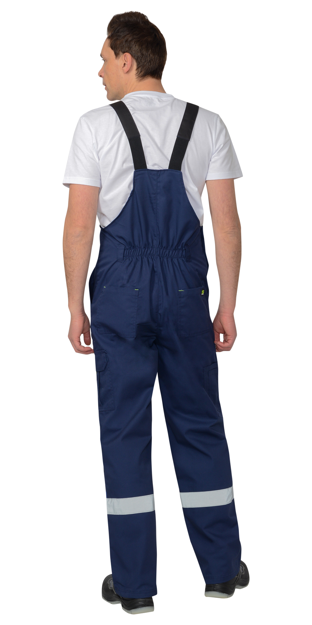 Полукомбинезон с застёжкой гульфика и застёжкой в правом боковом шве на пуговицы, верхним накладным карманом и нижними внутренними боковыми карманами, с наколенниками, с накладным карманом на левом боковом шве с клапаном на липучке, с патой, с двумя задними и карманами для инструментов, по спинке вставлена резинка.