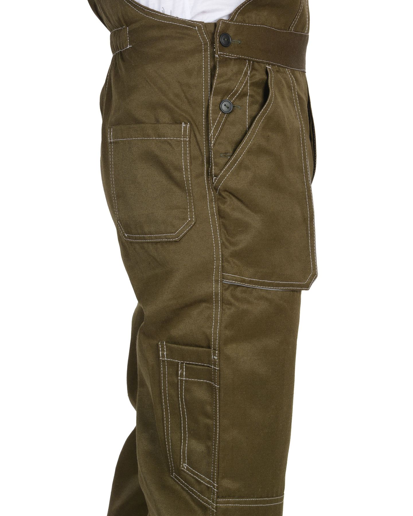 Полукомбинезон - прямой с контрастной отделкой, с бретелями, с застёжкой спереди и с застёжкой в правом боковом шве на три петли и три пуговицы. Полукомбинезон с различными многофункциональными карманами, спинка с частичной стяжкой по талии для лучшего прилегания по фигуре.