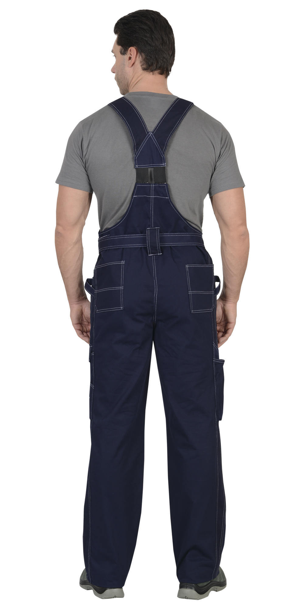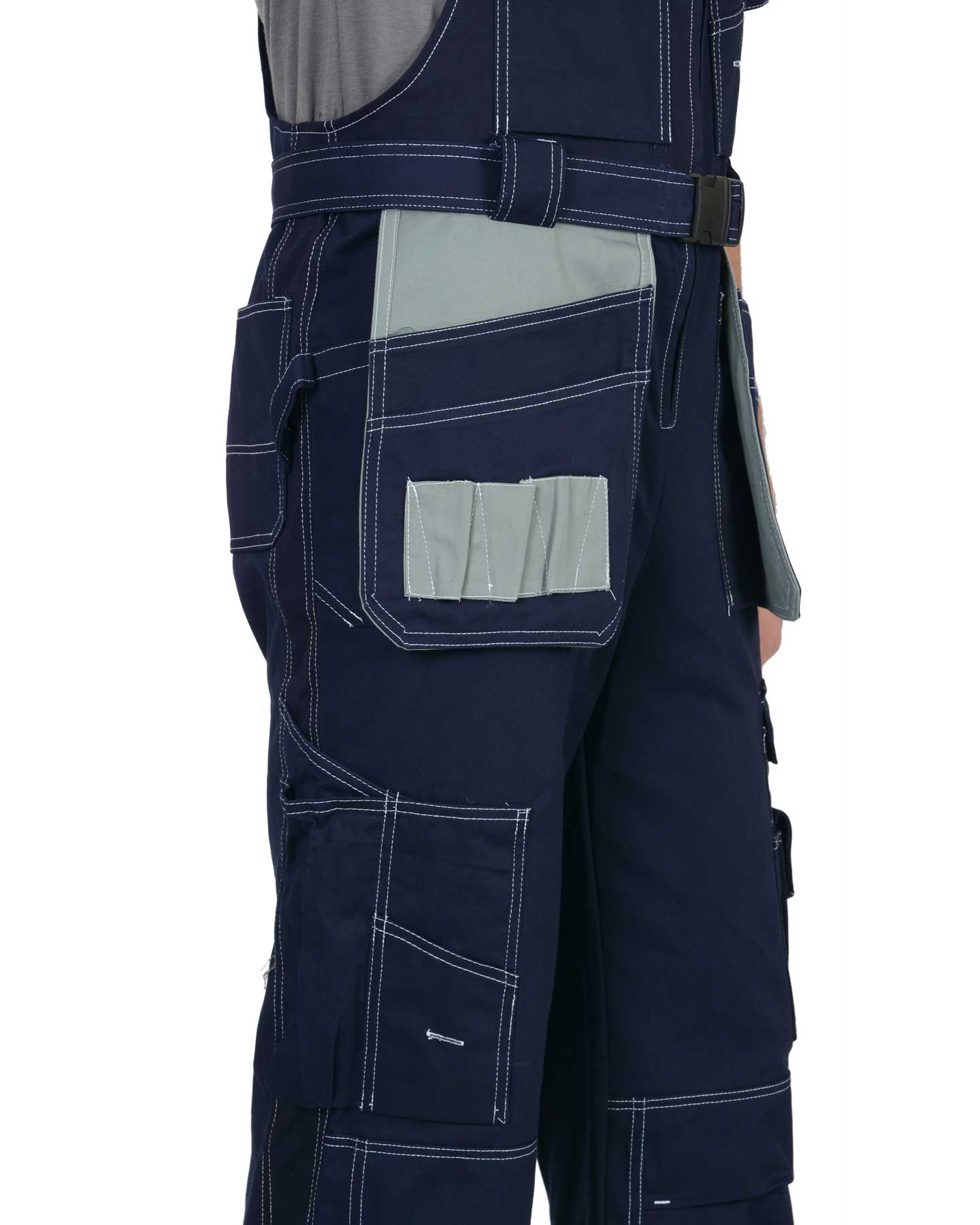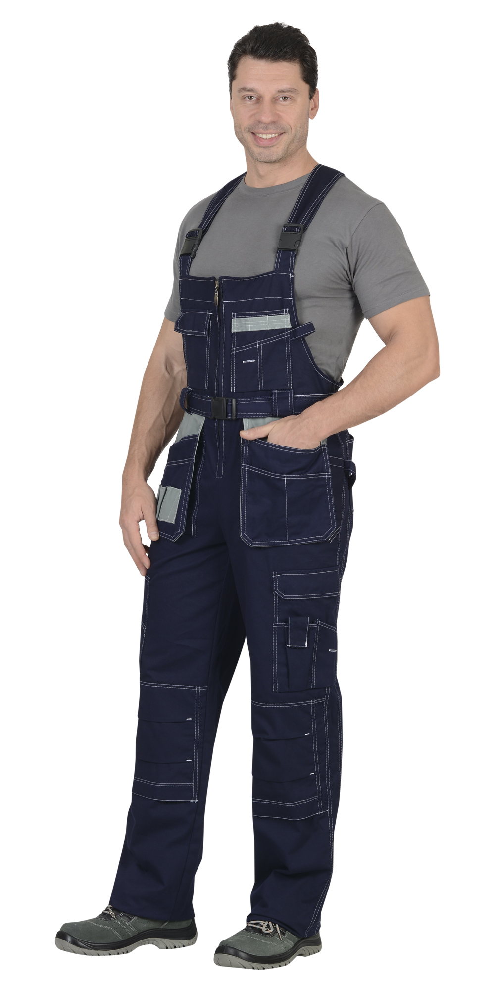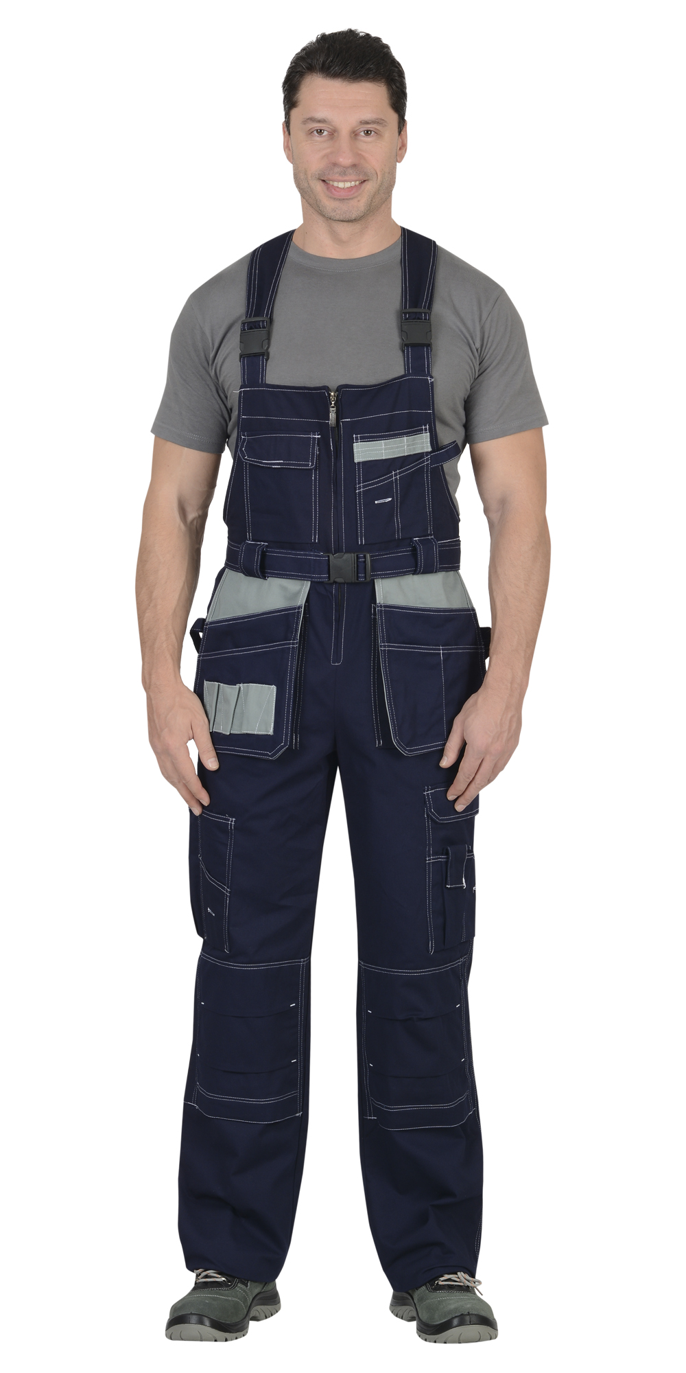 Полукомбинезон с центральной застежкой-молнией, с накладными и отлетными боковыми карманами и с нижними карманами, переходящими на задние половинки. Объемные за счет защипов наколенники-карманы, застегиваются на липучки. ГОСТ 12.4.280-2014.