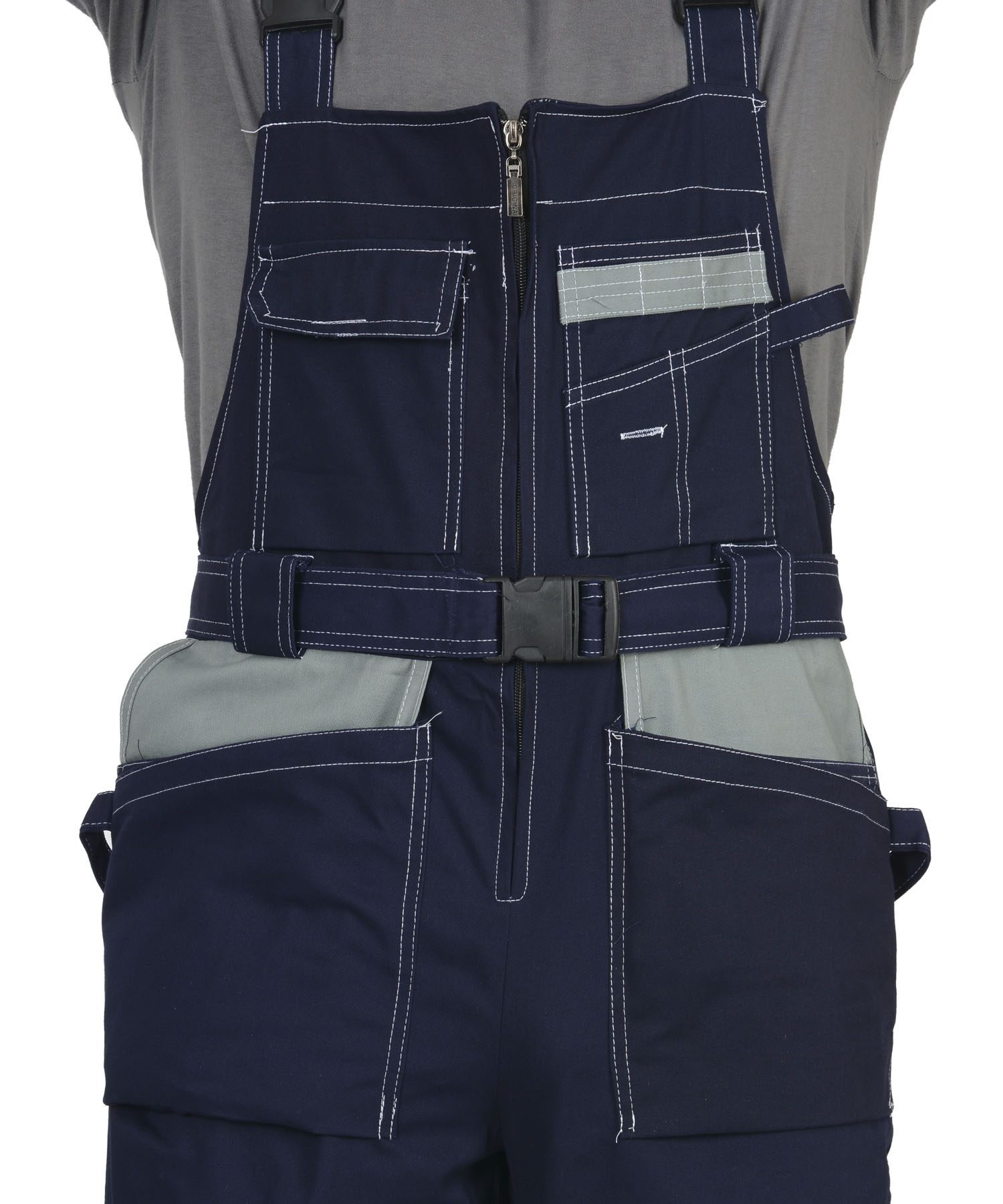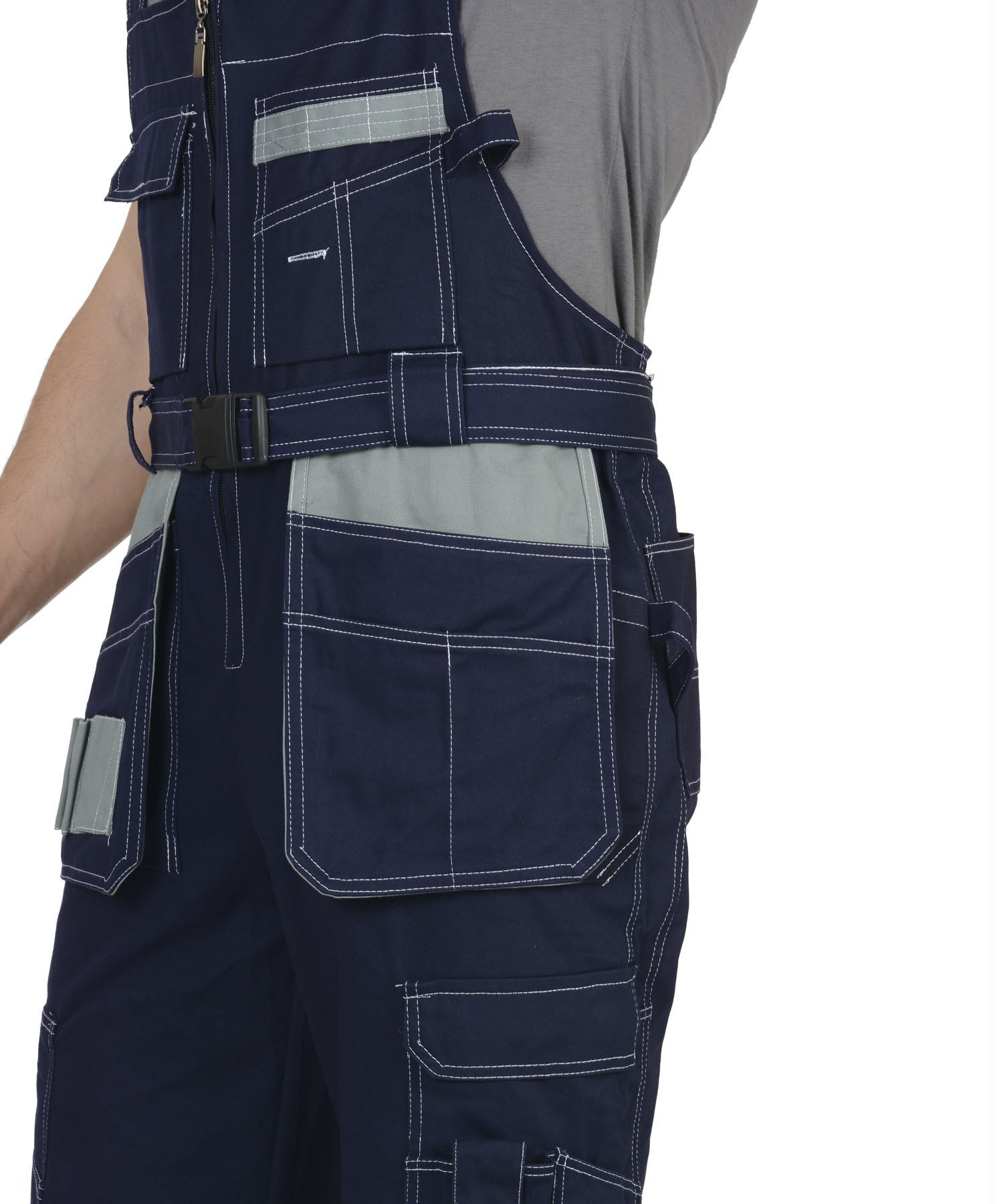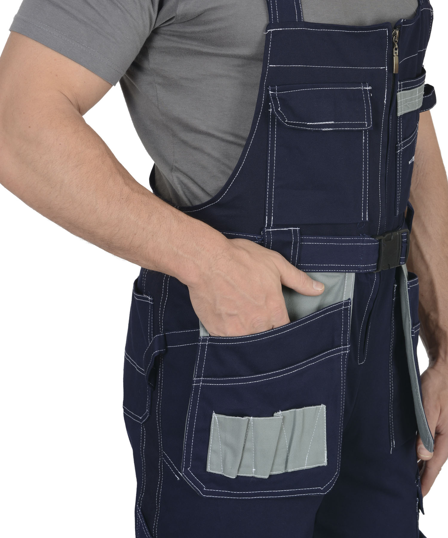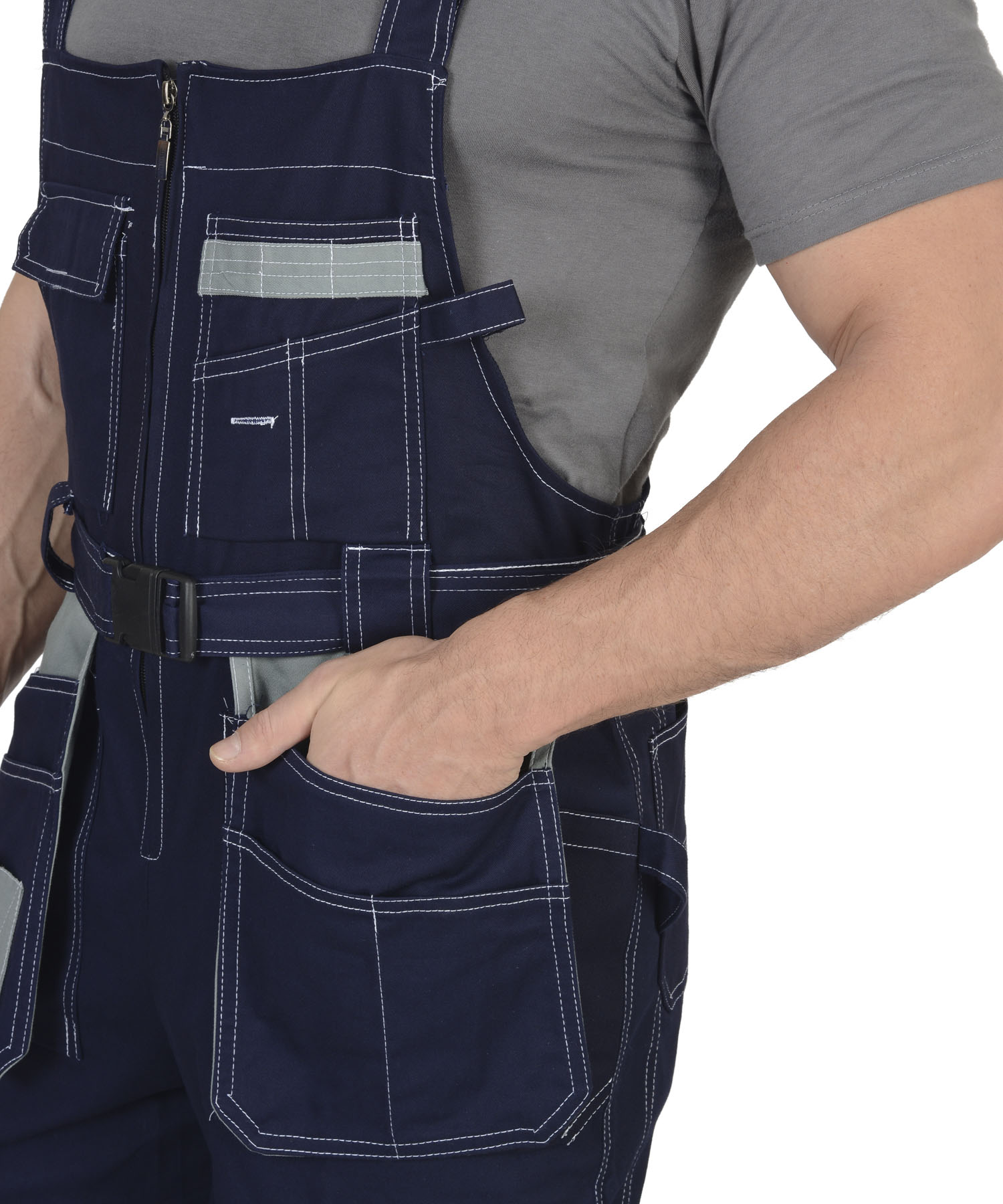 Полукомбинезон с центральной застежкой-молнией, с накладными и отлетными боковыми карманами и с нижними карманами, переходящими на задние половинки. Объемные за счет защипов наколенники-карманы, застегиваются на липучки. ГОСТ 12.4.280-2014.