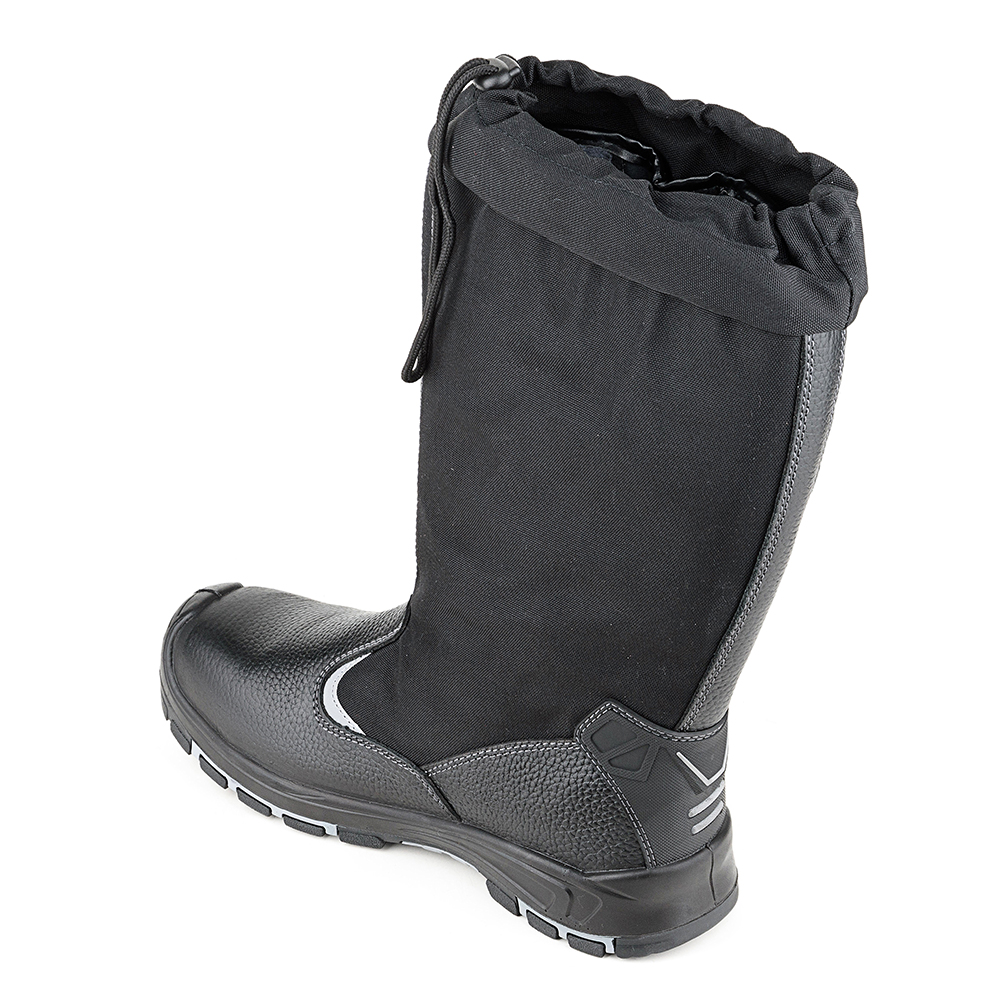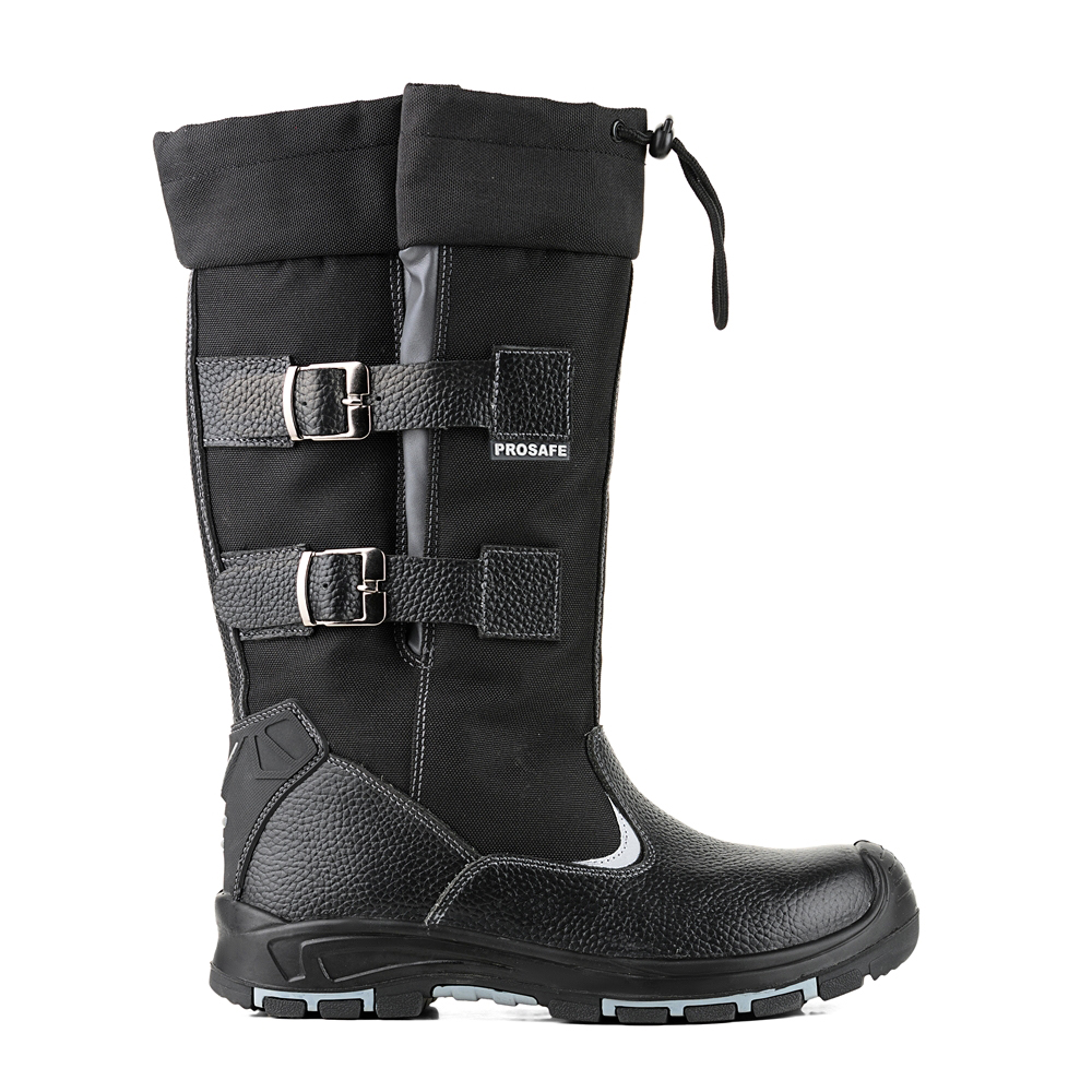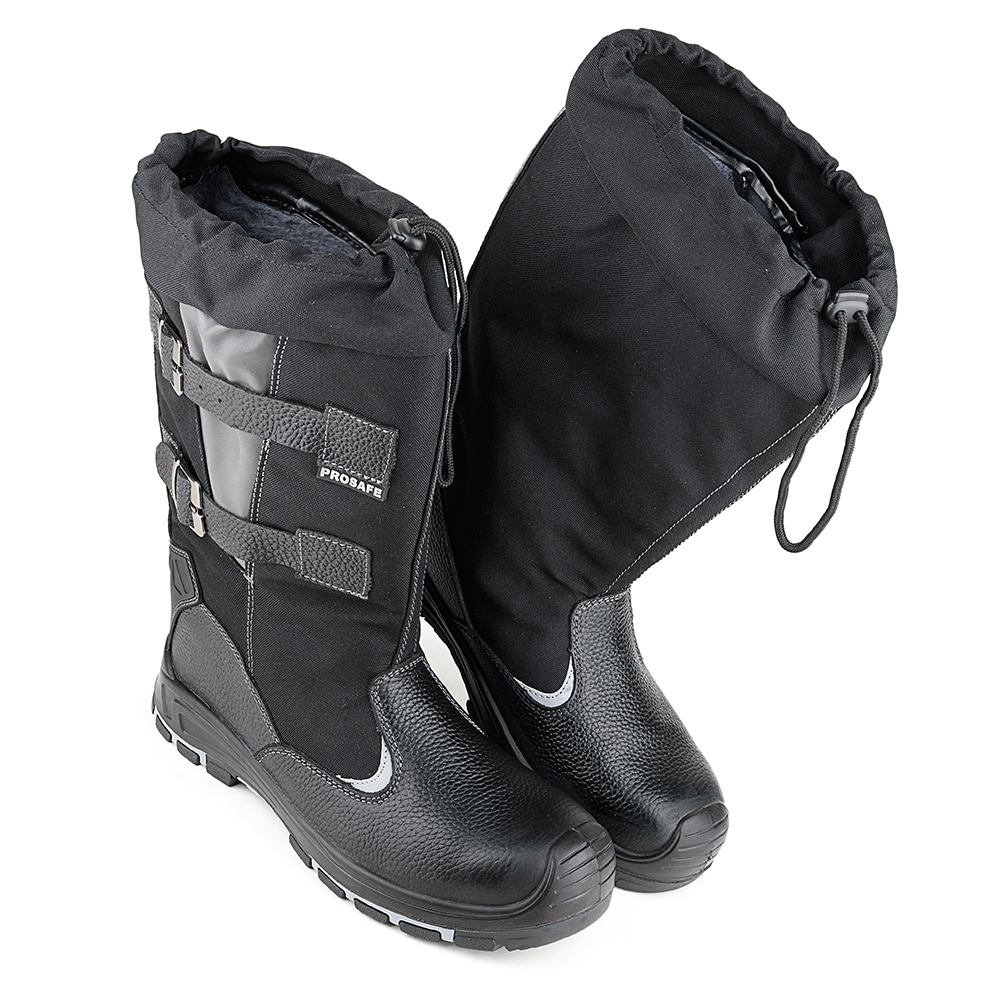 Сапоги Prosafe серии profi изготовлены из натуральной кожи в комбинации с водоотталкивающим текстильным голенищем 900D, светоотражающимим элементами и защитной накладкой в пяточной части на подкладке–дуплекс, состоящей из шерстина с содержанием натуральной овечьей шерсти- 50% и плотностью 900 гр., дублированного с фольгированным полотном, позволяющим сохранить тепло внутри сапога длительное время. В модели предусмотрена вкладная стелька из шерстина. Голенище регулируется и фиксируется на ноге с помощью двух ремней с металлическими пряжками. Подошва- двухслойная, маслобензостойкая, литьевого метода крепления. Промежуточный слой изготовлен из ПУ с внутренней амортизирующей вставкой в пяточной части подошвы, способной гасить ударные нагрузки при ходьбе. Ходовой нижний слой изготовлен из износостойкого, термостойкого нитрила, который способен защитить стопу от кратковременного контакта подошвы с нагретой поверхностью до 300°С. Композитный подносок ударной прочностью 200Дж обеспечивает защиту пальцев стопы.