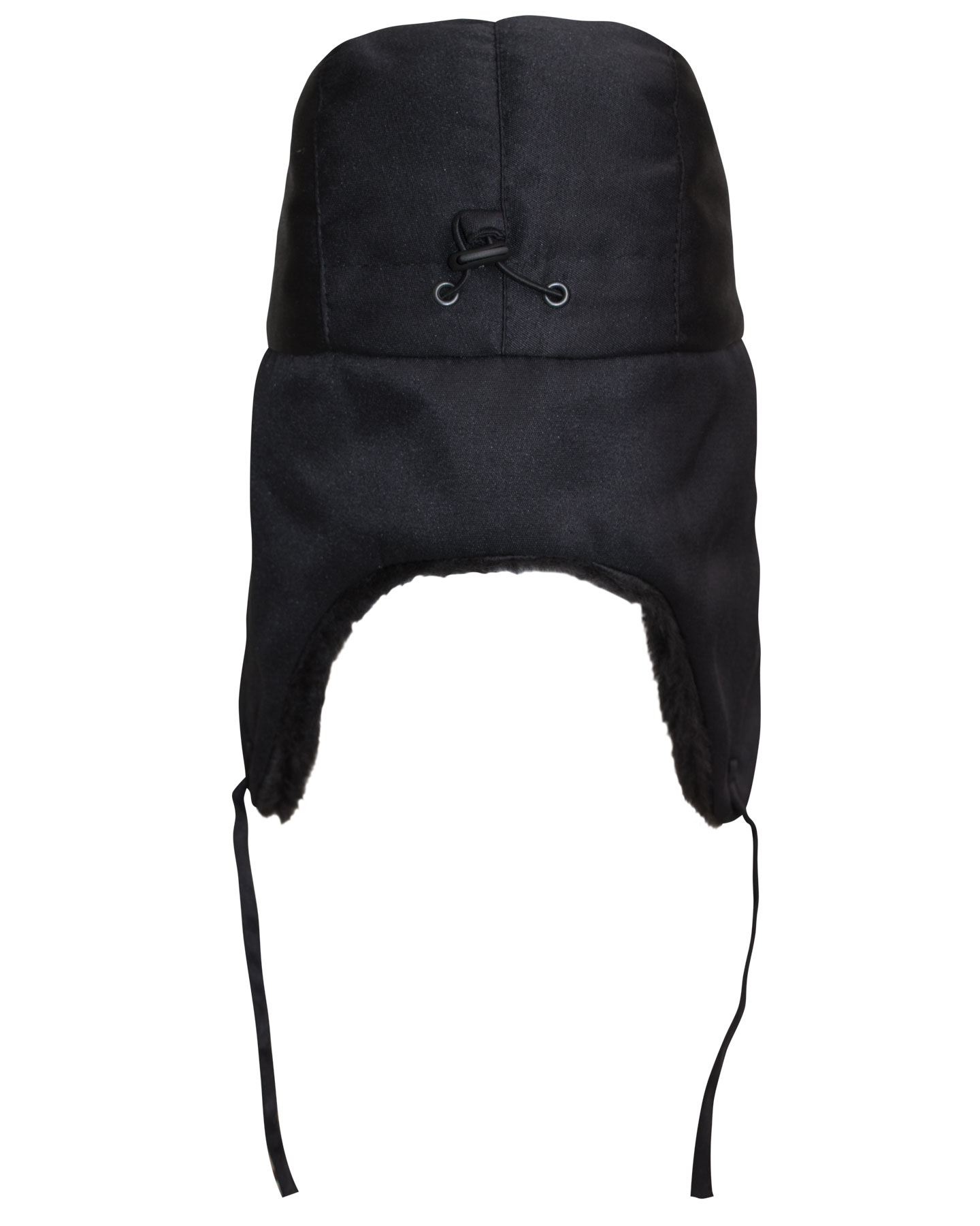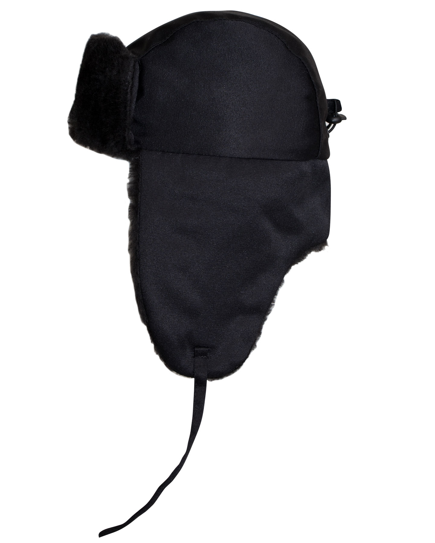 Шапка-ушанка зимняя черная с искусственным мехом черного цвета. В затылочной части объем регулируется за счет резинки и фиксатора.