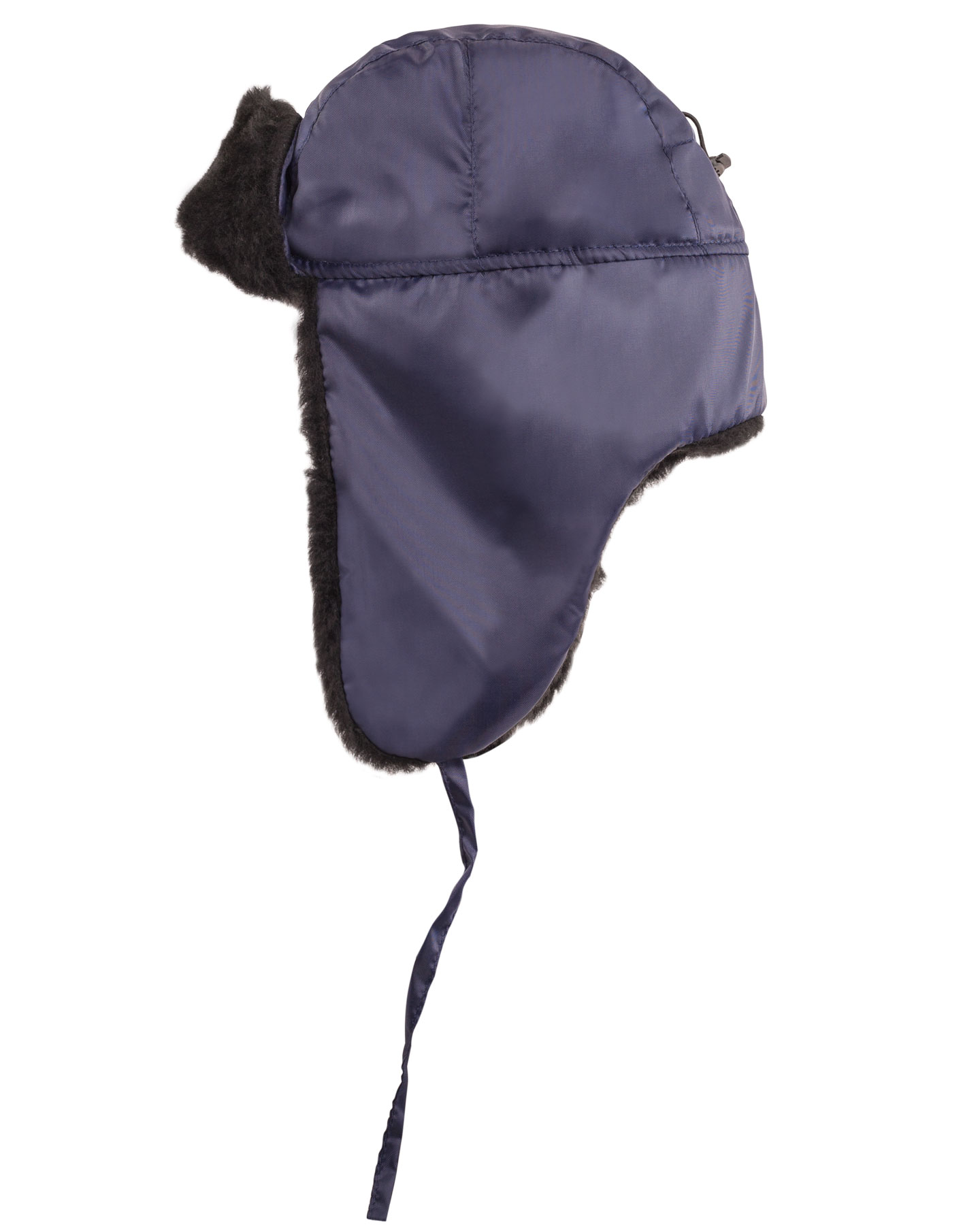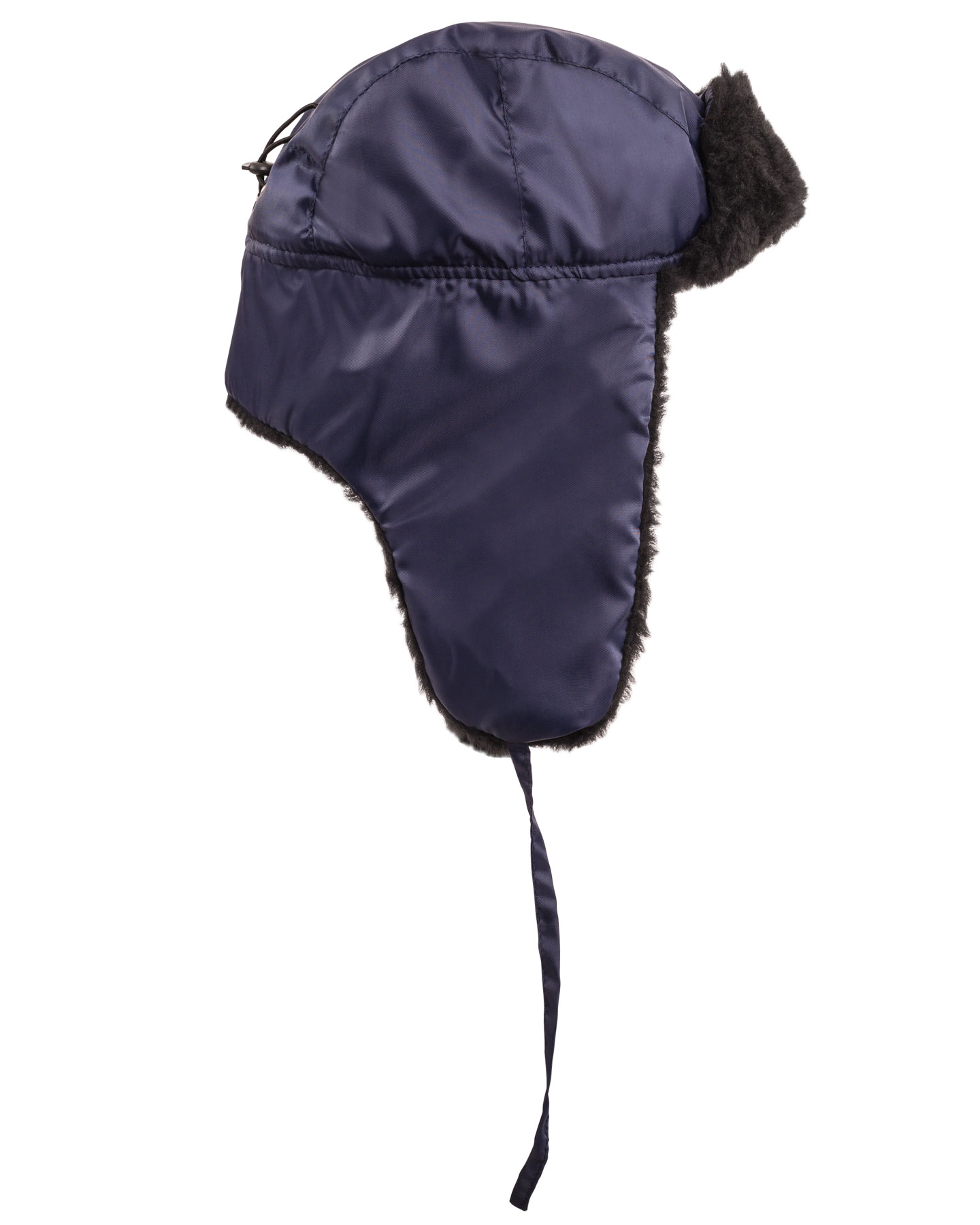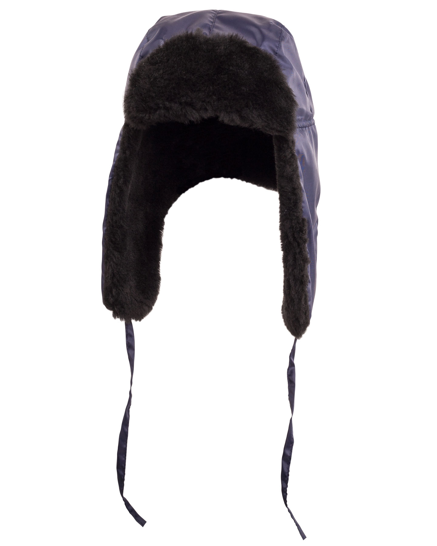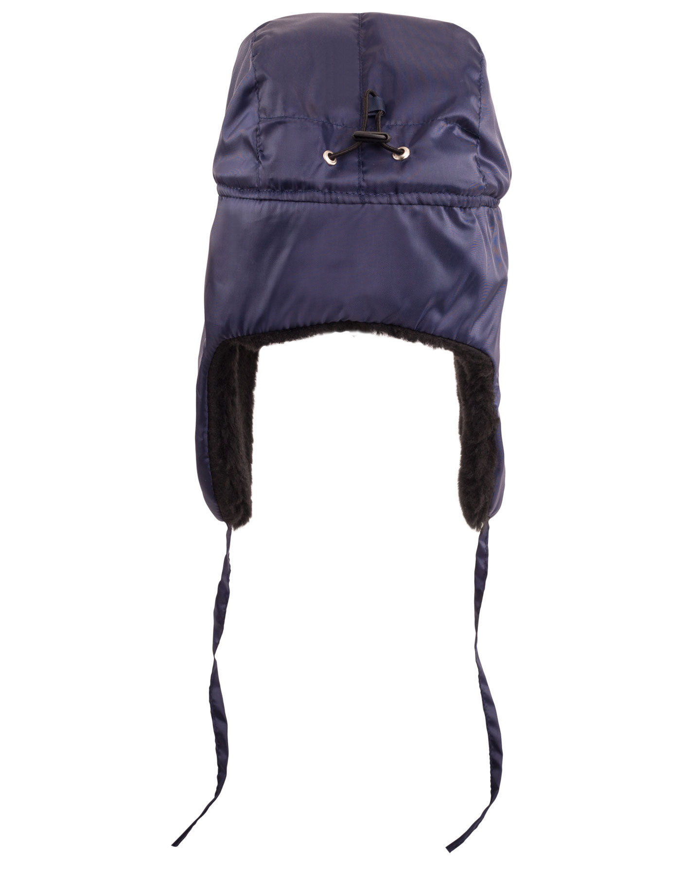 Шапка-ушанка зимняя темно-синяя с искусственным мехом черного цвета. В затылочной части объем регулируется за счет резинки и фиксатора.